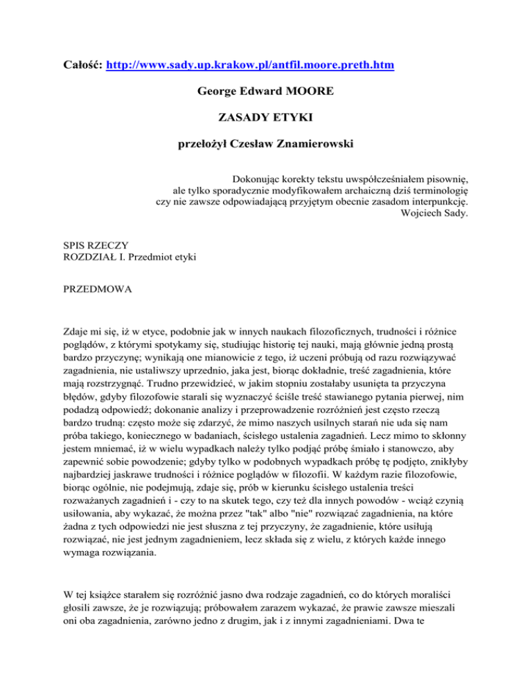 Całość: http://www.sady.up.krakow.pl/antfil.moore.preth.htm George Edward MOORE ZASADY ETYKI przełożył Czesław Znamierowski Dokonując korekty tekstu uwspółcześniałem pisownię, ale tylko sporadycznie modyfikowałem archaiczną dziś terminologię czy nie zawsze odpowiadającą przyjętym obecnie zasadom interpunkcję. Wojciech Sady. SPIS RZECZY ROZDZIAŁ I. Przedmiot etyki PRZEDMOWA Zdaje mi się, iż w etyce, podobnie jak w innych naukach filozoficznych, trudności i różnice poglądów, z którymi spotykamy się, studiując historię tej nauki, mają głównie jedną prostą bardzo przyczynę; wynikają one mianowicie z tego, iż uczeni próbują od razu rozwiązywać zagadnienia, nie ustaliwszy uprzednio, jaka jest, biorąc dokładnie, treść zagadnienia, które mają rozstrzygnąć. Trudno przewidzieć, w jakim stopniu zostałaby usunięta ta przyczyna błędów, gdyby filozofowie starali się wyznaczyć ściśle treść stawianego pytania pierwej, nim podadzą odpowiedź; dokonanie analizy i przeprowadzenie rozróżnień jest często rzeczą bardzo trudną: często może się zdarzyć, że mimo naszych usilnych starań nie uda się nam próba takiego, koniecznego w badaniach, ścisłego ustalenia zagadnień. Lecz mimo to skłonny jestem mniemać, iż w wielu wypadkach należy tylko podjąć próbę śmiało i stanowczo, aby zapewnić sobie powodzenie; gdyby tylko w podobnych wypadkach próbę tę podjęto, znikłyby najbardziej jaskrawe trudności i różnice poglądów w filozofii. W każdym razie filozofowie, biorąc ogólnie, nie podejmują, zdaje się, prób w kierunku ścisłego ustalenia treści rozważanych zagadnień i - czy to na skutek tego, czy też dla innych powodów - wciąż czynią usiłowania, aby wykazać, że można przez "tak" albo "nie" rozwiązać zagadnienia, na które żadna z tych odpowiedzi nie jest słuszna z tej przyczyny, że zagadnienie, które usiłują rozwiązać, nie jest jednym zagadnieniem, lecz składa się z wielu, z których każde innego wymaga rozwiązania. W tej książce starałem się rozróżnić jasno dwa rodzaje zagadnień, co do których moraliści głosili zawsze, że je rozwiązują; próbowałem zarazem wykazać, że prawie zawsze mieszali oni oba zagadnienia, zarówno jedno z drugim, jak i z innymi zagadnieniami. Dwa te zagadnienia można sformułować w sposób następujący: 1) Jakiego rodzaju rzeczy winny istnieć przez wzgląd na nie same? 2) Jakiego rodzaju czyny winniśmy spełniać? Starałem się ustalić dokładnie, co znaczy, gdy pytamy w odniesieniu do jakiejś rzeczy, czy winna ona istnieć przez wzgląd na nią samą, czy jest dobra sama przez się lub czy ma wartość wewnętrzną. Starałem się również dokładnie określić, co znaczy, gdy w odniesieniu do jakiegoś czynu pytamy, czy winniśmy go dokonać, czy jest to słuszny czyn, czy też obowiązek. Jasne ujęcie natury tych dwóch zagadnień daje, według mnie, jeszcze jeden ważny wynik, mianowicie pociąga za sobą zrozumienie tego, jaki charakter mają argumenty, na których jedynie może opierać się dowód słuszności, czy niesłuszności zdania etycznego, jego potwierdzenie lub zakwestionowanie. Gdy już raz rozpoznamy właściwe i dokładne znaczenie wspomnianych dwóch zagadnień, wówczas, tak mniemam, staje się zupełnie jasne, jakiego rodzaju racje mogą być użyte, jako odpowiednie argumenty za lub przeciw poszczególnym rozwiązaniom tych zagadnień. Staje się wówczas jasne, że uzasadnienie odpowiedzi na pierwsze pytanie nie może się opierać na żadnych argumentach: ich prawdziwości lub błędności nie można wywnioskować z żadnej innej prawdy, jeno z nich samych. Tutaj możemy wystrzegać się błędu, jedynie bacząc na to, aby wtedy, gdy rozwiązujemy jakieś zagadnienie tego rodzaju, w umyśle naszym nie powstawały i nie mieszały się z nim inne; że zaś niebezpieczeństwo takiego pomieszania jest wielkie, to starałem się wyjaśnić. Wskazałem zarazem główne środki ostrożności, których zastosowanie może nas przed takim pomieszaniem uchronić. Co się tyczy drugiego zagadnienia, to tutaj znowu po bliższym rozważeniu jego treści staje się jasne, że odpowiedzi na nie mogą być uzasadniane przez dowodzenie; co więcej, rozstrzygając o ich słuszności, należy wziąć pod rozwagę tyle różnorodnych względów, iż osiągnięcie prawdopodobieństwa, że są słuszne, staje się bardzo trudne, - pewności zaś wprost niemożliwe. Tym niemniej można dokładnie określić rodzaj argumentów, koniecznych, a zarazem jedynie właściwych w dowodach tego rodzaju. Dowody takie muszą składać się z przesłanek dwóch, i tylko dwóch rodzajów: po pierwsze, ze zdań, dotyczących wyniku rozważanego czynu, tzn. z prawd, dotyczących stosunków przyczynowych, po drugie dowody te muszą również zawierać prawdy etyczne, oczywiste same przez się - te, któreśmy zaliczyli do klasy pierwszej. Dla dowiedzenia, że dany czyn winien być spełniony, konieczne jest uwzględnienie wielu prawd obu rodzajów; natomiast wszelkie inne argumenty są tu nie na miejscu. Z powyższego wynika, że nie jest na właściwej drodze do przekonania o słuszności swych wywodów ten badacz zagadnień etycznych, który zdania pierwszego rodzaju chce poprzeć jakimikolwiek argumentami, zaś zdania drugiego uzasadnia bądź jedynie prawdami etycznymi, bądź też wyłącznie prawdami, dotyczącymi stosunków przyczynowych, lub wprowadza argumenty, nie należące do żadnej z tych klas. Lecz nie tylko, że jego wywody będą pozbawione siły dowodowej: będziemy mieli, co więcej, powód do podejrzewania go o pomieszanie zagadnień, przytaczanie niewłaściwych argumentów bowiem jest zazwyczaj świadectwem tego, że filozof miał na myśli nie to zagadnienie, które w przekonaniu swym rozwiązuje, lecz jakieś inne, zupełnie odeń różne. Zdaje się, że dyskusje etyczne polegały dotychczas na takim właśnie całkowicie niew