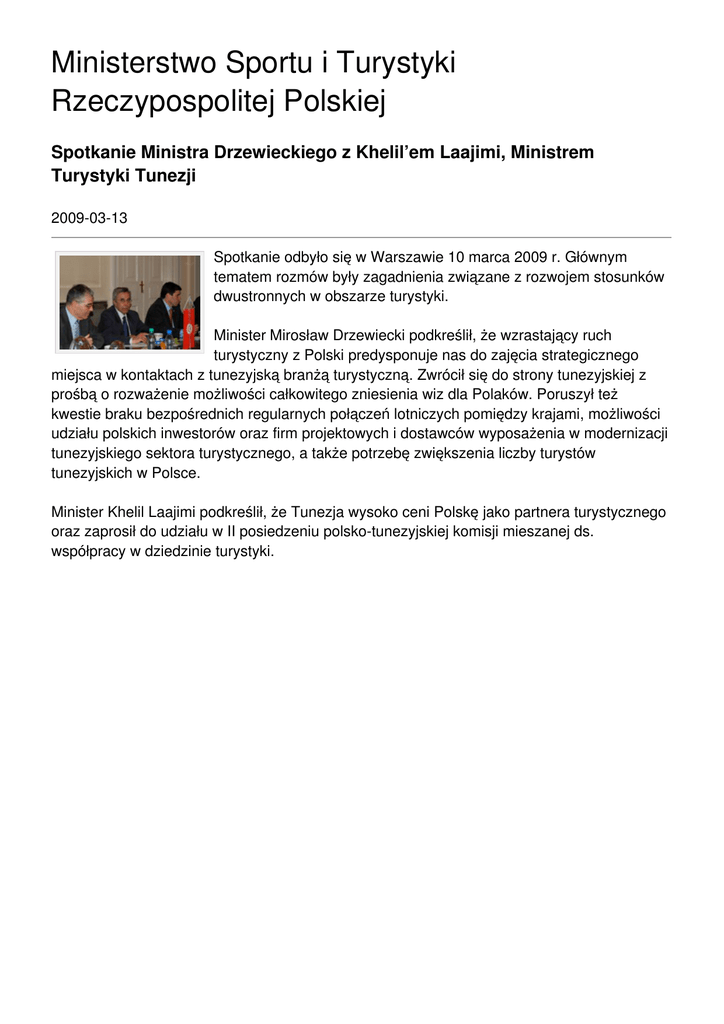 Ministerstwo Sportu i Turystyki Rzeczypospolitej Polskiej Spotkanie Ministra Drzewieckiego z Khelil’em Laajimi, Ministrem Turystyki Tunezji 2009-03-13 Spotkanie odbyło się w Warszawie 10 marca 2009 r. Głównym tematem rozmów były zagadnienia związane z rozwojem stosunków dwustronnych w obszarze turystyki. Minister Mirosław Drzewiecki podkreślił, że wzrastający ruch turystyczny z Polski predysponuje nas do zajęcia strategicznego miejsca w kontaktach z tunezyjską branżą turystyczną. Zwrócił się do strony tunezyjskiej z prośbą o rozważenie możliwości całkowitego zniesienia wiz dla Polaków. Poruszył też kwestie braku bezpośrednich regularnych połączeń lotniczych pomiędzy krajami, możliwości udziału polskich inwestorów oraz firm projektowych i dostawców wyposażenia w modernizacji tunezyjskiego sektora turystycznego, a także potrzebę zwiększenia liczby turystów tunezyjskich w Polsce. Minister Khelil Laajimi podkreślił, że Tunezja wysoko ceni Polskę jako partnera turystycznego oraz zaprosił do udziału w II posiedzeniu polsko-tunezyjskiej komisji mieszanej ds. współpracy w dziedzinie turystyki.