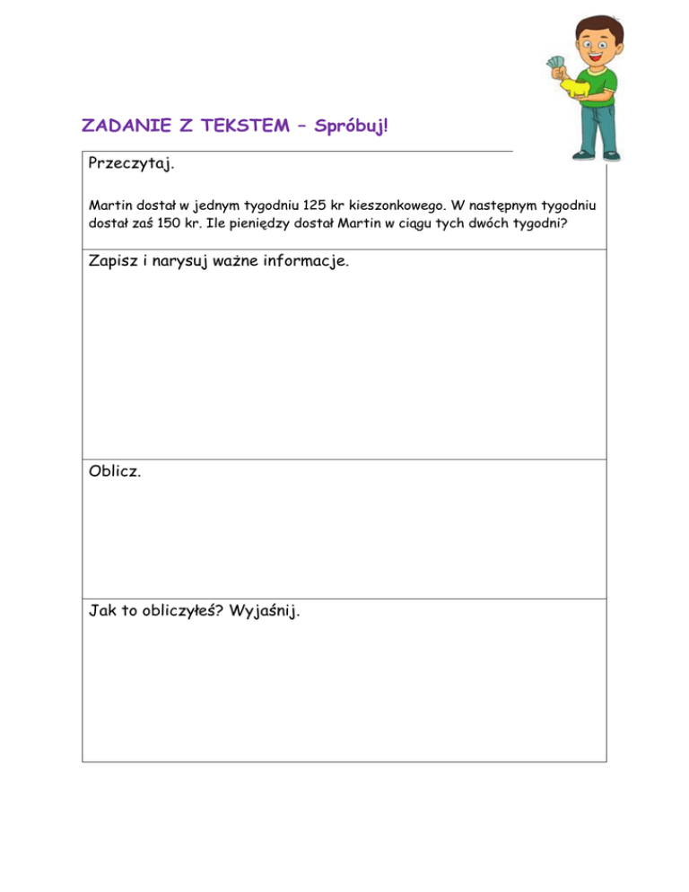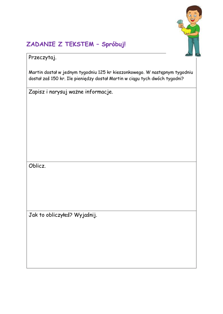 ZADANIE Z TEKSTEM – Spróbuj! Przeczytaj. Martin dostał w jednym tygodniu 125 kr kieszonkowego. W następnym tygodniu dostał zaś 150 kr. Ile pieniędzy dostał Martin w ciągu tych dwóch tygodni? Zapisz i narysuj ważne informacje. Oblicz. Jak to obliczyłeś? Wyjaśnij. ZADANIE Z TEKSTEM – Spróbuj! Przeczytaj. Kupiłeś telefon komórkowy za 595 koron i ładowarkę za 249 koron. Zapłaciłeś banknotem 1000 kr. Ile pieniędzy ci zostało? Zapisz i narysuj ważne informacje. Oblicz Jak to obliczyłeś? Wyjaśnij. ZADANIE Z TEKSTEM – Spróbuj! Przeczytaj. Julie ma cztery dziesiątki i dwa razy tyle monet jednokoronowych. Ile ma w sumie pieniędzy? Jonas ma osiem dziesiątek i o połowę mniej piątek. O ile więcej pieniędzy ma Jonas? Zapisz i narysuj ważne informacje. Oblicz. Jak to obliczyłeś? Wyjaśnij. ZADANIE Z TEKSTEM – Spróbuj! Przeczytaj. Petter i jego tata mają razem 46 lat. Tata jest o 34 lata starszy niż Petter. Ile lat ma Petter? Ile lat ma tata? Zapisz i narysuj ważne informacje. Oblicz. Jak to obliczyłeś? Wyjaśnij. ZADANIE Z TEKSTEM – Spróbuj! Przeczytaj. Rasim rusza w drogę samochodem. Ma do przejechania 460 km. Po przejechaniu 278 km robi sobie postój. Ile jeszcze kilometrów musi przejechać do celu? Zapisz i narysuj ważne informacje. Oblicz. Jak to obliczyłeś? Wyjaśnij. ZADANIE Z TEKSTEM – Spróbuj! Przeczytaj. Z Drammen do Kongsberg jest 40 km. Z Kongsberg do Haugesund jest 374 km. Ile kilometrów jest z Drammen do Haugesund? Zapisz i narysuj ważne informacje. Oblicz. Jak to obliczyłeś? Wyjaśnij. ZADANIE Z TEKSTEM – Spróbuj! Przeczytaj. Unni kupiła sobie lody i napój. Za obie te rzeczy zapłaciła 39 koron. Napój kosztował o 10 kr więcej niż lody. Ile kosztowały lody? Zapisz i narysuj ważne informacje. Oblicz. Jak to obliczyłeś? Wyjaśnij. ZADANIE Z TEKSTEM – Spróbuj! Przeczytaj. Harriet przeczytała dwie książki. Pierwsza z nich, „Anne i Jørgen”, ma 197 stron, zaś druga książka, „Karius i Baktus”, ma 48 stron. Ile stron w sumie przeczytała Harriet? Zapisz i narysuj ważne informacje. Oblicz. Jak to obliczyłeś? Wyjaśnij. ZADANIE Z TEKSTEM – Spróbuj! Przeczytaj. Ingrid mieszka 1895 metrów od szkoły. Jaką odległość musi przejść codziennie do szkoły i z powrotem? Zapisz i narysuj ważne informacje. Oblicz. Jak to obliczyłeś? Wyjaśnij. ZADANIE Z TEKSTEM – Spróbuj! Przeczytaj. Henryk chce kupić nowy rower. Zaoszczędził 2763 kr. Na urodziny dostał jeszcze 500 kr. Rower kosztuje 3899 kr. Czy wystarczy mu pieniędzy? Zapisz i narysuj ważne informacje. Oblicz. Jak to obliczyłeś? Wyjaśnij. ZADANIE Z TEKSTEM – Spróbuj! Przeczytaj. W roku 2014 w Norwegii urodziło się 3076 chłopców i 2843 dziewczynki. Ile dzieci urodziło się w Norwegii w 2014? Zapisz i narysuj ważne informacje. Oblicz. Jak to obliczyłeś? Wyjaśnij. ZADANIE Z TEKSTEM – Spróbuj! Przeczytaj. W pewnej klasie jest 27 uczniów. 14 z nich to dziewczynki. Ilu chłopców jest w tej klasie? Zapisz i narysuj ważne informacje. Oblicz. Jak to obliczyłeś? Wyjaśnij. ZADANIE Z TEKSTEM – Spróbuj! Przeczytaj. Ola kupiła dwa komiksy. Zapłaciła za nie w sumie 66 kr. Ile kosztuje jeden komiks? Zapisz i narysuj ważne informacje. Oblicz. Jak to obliczyłeś? Wyjaśnij. ZADANIE Z TEKSTEM – Spróbuj! Przeczytaj. W Kirkenes napadało śniegu. Pokrywa śniegu ma 167 cm grubości. W Lillehammer jest zaś 89 cm śniegu. O ile grubsza jest pokrywa śniegu w Kirkenes? Zapisz i narysuj ważne informacje. Oblicz. Jak to obliczyłeś? Wyjaśnij. ZADANIE Z TEKSTEM – Spróbuj! Sześcioro dzieci dostało po dwa samochodziki. Ile samochodzików w sumie dostały dzieci? Svar: _____________________________________________________________ Troje dzieci podzieliło między siebie 18 samochodzików. Ile samochodzików dostało kazde dziecko? Svar: ____________________________________________________________ Ania ma 18 lat. Jej siostra Marysia jest o osiem lat młodsza. Ile lat ma Marysia? Svar: _____________________________________________________________ Jonas i Mari jedzą lody. Jonas zjadł o dwa lody więcej niż Mari. Mari zjadła dwa lody. Ile lodów zjadł Jonas? Svar: _____________________________________________________________ ZADANIE Z TEKSTEM – Spróbuj! Uporządkuj liczby rosnąco (od najmniejszej do największej). 900 878 788 853 898 _________________________________________________________________ Podwój te liczby i zapisz wynik: 200 16 45 89 56 78 _____ ____ ____ ____ ____ ____ Ile wynosi połowa każdej z tych liczb? 200 16 44 88 56 90 _____ ____ ____ ____ ____ ____ Używając cyfr 4, 5 i 6 napisz tyle liczb trzycyfrowych, ile potrafisz. _____ _____ _____ _____ _____ _____ ZADANIE Z TEKSTEM – Spróbuj! Oblicz różnicę między większą i mniejszą liczbą.. 436 364 Tu zapisz działanie: Porównaj liczby. 133 og 145 Różnica wynosi ___________ 142 og 169 Różnica wynosi ____________ Dodajesz do siebie trzy liczby. Wynik wynosi 885. Pierwsza z tych liczb to 423, a druga 236. Znajdź trzecią z tych liczb. Odp: Trzecia z tych liczb to:___________________________________ Odejmij podwojoną liczbę 15 od połowy liczby 280. Jaki jest wynik? Dodaj połowę liczby 80 do połowy liczby 30. Jaki jest wynik? Rozpocznij od liczby 500. Dodaj połowę liczby 300, a potem odejmij połowę liczby 700. Jaki jest wynik?