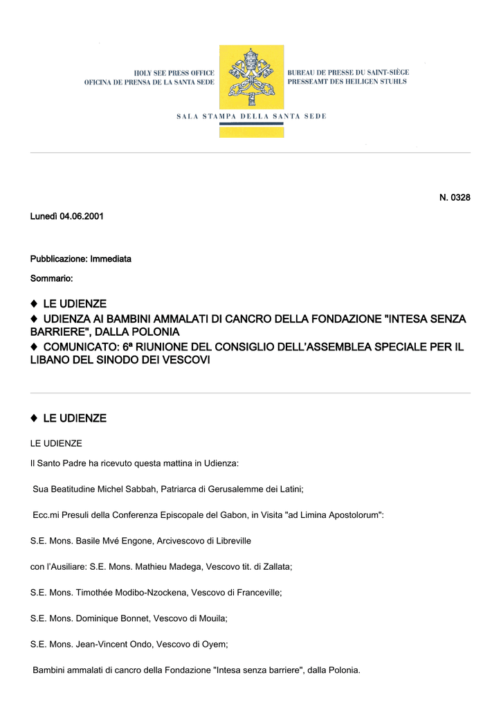 N. 0328 Lunedì 04.06.2001 Pubblicazione: Immediata Sommario: ♦ LE UDIENZE ♦ UDIENZA AI BAMBINI AMMALATI DI CANCRO DELLA FONDAZIONE "INTESA SENZA BARRIERE", DALLA POLONIA ♦ COMUNICATO: 6ª RIUNIONE DEL CONSIGLIO DELL’ASSEMBLEA SPECIALE PER IL LIBANO DEL SINODO DEI VESCOVI ♦ LE UDIENZE LE UDIENZE Il Santo Padre ha ricevuto questa mattina in Udienza: Sua Beatitudine Michel Sabbah, Patriarca di Gerusalemme dei Latini; Ecc.mi Presuli della Conferenza Episcopale del Gabon, in Visita "ad Limina Apostolorum": S.E. Mons. Basile Mvé Engone, Arcivescovo di Libreville con l’Ausiliare: S.E. Mons. Mathieu Madega, Vescovo tit. di Zallata; S.E. Mons. Timothée Modibo-Nzockena, Vescovo di Franceville; S.E. Mons. Dominique Bonnet, Vescovo di Mouila; S.E. Mons. Jean-Vincent Ondo, Vescovo di Oyem; Bambini ammalati di cancro della Fondazione "Intesa senza barriere", dalla Polonia. Bollettino N. 0328 - 04.06.2001 2 [00938-01.02] UDIENZA AI BAMBINI AMMALATI DI CANCRO DELLA FONDAZIONE "INTESA SENZA BARRIERE", DALLA POLONIA ● SALUTO DEL SANTO PADRE ● TRADUZIONE IN LINGUA ITALIANA Alle 12 di questa mattina, nella Sala Clementina del Palazzo Apostolico Vaticano, il Santo Padre Giovanni Paolo II ha ricevuto in Udienza i bambini ammalati di cancro della Fondazione "Intesa senza barriere" provenienti dalla Polonia ed ha loro rivolto le parole di saluto che pubblichiamo di seguito: ● SALUTO DEL SANTO PADRE Moi drodzy, Serdecznie witam Was wszystkich. Dziękuję Pani Prezydentowej za słowo wprowadzenia do tego spotkania. Bardzo się cieszę, że mogę Was tu gościć. Mam nadzieję, że ta krótka wizyta w Watykanie pozwoli Wam przynajmniej na chwilę oderwać się od rzeczywistości, w jakiej na co dzień znajdujecie się z powodu waszej choroby. Wiem jak trudne jest doświadczenie choroby, zwłaszcza gdy dotyka ona dziecko. Dlatego całym sercem razem z Wami proszę Pana Jezusa o dar zdrowia dla Was i dla wszystkich waszych rówieśników dotkniętych przez chorobę i cierpienie. Modlę się również o nadzieję dla Was, waszych rodziców i opiekunów, abyście byli mocni duchem, szczególnie wtedy, gdy ciało przenika słabość. Myśląc o trudnej sytuacji, w jakiej znajduje się dziś służba zdrowia w Polsce, proszę również Boga, aby natchnął wszystkich odpowiedzialnych duchem miłości i mądrości, by dołożyli wszelkich starań i skutecznie zmieniali tę rzeczywistość, dla dobra wszystkich Rodaków. Pragnę również razem z Wami dziękować Bogu za wszelkie dobro. Czasem człowiekowi cierpiącemu trudno dostrzec, że również w chorobie dokonuje się wiele dobra zarówno w nim samym, jak i w sercach tych, którzy są mu bliscy. Dlatego trzeba, abyśmy dziękowali Panu Jezusowi za miłość, jaką otaczają Was wasi rodzice i krewni, za troskę, z jaką opiekują się Wami lekarze i pielęgniarki, za ofiarność często nieznanych ludzi, którzy wspierają Was materialnie i duchowo. Niech nigdy nie zabraknie tej miłości i tej dobroci! Proszę zawiecie moje pozdrowienie i błogosławieństwo waszym bliskim, waszym kolegom i koleżankom, zwłaszcza tym, którzy jak wy zmagają się z chorobą. Niech Bóg da Wam łaskę zdrowia i niech Wam błogosławi! [00940-09.02[Testo originale: Polacco] ● TRADUZIONE IN LINGUA ITALIANA Miei Cari, A voi tutti il mio cordiale benvenuto. Ringrazio la Consorte del Signor Presidente per l’introduzione a questo incontro. Sono molto lieto di potervi ospitare qui. Spero che questa breve visita in Vaticano vi permetta, almeno per un attimo, il distacco dalla realtà in cui vi trovate normalmente a motivo della vostra malattia. So quanto sia difficile l’esperienza della malattia, specialmente se riguarda un bambino. Perciò, insieme a voi, prego con tutto cuore il Signore Gesù per il dono della salute per voi e per tutti i vostri coetanei provati dall’infermità e dalla sofferenza. Prego anche perché abbiate la speranza per voi stessi, per i vostri genitori e per Bollettino N. 0328 - 04.06.2001 3 coloro che hanno cura di voi, affinché siate forti nello spirito, specialmente quando il corpo soggiace alla debolezza. Pensando alla difficile situazione in cui versa oggi il servizio sanitario in Polonia, chiedo anche a Dio di infondere in tutti i responsabili lo spirito di amore e di sapienza, che li spinga a fare il possibile per cambiare efficacemente tale realtà, per il bene di tutti i polacchi. Insieme a voi, voglio anche rendere grazie a Dio per ogni bene. Succede che a colui che soffre sia difficile scorgere che anche nella malattia un grande bene si compie sia in lui che nei cuori di tutti coloro che gli sono vicini. Dobbiamo ringraziare Gesù per l’amore di cui siete circondati da parte dei vostri genitori e parenti, per le premure nei vostri riguardi da parte dei medici e delle infermiere, per la generosità di persone, spesso sconosciute, che vi sostengono materialmente e spiritualmente. Non manchino mai questo amore e questa bontà! Vi prego di portare il mio saluto e la mia benedizione ai vostri cari, ai vostri compagni e compagne, specialmente a coloro, che come voi lottano contro la malattia. Dio vi conceda la grazia della salute e vi benedica. [00940-01.01] [Testo originale: Polacco] COMUNICATO: 6ª RIUNIONE DEL CONSIGLIO DELL’ASSEMBLEA SPECIALE PER IL LIBANO DEL SINODO DEI VESCOVI Il Consiglio della Segreteria Generale del Sinodo dei Vescovi per l’Assemblea Speciale per il Libano si è riunito nei giorni 17-18 maggio 2001 nella sede della Segreteria Generale. Si è trattato della sesta riunione del Consiglio Postsinodale, che fu costituito dal Santo Padre il 24 gennaio 1995 e successivamente ha subito diverse variazioni in considerazione di determinate circostanze riguardanti le istituzioni ecclesiali e le stesse funzioni dei Membri. Recentemente cinque nuovi Membri sono entrati a far parte del suddetto Consiglio, che pertanto risulta oggi così formato: 1. S.B. il Card. Nasrallah Pierre Sfeir, Patriarca di Antiochia dei Ma
