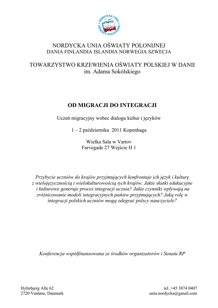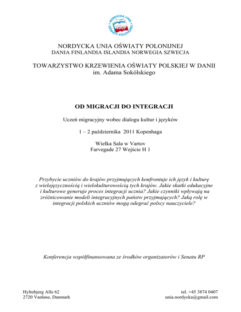 NORDYCKA UNIA OŚWIATY POLONIJNEJ DANIA FINLANDIA ISLANDIA NORWEGIA SZWECJA TOWARZYSTWO KRZEWIENIA OŚWIATY POLSKIEJ W DANII im. Adama Sokólskiego OD MIGRACJI DO INTEGRACJI Uczeń migracyjny wobec dialogu kultur i języków 1 – 2 października 2011 Kopenhaga Wielka Sala w Vartov Farvegade 27 Wejście H 1 Przybycie uczniów do krajów przyjmujących konfrontuje ich język i kulturę z wielojęzycznością i wielokulturowością tych krajów. Jakie skutki edukacyjne i kulturowe generuje proces integracji ucznia? Jakie czynniki wpływają na zróżnicowanie modeli integracyjnych państw przyjmujących? Jaką rolę w integracji polskich uczniów mogą odegrać polscy nauczyciele? Konferencja współfinansowana ze środków organizatorów i Senatu RP Hyltebjerg Alle 62 2720 Vanløse, Danmark tel. +45 3874 0407 [email protected] PROGRAM 1 października 2011 10.00 – 10.30 Uroczyste otwarcie konferencji. Wystąpienia przedstawiciela Ambasady RP w Danii, Sejmu i Senatu RP, MEN, Wspólnoty Polskiej, NUOP. Sesja 1 – Język ojczysty w procesie integracji Przewodniczenie – dr Maria Małaśnicka Miedzianogóra Dania NUOP 10.30 – 11.30 ”Wszystkie języki werbalizują świat, indywidualizuje go tylko język ojczysty” Prof. Anne Holmen CIP Centrum Internacjonalizacji i Paralelizacji Językowej Uniwersytetu Kopenhaskiego 11.30 -12.30 „Możliwości integracji na przykładzie różnych kontekstów kulturowych” Dr hab. Hanna Mamzer UAM Uniwersytet im. Adama Mickiewicza w Poznaniu 12.30 -13.00 Dyskusja 13.00 – 14.00 Lunch Sesja 2. Języki ojczyste w krajach nordyckich Przewodniczenie – mgr Magdalena Ihnatowicz Dyrektor Polskiej Szkoły w Bergen Norwegia 14.00-14.30 „Dwujęzyczność w procesie migracji” Beata Howe – gość z Wielkiej Brytanii Zjednoczenie Nauczycieli Polskich Zagranicą w Wielkiej Brytanii 14.30-15.10 Zmiany w prawodawstwie szwedzkim dotyczące języków ojczystych i ich możliwy wpływ na model integracji uczniów migracyjnych”. Jacek Jurkowski, Ewa Rybacka Związek Nauczycieli Polskich w Szwecji Hyltebjerg Alle 62 2720 Vanløse, Danmark tel. +45 3874 0407 [email protected] 15.10 -15.50 „Znaczenie nauki języka ojczystego dla procesu integracji polskich uczniów w Norwegii” Agnieszka Adamczak i Aleksandra Kuźnik – red. strony internetowej „Język Ojczysty”. NAFONarodowe Centrum Wielojęzyczności. 15.50 – 16.20 Kawa 16.20 -17.00 „Edukacja polskich uczniów migracyjnych w krajach nordyckich. Konstrukcja raportu. ” Mgr Danuta Kral-Leszczyńska, mgr Agnieszka Janus-Hiekaranta - Polskie Towarzystwo Oświatowo -Kulturalne w Finlandii 17.00 -17.20 dyskusja 17.20 – 17.40 „Znaczenie języka ojczystego, kultury i tradycji w koncepcjach edukacyjnych N. F. S. Grundtviga.Vartov i jego grundtvigańskie korzenie.” Margareta Kepinska Jakobsen – Duński Helsiński Komitet Praw Dziecka 18.00 -21.00 Uroczysta kolacja Koncert muzyczny 2 października 2011 Sesja 3. Elementy polityki integracyjnej Przewodniczenie konferencji - Jacek Jurkowski, Ewa Rybacka - Związek Nauczycieli Polskich w Szwecji 9.00 -9.30 „Szkoła młodzieżowa - nie szkoła w publicznym systemie oświatowym i droga do integracji młodzieży w Danii.” Kim Brynaa Dyrektor Zespołu Szkół Młodzieżowych w Kopenhadze 9.30 – 10.15 „Polityka integracyjna wobec uczniów dwujęzycznych w szkołach gminy Greve.” Vinnie Hansen Konsultant ds. Dwujęzycznych Uczniów w gminie Greve. Hyltebjerg Alle 62 2720 Vanløse, Danmark tel. +45 3874 0407 [email protected] 10.15-11.00 „Polski moduł kulturowo-edukacyjny w migracyjnych programach integracyjnych” dr Maria Małaśnicka Miedzianogóra TKOP w Danii. 11.00 – 11.30 kawa 11.30 -12.15 Wnioski i postulaty. Przyjęcie końcowego dokumentu konferencji. Zakończenie Prezentują- Danuta Kral-Leszczyńska, Agnieszka Hiekaranta PTOK Finlandia 12.15-13.00 lunch 13.00 – dla chętnych w zależności od pogody: Rejs Łodzią Vikingów po kanałach kopenhaskich Zwiedzanie Muzeum Sztuki Antycznej i Współczesnej Gliptoteken Hyltebjerg Alle 62 2720 Vanløse, Danmark tel. +45 3874 0407 [email protected]