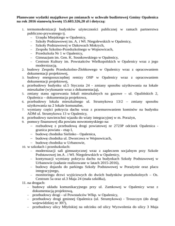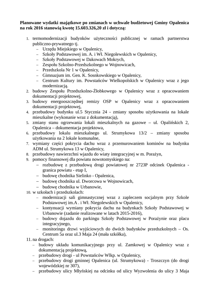 Planowane wydatki majątkowe po zmianach w uchwale budżetowej Gminy Opalenica na rok 2016 stanowią kwotę 15.603.326,20 zł i dotyczą: 1. termomodernizacji budynków użyteczności publicznej w ramach partnerstwa publiczno-prywatnego tj. Urzędu Miejskiego w Opalenicy, Szkoły Podstawowej im. A. i Wł. Niegolewskich w Opalenicy, Szkoły Podstawowej w Dakowach Mokrych, Zespołu Szkolno-Przedszkolnego w Wojnowicach, Przedszkola Nr 1 w Opalenicy, Gimnazjum im. Gen. K. Sosnkowskiego w Opalenicy, Centrum Kultury im. Powstańców Wielkopolskich w Opalenicy wraz z jego modernizacją. 2. budowy Zespołu Przedszkolno-Żłobkowego w Opalenicy wraz z opracowaniem dokumentacji projektowej, 3. budowy energooszczędnej remizy OSP w Opalenicy wraz z opracowaniem dokumentacji projektowej, 4. przebudowy budynku ul.5 Stycznia 24 - zmiany sposobu użytkowania na lokale mieszkalne (wykonanie wraz z dokumentacją), 5. zmiany stanu ogrzewania lokali mieszkalnych na gazowe – ul. Opalińskich 2, Opalenica – dokumentacja projektowa, 6. przebudowy lokalu mieszkalnego ul. Strumykowa 13/2 – zmiany sposobu użytkowania na 2 lokale komunalne, 7. wymiany części pokrycia dachu wraz z przemurowaniem kominów na budynku ADM ul. Strumykowa 13 w Opalenicy, 8. przebudowy nawierzchni wjazdu do wiaty integracyjnej w m. Porażyn, 9. pomocy finansowej dla powiatu nowotomyskiego na: rozbudowę z przebudową drogi powiatowej nr 2723P odcinek Opalenica granica powiatu - etap I, budowę chodnika Sielinko - Opalenica, budowę chodnika ul. Dworcowa w Wojnowicach, budowę chodnika w Urbanowie, 10. w szkołach i przedszkolach: modernizacji sali gimnastycznej wraz z zapleczem socjalnym przy Szkole Podstawowej im.A . i Wł. Niegolewskich w Opalenicy, kontynuacji wymiany pokrycia dachu na budynkach Szkoły Podstawowej w Urbanowie (zadanie realizowane w latach 2015-2016), budowy dojazdu do parkingu Szkoły Podstawowej w Porażynie oraz placu integracyjnego, monitoringu drzwi wyjściowych do dwóch budynków przedszkolnych – Os. Centrum 5a oraz ul.3 Maja 24 (mała szkółka), 11. na drogach: budowy układu komunikacyjnego przy ul. Zamkowej w Opalenicy wraz z dokumentacją projektową, przebudowy drogi - ul Powstańców Wlkp. w Opalenicy, przebudowy drogi gminnej Opalenica (ul. Strumykowa) - Troszczyn (do drogi wojewódzkiej nr 307), przebudowy ulicy Młyńskiej na odcinku od ulicy Wyzwolenia do ulicy 3 Maja 12. 13. 14. 15. 16. 17. 18. 19. 20. 21. wraz z przebudową i budową parkingu, kanalizacją deszczową, oświetleniem drogowym oraz przebudową istniejącego przepustu oraz budową sieci wodociągowej wraz z przyłączami – przebudowa przepustu, budowy układu komunikacyjnego po nieczynnym torowisku od ul. Wyzwolenia do obiektów ORLIK w Opalenicy, budowy oświetlenia drogowego na odcinku od Urbanowa do Kurowa (ścieżka rowerowa), zmiany układu komunikacyjnego wraz z budową parkingów ul. 26 Stycznia w Opalenicy oraz dokumentacją projektową, utwardzenia placu miejskiego przy ul. Mickiewicza w Opalenicy, przebudowy nawierzchni chodnika na ul. Zamkowej w Opalenicy (od ul. Poznańskiej do ul. Sienkiewicza), dokumentacji projektowej na przebudowę skrzyżowania drogi wojewódzkiej nr 307 z drogą gminną (ul. Porażyńską) w miejscowości Opalenica, przebudowy nawierzchni chodnika na ul. Niemojewskiego w Opalenicy, przebudowy nawierzchni chodnika w m. Rudniki (od DP 2742P do wjazdu do Domu Ludowego), dokumentacji projektowej na budowę ścieżki pieszo-rowerowej od obwodnicy południowej Opalenicy do figurki, przebudowy łącznika Zarzecze - Leśna w Opalenicy, opracowania dokumentacji na kładkę przez rzekę Mogielnicę, opracowania dokumentacji na budowę przydomowych oczyszczalni ścieków Porażyn, Jastrzębniki, rozbiórki budynków po PGKiM "KOMOPAL" w Opalenicy, wykupu gruntów, budowy przyłącza elektroenergetycznego: - na działce nr ewid.1537/1, na płaskowyżu przy ul. Młyńskiej w Opalenicy, - na działce nr ewid.1537/2 w Opalenicy przy ul.3 Maja, - w Dakowach Mokrych na dz. nr ewid. 277, zakupu i montażu wiat przystankowych w Jastrzębnikach, Łęczycach, Terespotockiem i Wojnowicach związanych z bezpieczeństwem uczniów dowożonych do szkół, dotacji dla Centrum Kultury im. Powstańców Wielkopolskich w Opalenicy na dokumentację projektową na rozbudowę i przebudowę ww. Centrum, zakup pompy zanurzeniowej, pompy szlamowej i motopompy pływającej w celu dozbrojenia samochodu pożarniczego VOLVO, budowy 3 placów zabaw, w tym: przy ul. Leśnej, Ticza Bara , Zarzecze w Opalenicy, przy ul. Spokojnej w Opalenicy, oraz przy zbiegu ulic Polna, Poprzeczna i Nowa w Opalenicy, w salach wiejskich: wykonania instalacji odgromowej w Łagwach, wymiany rynien w Rudnikach, zakupu materiałów do wykonania posadzki w m. Uścięcice, modernizacji Domu Ludowego w Uścięcicach, ponadto ustalono zadania inwestycyjne i zakupy inwestycyjne w ramach funduszy sołeckich ustalone przez mieszkańców poszczególnych wsi.