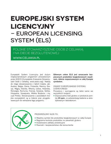 EUROPEJSKI SYSTEM LICENCYJNY – EUROPEAN LICENSING SYSTEM (ELS) POLSKIE STOWARZYSZENIE OSÓB Z CELIAKIĄ I NA DIECIE BEZGLUTENOWEJ WWW.CELIAKIA.PL Europejski System Licencyjny jest dużym międzynarodowym programem prowadzonym przez AOECS (Europejskie Zrzeszenie Stowarzyszeń Osób z Celiakią, www.aoecs.org). Należą do niego stowarzyszenia z takich krajów, jak: Austria, Belgia, Dania, Finlandia, Niemcy, Grecja, Węgry, Irlandia, Włochy, Łotwa, Holandia, Norwegia, Rumunia, Francja, Szwecja, Serbia, Hiszpania, Szwajcaria, Wielka Brytania i my, czyli Polska. Stowarzyszenia z pozostałych krajów europejskich są w trakcie prac przygotowawczych do wdrażania tego programu. M Y: K: Głównym celem ELS jest oznaczanie bezpiecznych produktów bezglutenowych wspólnym, dobrze rozpoznawanym w całej Europie symbolem. ZASADY EUROPEJSKIEGO SYSTEMU LICENCYJNEGO Procedury i wymagania są takie same we wszystkich krajach: Dopuszczalna ilość glutenu w produkcie poniżej 20 ppm, co potwierdzają badania w akredytowanym laboratorium. PRZEKREŚLONY KŁOS TO: Wspólny symbol dla produktów bezglutenowych w całej Europie Regularna kontrola produktów na zawartość glutenu Audytowane zakłady produkcyjne Pewność i bezpieczeństwo dla konsumenta 1 Audytorzy stowarzyszenia z kraju producenta starającego się o licencję przeprowadzają audyt w zakładzie produkcyjnym. Po pozytywnym wyniku audytu zostaje podpisana umowa licencyjna. Każda umowa licencyjna jest podpisywana na rok i na ten okres licencjobiorca zobowiązuje się do bezpiecznej produkcji bezglutenowej. Po roku procedura jest powtarzana, a licencja przedłużana. Co ważne: każde stowarzyszenie udziela licencji producentom ze swojego kraju i jest ona uznawana w pozostałych krajach. CO SPRAWIA, ŻE PRODUKTY Z PRZEKREŚLONYM KŁOSEM SĄ BEZPIECZNE? Licencja na używanie znaku Przekreślonego Kłosa to cały system zapewniający bezpieczeństwo produkcji bezglutenowej. W skład tego systemu wchodzą zarówno ludzie, jak i szereg procedur, uzgodnień i procesów. Umowa licencyjna jest jednym z elementów, który reguluje prawa i obowiązki obu stron (producenta oraz stowarzyszenia) i jest tak stworzona, by zagwarantować bezpieczeństwo konsumentom. Istotą tego systemu jest stała współpraca, czyli bezpośredni kontakt stowarzyszenia z firmą. W toku tej współpracy powstają nowe produkty bezglutenowe, sprawdzane są składy i etykiety produktów, bezpieczeństwo surowców i procesu produkcyjnego. Nieodłącznym elementem są również badania produktów na zawartość glutenu, przeprowadzane zawsze w akredytowanych laboratoriach. Częstotliwość tych badań jest sprawą indywidualną i zależną od wielu czynników, m.in.: specyfiki zakładu – czy jest to produkcja specjalistyczna, czy na terenie zakładu jest obecny gluten, czy też go nie ma; danego rodzaju produktu – czy do jego wytwarzania wykorzystywane są surowce o niskim ryzyku zanieczyszczenia glutenem, np. mięso przy produkcji wędlin (badania wykonuje się wówczas w ustalonych harmonogramach, zwykle raz w roku), czy też mamy do czynienia z surowcami wysokiego ryzyka, np. z kukurydzą (wówczas badania wykonywane są dużo częściej); tego, czy zakład posiada certyfikaty jakości BRC i/lub IFS. JAK JEST TERAZ W POLSCE? Po sześciu latach prowadzenia programu możemy mówić o dużym sukcesie. W tym czasie umowy licencyjne podpisało 70 firm. Więk- M Y: K: Na etykiecie pod znakiem Przekreślonego Kłosa umieszczony jest numer licencyjny produktu. Co oznacza? PL-001-001 Numer producenta Symbol kraju Numer produktu PL-003-002 OATS-GB-001-007 Produkt z owsa bezglutenowego Numer produktu Numer producenta Symbol kraju 2 szość z nich co roku je przedłuża i oznacza symbolem nowe bezpieczne produkty. Są to zarówno duże koncerny, jak i małe, rodzinne firmy spożywcze. Dzięki ELS pojawiło się na polskim rynku dużo bezpiecznych dla nas wędlin opatrzonych symbolem Przekreślonego Kłosa, dostępnych w supermarketach, delikatesach i sklepach sieciowych, a nie tylko w sklepach ze zdrową żywnością. I co ważne, są to wędliny w zwykłych cenach. Jest też coraz większy wybór pieczywa chrupkiego, powstają nowe słodycze bezglutenowe, konserwy rybne ze znakiem Przekreślonego Kłosa i wiele innych produktów. Dla dorosłych jest już także dostępne polskie piwo bezglutenowe. Im więcej zwykłej żywności będzie opatrzonej znakiem Przekreślonego Kłosa, tym nasze wydatki będą niższe, ponieważ produkty bezglutenowe będziemy kupować w normalnych cenach. Bardzo nas cieszy także fakt, że kilka dużych firm, doceniając renomę międzynarodowego M Y: K: znaku Przekreślonego Kłosa, zrezygnowało ze stosowania swojego własnego oznaczenia na rzecz licencji. Zapraszamy do zapoznania się z wykazem polskich produktów licencjonowanych znakiem Przekreślonego Kłosa przez nasze Stowarzyszenie, stan na 31.03.2016 r. Lista produktów stale się zmienia. Wkrótce na rynku pojawią się kolejne produkty oznaczone Przekreślonym Kłosem. Zapraszamy także do przeczytania wywiadów z przedstawicielami kilku firm – dlaczego przystąpili do Europejskiego Systemu Licencyjnego i jak po latach oceniają swoją decyzję. Aktualne informacje na temat produktów licencjonowanych są dostępne na stronach www.celiakia.pl oraz www.aoecs.org/gluten-free-products-under-license. Czy chciałbyś, aby wszystkie produkty bezglutenowe były oznaczone licencjonowanym znakiem Przekreślonego Kłosa?* Aż 97% ankietowanych z grupy 1170 osób chciałoby, by wszystkie produkty były oznaczone licencjonowanym Przekreślonym Kłosem! * Jedno z pytań z ankiety przeprowadzonej przez Stowarzyszenie w październiku 2015. Więcej o ankiecie i odpowiedziach – w numerze 7 magazynu „Bez glutenu”. 3 M Y: K: KUBARA i Amarello Firma Kubara Sp. j. (dawniej Ekoprodukt) otrzymała licencję na znak Przekreślonego Kłosa we wrześniu 2011 roku. Na początku z jednym produktem, ekspandowan