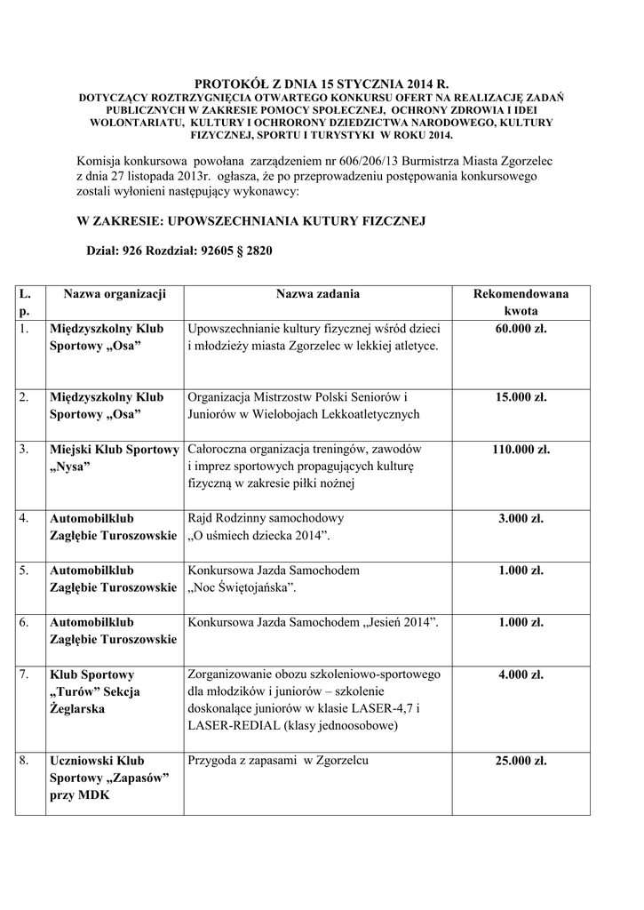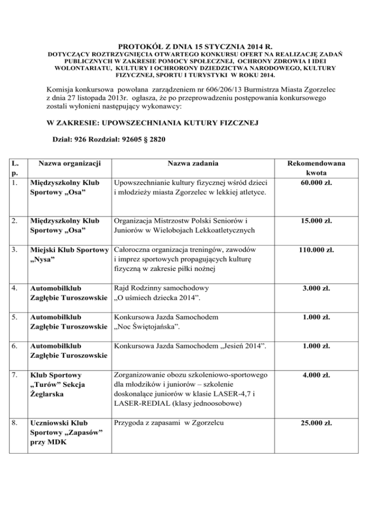 PROTOKÓŁ Z DNIA 15 STYCZNIA 2014 R. DOTYCZĄCY ROZTRZYGNIĘCIA OTWARTEGO KONKURSU OFERT NA REALIZACJĘ ZADAŃ PUBLICZNYCH W ZAKRESIE POMOCY SPOŁECZNEJ, OCHRONY ZDROWIA I IDEI WOLONTARIATU, KULTURY I OCHRORONY DZIEDZICTWA NARODOWEGO, KULTURY FIZYCZNEJ, SPORTU I TURYSTYKI W ROKU 2014. Komisja konkursowa powołana zarządzeniem nr 606/206/13 Burmistrza Miasta Zgorzelec z dnia 27 listopada 2013r. ogłasza, że po przeprowadzeniu postępowania konkursowego zostali wyłonieni następujący wykonawcy: W ZAKRESIE: UPOWSZECHNIANIA KUTURY FIZCZNEJ Dział: 926 Rozdział: 92605 § 2820 L. p. 1. Nazwa organizacji Nazwa zadania Rekomendowana kwota 60.000 zł. Międzyszkolny Klub Sportowy „Osa” Upowszechnianie kultury fizycznej wśród dzieci i młodzieży miasta Zgorzelec w lekkiej atletyce. 2. Międzyszkolny Klub Sportowy „Osa” Organizacja Mistrzostw Polski Seniorów i Juniorów w Wielobojach Lekkoatletycznych 15.000 zł. 3. Miejski Klub Sportowy Całoroczna organizacja treningów, zawodów i imprez sportowych propagujących kulturę „Nysa” fizyczną w zakresie piłki nożnej 110.000 zł. 4. Rajd Rodzinny samochodowy Automobilklub Zagłębie Turoszowskie „O uśmiech dziecka 2014”. 3.000 zł. 5. Konkursowa Jazda Samochodem Automobilklub Zagłębie Turoszowskie „Noc Świętojańska”. 1.000 zł. 6. Konkursowa Jazda Samochodem „Jesień 2014”. Automobilklub Zagłębie Turoszowskie 1.000 zł. 7. Klub Sportowy „Turów” Sekcja Żeglarska Zorganizowanie obozu szkoleniowo-sportowego dla młodzików i juniorów – szkolenie doskonalące juniorów w klasie LASER-4,7 i LASER-REDIAL (klasy jednoosobowe) 4.000 zł. 8. Uczniowski Klub Sportowy „Zapasów” przy MDK Przygoda z zapasami w Zgorzelcu 25.000 zł. 9. Org. treningów i zawodów, zajęć i imprez Uczniowski Klub Sportowy „Energetyk” propagujących pływanie oraz sporty wodne, organizacja zawodów pływackich 10. Uczniowski Klub Sportowy „Basket” Festiwal koszykówki ulicznej „StreetBall Zgorzelec 2014” 25.000 zł. 11. Uczniowski Klub Sportowy „Basket” Szkolenie w zakresie koszykówki dziewcząt i chłopców w wieku szkolnym. 55.000 zł. 12. Uczniowski Klub Sportowy „Warrior Organizacja letniego obozu kondycyjnego – taekwondo olimpijskie 2.500 zł. 13. Uczniowski Klub Sportowy „Warrior Prowadzenie szkolenia sportowego oraz udział we współzawodnictwie sportowym dzieci i młodzieży uzdolnionej sportowo w taekwondo olimpijskim 10.000 zł. 14. Związek Harcerstwa Polskiego Chorągiew Dolnośląska Szkolenie na żeglarza jachtowego, udział w regatach i w obozie żeglarskim 2.000 zł. 15. Związek Harcerstwa Polskiego Chorągiew Dolnośląska Strzelectwo w formie otwartej ligi oraz systematycznego działania Harcerskiego Klubu „MUSZKA” 1.000 zł. 16. Związek Harcerstwa Polskiego Chorągiew Dolnośląska Rajd pieszy pn. „Granica” 2.000 zł. 17. Zgorzelecka Grupa Rowerowa THC Promil Organizacja Dziecięcego Maratonu Rowerowego pn. „Bikeowy Weekend”. 3.000 zł. 18. Stowarzyszenie „Zgorzelecki GórnikEnergetyk” Cykl treningów i zajęć kondycyjnych w zakresie sportów obronnych 2.000 zł. 19. Klub Puszystych „SUPER LINIA” Akademia Ruchu. Działania prozdrowotne dla osób otyłych lub z nadwagą zwiększające aktywność fizyczną 5.000 zł. 20.000 zł. 20. Fundacja „Niepełnosprawnym i Oczekującym Pomocy” Integracyjne Zawody Sportowe 4.000 zł. 21. Tenisowe Centrum Euroregion NYSA Zgorzelec Otwarty Turniej Tenisa Ziemnego o Puchar Burmistrza Miasta Zgorzelec 1.000 zł. 22. Zrzeszenie Ludowe Zespoły Sportowe Powiatu Zgorzelec Organizacja Imprez Sportowo-Rekreacyjnych XV Igrzysk LZS 1.000 zł. 23. Stowarzyszenie na rzecz Szkoły Podstawowej Nr 2 z Oddziałami Integracyjnymi w Zgorzelcu „Zintegrowani” Turniej piłki nożnej chłopców szkół podstawowych „Mini Euro 2014” 2.000 zł. 24. Fundacja Integracji Społecznej „ABRAMIS” Uczniowski Klub Sportowy „EMILKA” Młodzieżowe Zawody Wędkarskie – Dzień Dziecka 2014 1.000 zł. Integracyjne Turnieje Tenisowe dla Dzieci, Młodzieży i Dorosłych 1.000 zł. Centrum Sportów Walki Kick Fighter Zgorzelec Organizacja treningów Kick-boxingu i boksu dla dzieci, młodzieży i dorosłych, organizacja zawodów i zgrupowań sportowych oraz wyjazdy na zawody 10.000 zł. 25. 26. W ZAKRESIE: EDUKACYJNEJ OPIEKI WYCHOWAWCZEJ Dział: 854 Rozdział: 85495 § 2820 L. p. 1. Nazwa organizacji Nazwa zadania Rekomendowana kwota. 26.000 zł. Stowarzyszenie Zgorzeleckich Mandolinistów Warsztaty Muzyczne Zgorzeleckiej Orkiestry Mandolinistów 2. Stowarzyszenie In spe w Zgorzelcu I Powiatowy Festiwal Talentów – „Talenciarz Gimnazjalista” 1.000 zł. 3. Stowarzyszenie „Zgorzelecki Górnik – Energetyk” Warsztaty dla młodzieży uzdolnionej „NetTalent” 1.000 zł. 4. Fundacja Wzajemnej Pomocy „SUPRA” „Wszyscy jesteśmy artystami. Dziecko w świecie Sztuki” 1.000 zł. 5. Stowarzyszenie „Zgorzelecki Górnik – Energetyk” Warsztaty teatralno – kabaretowe dla Seniorów 1.000 zł. W ZAKRESIE: UPOWSZECHNIANIA TURYSTYKI Dział: 630 Rozdział: 63003 § 2820 L. p. 1. 2. Nazwa organizacji Nazwa zadania Polskie Towarzystwo Schronisk Młodzieżowych XVIII Zgorzelecki Pieszo – Rowerowy Rajd Młodzieży Szkolnej Polskie Towarzystwo Schronisk Młodzieżowych XXV Jubileuszowy Regionalny Przegląd Piosenki Turystycznej i Ekologicznej Szkolnych Klubów Krajoznawczo-Turystycznych Rekomendowana kwota. 1.000 zł 1.000 zł. 3. Polskie Towarzystwo Schronisk Młodzieżowych XVII Zgorzelecka Impreza na Orientację o Puchar Burmistrza Miasta Zgorzelec oraz start szkolnych klubów turystycznych w cyklu imprez o Puchar Dolnego Śląska w marszach na orientację 3.000 zł. 4. Zgorzelecka Grupa Rowerowa THC Promil Zgorzelecka Grupa Rowerowa THC Promil Organizacja wycieczki rowerowej pn. „Elektrorower” 1.000 zł. Wycieczki rowerowe dla seniorów pn. „50+” 1.000 zł. 5. 6. Organizacja wycieczki pn. „Zdobywamy Stowarzyszenie Śnieżkę