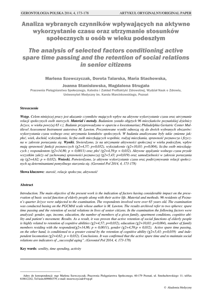 GERONTOLOGIA POLSKA 2014, 4, 173-178 ARTYKUŁ ORYGINALNY/ORIGINAL paper Analiza wybranych czynników wpływających na aktywne wykorzystanie czasu oraz utrzymanie stosunków społecznych u osób w wieku podeszłym The analysis of selected factors conditioning active spare time passing and the retention of social relations in senior citizens Marlena Szewczyczak, Dorota Talarska, Maria Stachowska, Joanna Stanisławska, Magdalena Strugała Pracownia Pielęgniarstwa Społecznego, Katedra i Zakład Profilaktyki Zdrowotnej, Wydział Nauk o Zdrowiu, Uniwersytet Medyczny im. Karola Marcinkowskiego, Poznań Streszczenie Wstęp. Celem niniejszej pracy jest ukazanie czynników mających wpływ na aktywne wykorzystanie czasu oraz utrzymanie relacji społecznych osób starszych. Materiał i metody. Badaniem zostało objętych 96 mieszkańców poznańskiej dzielnicy Jeżyce, w wieku powyżej 65 r.ż. Badanie przeprowadzono w oparciu o kwestionariusz Philadelphia Geriatric Center Multilevel Assessment Instrument autorstwa M. Lawton. Prezentowane wyniki odnoszą się do dwóch wybranych obszarów: wykorzystania czasu wolnego oraz utrzymania kontaktów społecznych. W badaniu analizowane były takie zmienne jak: płeć, wiek, dochód, wykształcenie, liczba osób mieszkających wspólnie, rodzaj mieszkania, sprawność poznawcza i fizyczna w zakresie poruszania się. Wyniki. Stwierdzono, że na utrzymanie aktywności społecznej w wieku podeszłym, wpływ mają sprawność funkcji poznawczych (c2=4,57; p=0,032), wykształcenie (c2=10,03; p=0,004), liczba osób mieszkających z respondentem (c2=14,86; p = 0,0011) oraz płeć (c2=4,59;p = 0,032). Aktywne spędzanie wolnego czasu przede wszystkim zależy od zachowanej sprawności poznawczej (c2=5,43; p=0,019) oraz samodzielności w zakresie poruszania się (c2=4,62; p = 0,032). Wnioski. Potwierdzono, że aktywne wykorzystanie czasu oraz podtrzymywanie relacji społecznych są determinantami pomyślnego starzenia się. (Gerontol Pol 2014, 4, 173-178) Słowa kluczowe: starość, relacje społeczne, aktywność Abstract Introduction. The main objective of the present work is the indication of factors having considerable impact on the preservation of basic social function of elderly people along with their active life. Material and methods. 96 residents of Poznan’s quarter Jeżyce were subjected to the examination. The respondents involved were over 65 years old. The examination was conducted basing on the PGCMAI scale whose author is M. Lawton. The results archived refer to two spheres: spare time passing and the retention of social relations in lives of senior citizens. In the examination the following factors were analyzed: gender, age, income, education, the number of members of a given family, apartment conditions, cognitive ability and patient’s movement. Results. As a result, it was proven that active retention of social functions of elderly people is highly related to retention of cognitive abilities (c2=4,57; p=0,032), education (c2=10,03; p=0,004), number of family members residing with the respondent(c2=14,86; p = 0,0011), gender (c2=4,59;p = 0,032). Active spare time passing, on the other hand, is conditioned to a greater extend by the retention of cognitive ability (c2=5,43; p=0,019) and independent locomotion (c2=4,62; p = 0,032). Conclusions. It was confirmed that the active spare time and to maintain social relations are indicators of „successful aging”. (Gerontol Pol 2014, 4, 173-178) Key words: senility, time spending, activity Adres do korespondencji: mgr Marlena Szewczyczak; Pracownia Pielęgniarstwa Społecznego, 60-179 Poznań, ul. Smoluchowskiego 11; tel/fax 618612242, Tel kom.609064379; e-mail: [email protected] Ó Akademia Medycyny 174 Marlena Szewczyczak i in. Wstęp Zjawisko starzenia się społeczeństwa, zauważalne jest na całym świecie, dlatego istotnymi wydają się badania nad przedmiotem starzenia się i starości [1, 2]. Upowszechnienie wiedzy dotyczącej samego procesu starzenia, jak i warunków życia człowieka w wieku podeszłym pozwala na stworzenie lepszej przyszłości dla seniorów oraz zmianę negatywnego postrzegania starości w społeczeństwie. Okres starości wiąże się ze zmianami w organizmie, wyrażającymi się pogorszeniem ogólnej wydolności i sprawności układów i narządów, co prowadzi do zwiększonego ryzyka występowania wielu chorób somatycznych. Wraz z upływem czasu nasila się również częstość występowania zaburzeń poznawczych i ograniczeń w zakresie zdolności przystosowawczych. Konsekwencją powyższych są zmiany w funkcjonowaniu społecznym. Ograniczona aktywność społeczna wynika też m.in. z przejścia na emeryturę. Osoba starsza staje wówczas przed obliczem całkowitej zmiany trybu i stylu życia: znikają obowiązki służbowe i ograniczone zostają kontakty personalne. Dodatkowo najczęściej zmniejszeniu ulegają przychody. Zmiany takie mogą być dla człowieka starszego czynnikiem kryzysogennym [3]. Dlatego, przy analizowaniu sytuacji życiowej seniorów, istotne jest nie tylko rozpatrywanie jej pod kątem zapewnienia potrzeb podstawowych (fizjologicznych, materialnych), ale także uwzględniania satysfakcji życiowej, więzi emocjonalnych, stylu życia [4]. Na styl życia składają się typowe zachowania w życiu codziennym, są one uzależnione od czynników środowiskowych oraz jednostkowych, takich jak: poziom wykształcenia, stan zdrowia, aspiracje itd. Pomimo dużego zróżnicowania w codziennym funkcjonowaniu, dostrzec jednak można pewne wspólne czynniki wpływające na ich przebieg: duża ilość wolnego czasu, różny stan zdrowia i poziom sprawności, ograniczenie różnorodności kręgów społecznych, w jakich funkcjonują osoby starsze [5]. Jak wynika z badań najpopularniejszą formą spędzania wolnego czasu wśród polskich seniorów po 60 r.ż. jest oglądanie telewizji, aż 70% osób ogląda programy telewizyjne przez ponad 2 godziny dzien