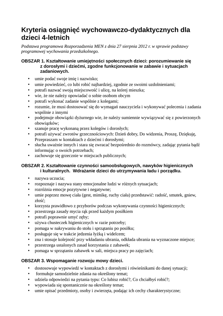 Kryteria osiągnięć wychowawczo-dydaktycznych dla dzieci 4