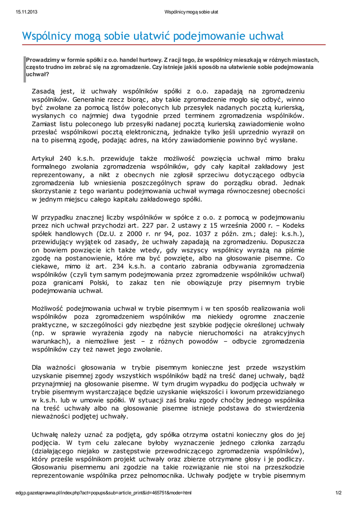 15.11.2013 Wspólnicy mogą sobie ułat Wspólnicy mogą sobie ułatwić podejmowanie uchwał Prowadzimy w formie spółki z o.o. handel hurtowy. Z racji tego, że wspólnicy mieszkają w różnych miastach, często trudno im zebrać się na zgromadzenie. Czy istnieje jakiś sposób na ułatwienie sobie podejmowania uchwał? Zasadą jest, iż uchwały wspólników spółki z o.o. zapadają na zgromadzeniu wspólników. Generalnie rzecz biorąc, aby takie zgromadzenie mogło się odbyć, winno być zwołane za pomocą listów poleconych lub przesyłek nadanych pocztą kurierską, wysłanych co najmniej dwa tygodnie przed terminem zgromadzenia wspólników. Zamiast listu poleconego lub przesyłki nadanej pocztą kurierską zawiadomienie wolno przesłać wspólnikowi pocztą elektroniczną, jednakże tylko jeśli uprzednio wyraził on na to pisemną zgodę, podając adres, na który zawiadomienie powinno być wysłane. Artykuł 240 k.s.h. przewiduje także możliwość powzięcia uchwał mimo braku formalnego zwołania zgromadzenia wspólników, gdy cały kapitał zakładowy jest reprezentowany, a nikt z obecnych nie zgłosił sprzeciwu dotyczącego odbycia zgromadzenia lub wniesienia poszczególnych spraw do porządku obrad. Jednak skorzystanie z tego wariantu podejmowania uchwał wymaga równoczesnej obecności w jednym miejscu całego kapitału zakładowego spółki. W przypadku znacznej liczby wspólników w spółce z o.o. z pomocą w podejmowaniu przez nich uchwał przychodzi art. 227 par. 2 ustawy z 15 września 2000 r. – Kodeks spółek handlowych (Dz.U. z 2000 r. nr 94, poz. 1037 z późn. zm.; dalej: k.s.h.), przewidujący wyjątek od zasady, że uchwały zapadają na zgromadzeniu. Dopuszcza on bowiem powzięcie ich także wtedy, gdy wszyscy wspólnicy wyrażą na piśmie zgodę na postanowienie, które ma być powzięte, albo na głosowanie pisemne. Co ciekawe, mimo iż art. 234 k.s.h. a contario zabrania odbywania zgromadzenia wspólników (czyli tym samym podejmowania przez zgromadzenie wspólników uchwał) poza granicami Polski, to zakaz ten nie obowiązuje przy pisemnym trybie podejmowania uchwał. Możliwość podejmowania uchwał w trybie pisemnym i w ten sposób realizowania woli wspólników poza zgromadzeniem wspólników ma niekiedy ogromne znaczenie praktyczne, w szczególności gdy niezbędne jest szybkie podjęcie określonej uchwały (np. w sprawie wyrażenia zgody na nabycie nieruchomości na atrakcyjnych warunkach), a niemożliwe jest – z różnych powodów – odbycie zgromadzenia wspólników czy też nawet jego zwołanie. Dla ważności głosowania w trybie pisemnym konieczne jest przede wszystkim uzyskanie pisemnej zgody wszystkich wspólników bądź na treść danej uchwały, bądź przynajmniej na głosowanie pisemne. W tym drugim wypadku do podjęcia uchwały w trybie pisemnym wystarczające będzie uzyskanie większości i kworum przewidzianego w k.s.h. lub w umowie spółki. W sytuacji zaś braku zgody choćby jednego wspólnika na treść uchwały albo na głosowanie pisemne istnieje podstawa do stwierdzenia nieważności podjętej uchwały. Uchwałę należy uznać za podjętą, gdy spółka otrzyma ostatni konieczny głos do jej podjęcia. W tym celu zalecane byłoby wyznaczenie jednego członka zarządu (działającego niejako w zastępstwie przewodniczącego zgromadzenia wspólników), który prześle wspólnikom projekt uchwały oraz zbierze otrzymane głosy i je podliczy. Głosowaniu pisemnemu ani zgodzie na takie rozwiązanie nie stoi na przeszkodzie reprezentowanie wspólnika przez pełnomocnika. Uchwały podjęte w trybie pisemnym edgp.gazetaprawna.pl/index.php?act=popups&sub=article_print&id=465751&mode=html 1/2 15.11.2013 Wspólnicy mogą sobie ułat zarząd musi wpisać do księgi protokołów. Zauważyć zatem trzeba, iż podejmowanie uchwał w trybie pisemnym jest mechanizmem dość prostym i odformalizowanym. Nie zawsze jednak rozstrzygnięcie w trybie art. 227 par. 2 k.s.h. będzie możliwe. W szczególności ex lege jest to niedopuszczalne w przypadku uchwał, jakie podjąć winno zwyczajne zgromadzenie wspólników – tj. dotyczących rozpatrzenia i zatwierdzenia sprawozdania zarządu z działalności spółki oraz sprawozdania finansowego za ubiegły rok obrotowy, podziału zysku albo pokrycia straty (o ile sprawy te nie zostały wyłączone spod kompetencji zgromadzenia wspólników) oraz udzielenia członkom organów spółki absolutorium z wykonania przez nich obowiązków. Należy także stanowczo wykluczyć tryb pisemny w sprawach wymagających głosowania tajnego, gdyż tu byłby on zaprzeczeniem jego istoty. Ponadto pamiętać trzeba, iż podejmowanie uchwał w trybie pisemnym wolno wyłączyć lub też ograniczyć w umowie spółki. Nie jest również możliwe podejmowanie uchwał w trybie pisemnym w tych sytuacjach, gdy k.s.h. wyraźnie wymaga zwołania zgromadzenia wspólników, a zatem w przypadku konieczności powzięcia uchwał w sprawie dalszego istnienia spółki, zatwierdzenia sprawozdania likwidacyjnego oraz jej połączenia, podziału czy przekształcenia. KRZYSZTOF WRÓBEL radca prawny, partner w Kancelarii RKKW PIOTR LETOLC aplikant adwokacki w Kancelarii RKKW edgp.gazetaprawna.pl/index.php?act=popups&sub=article_print&id=465751&mode=html 2/2