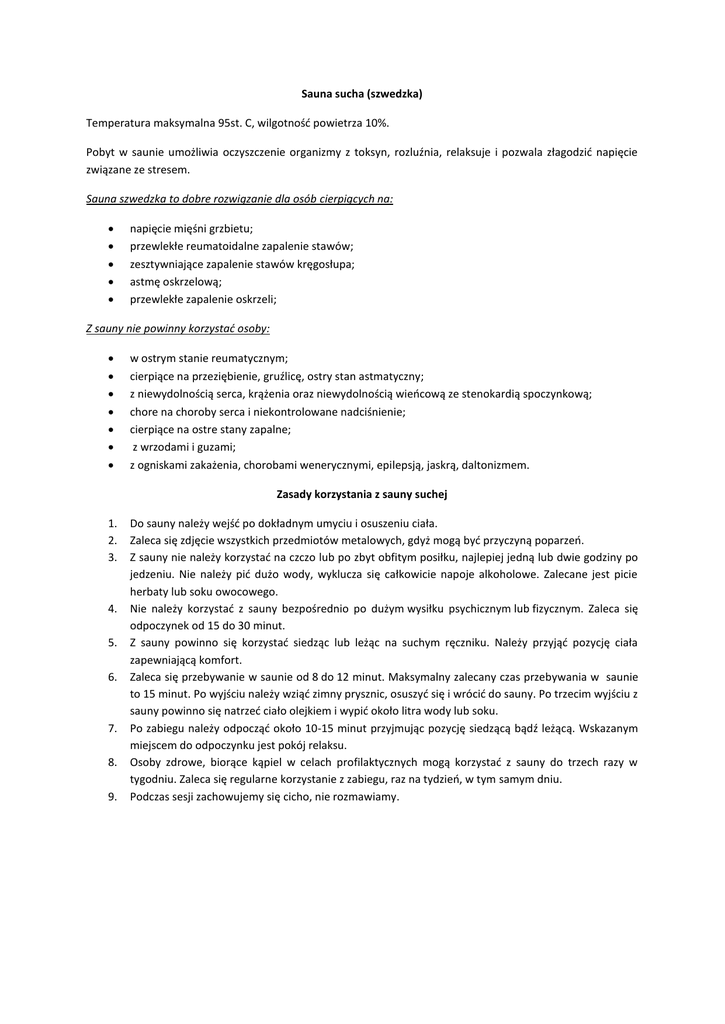 Sauna sucha (szwedzka) Temperatura maksymalna 95st. C, wilgotność powietrza 10%. Pobyt w saunie umożliwia oczyszczenie organizmy z toksyn, rozluźnia, relaksuje i pozwala złagodzić napięcie związane ze stresem. Sauna szwedzka to dobre rozwiązanie dla osób cierpiących na: napięcie mięśni grzbietu; przewlekłe reumatoidalne zapalenie stawów; zesztywniające zapalenie stawów kręgosłupa; astmę oskrzelową; przewlekłe zapalenie oskrzeli; Z sauny nie powinny korzystać osoby: w ostrym stanie reumatycznym; cierpiące na przeziębienie, gruźlicę, ostry stan astmatyczny; z niewydolnością serca, krążenia oraz niewydolnością wieńcową ze stenokardią spoczynkową; chore na choroby serca i niekontrolowane nadciśnienie; cierpiące na ostre stany zapalne; z wrzodami i guzami; z ogniskami zakażenia, chorobami wenerycznymi, epilepsją, jaskrą, daltonizmem. Zasady korzystania z sauny suchej 1. 2. 3. 4. 5. 6. 7. 8. 9. Do sauny należy wejść po dokładnym umyciu i osuszeniu ciała. Zaleca się zdjęcie wszystkich przedmiotów metalowych, gdyż mogą być przyczyną poparzeń. Z sauny nie należy korzystać na czczo lub po zbyt obfitym posiłku, najlepiej jedną lub dwie godziny po jedzeniu. Nie należy pić dużo wody, wyklucza się całkowicie napoje alkoholowe. Zalecane jest picie herbaty lub soku owocowego. Nie należy korzystać z sauny bezpośrednio po dużym wysiłku psychicznym lub fizycznym. Zaleca się odpoczynek od 15 do 30 minut. Z sauny powinno się korzystać siedząc lub leżąc na suchym ręczniku. Należy przyjąć pozycję ciała zapewniającą komfort. Zaleca się przebywanie w saunie od 8 do 12 minut. Maksymalny zalecany czas przebywania w saunie to 15 minut. Po wyjściu należy wziąć zimny prysznic, osuszyć się i wrócić do sauny. Po trzecim wyjściu z sauny powinno się natrzeć ciało olejkiem i wypić około litra wody lub soku. Po zabiegu należy odpocząć około 10-15 minut przyjmując pozycję siedzącą bądź leżącą. Wskazanym miejscem do odpoczynku jest pokój relaksu. Osoby zdrowe, biorące kąpiel w celach profilaktycznych mogą korzystać z sauny do trzech razy w tygodniu. Zaleca się regularne korzystanie z zabiegu, raz na tydzień, w tym samym dniu. Podczas sesji zachowujemy się cicho, nie rozmawiamy.
