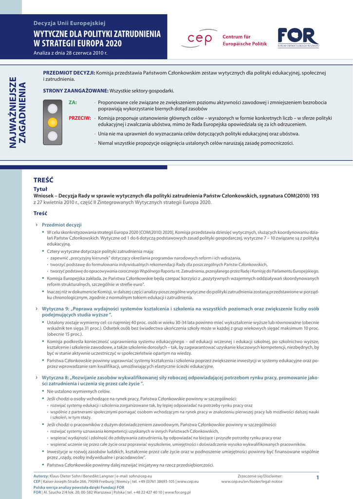 Decyzja Unii Europejskiej WYTYCZNE DLA POLITYKI ZATRUDNIENIA W STRATEGII EUROPA 2020 Analiza z dnia 28 czerwca 2010 r. NAJWAŻNIEJSZE ZAGADNIENIA PRZEDMIOT DECYZJI: Komisja przedstawia Państwom Członkowskim zestaw wytycznych dla polityki edukacyjnej, społecznej i zatrudnienia. STRONY ZAANGAŻOWANE: Wszystkie sektory gospodarki. ZA: ∙ Proponowane cele związane ze zwiększeniem poziomu aktywności zawodowej i zmniejszeniem bezrobocia poprawiają wykorzystanie biernych dotąd zasobów PRZECIW: ∙ Komisja proponuje ustanowienie głównych celów – wyrażonych w formie konkretnych liczb – w sferze polityki edukacyjnej i zwalczania ubóstwa, mimo że Rada Europejska opowiedziała się za ich odrzuceniem. ∙ Unia nie ma uprawnień do wyznaczania celów dotyczących polityki edukacyjnej oraz ubóstwa. ∙ Niemal wszystkie propozycje osiągnięcia ustalonych celów naruszają zasadę pomocniczości. TREŚĆ Tytuł Wniosek – Decyzja Rady w sprawie wytycznych dla polityki zatrudnienia Państw Członkowskich, sygnatura COM(2010) 193 z 27 kwietnia 2010 r., część II Zintegrowanych Wytycznych strategii Europa 2020. Treść ›› Przedmiot decyzji • W celu skonkretyzowania strategii Europa 2020 [COM(2010) 2020], Komisja przedstawia dziesięć wytycznych, służących koordynowaniu działań Państw Członkowskich. Wytyczne od 1 do 6 dotyczą podstawowych zasad polityki gospodarczej, wytyczne 7 – 10 związane są z polityką edukacyjną. • Cztery wytyczne dotyczące polityki zatrudnienia mają: • zapewnić „precyzyjny kierunek” dotyczący określania programów narodowych reform i ich wdrażania, • tworzyć podstawę do formułowania indywidualnych rekomendacji Rady dla poszczególnych Państw Członkowskich, • tworzyć podstawę do opracowywania corocznego Wspólnego Raportu nt. Zatrudnienia, przesyłanego przez Radę i Komisję do Parlamentu Europejskiego. • Komisja Europejska zakłada, że Państwa Członkowskie będą czerpać korzyści z „pozytywnych wzajemnych oddziaływań skoordynowanych reform strukturalnych, szczególnie w strefie euro”. • Inaczej niż w dokumencie Komisji, w dalszej części analizy poszczególne wytyczne do polityki zatrudnienia zostaną przedstawione w porządku chronologicznym, zgodnie z normalnym tokiem edukacji i zatrudnienia. ›› Wytyczna 9: „Poprawa wydajności systemów kształcenia i szkolenia na wszystkich poziomach oraz zwiększenie liczby osób podejmujących studia wyższe ”. • Ustalony zostaje wymierny cel: co najmniej 40 proc. osób w wieku 30-34 lata powinno mieć wykształcenie wyższe lub równoważne (obecnie wskaźnik ten sięga 31 proc.). Odsetek osób bez świadectwa ukończenia szkoły może w każdej z grup wiekowych sięgać maksimum 10 proc. (obecnie 15 proc.). • Komisja podkreśla konieczność usprawnienia systemu edukacyjnego – od edukacji wczesnej i edukacji szkolnej, po szkolnictwo wyższe, kształcenie i szkolenie zawodowe, a także szkolenie dorosłych – tak, by zagwarantować uzyskanie kluczowych kompetencji, niezbędnych, by być w stanie aktywnie uczestniczyć w społeczeństwie opartym na wiedzy. • Państwa Członkowskie powinny usprawniać systemy kształcenia i szkolenia poprzez zwiększenie inwestycji w systemy edukacyjne oraz poprzez wprowadzanie ram kwalifikacji, umożliwiających elastyczne ścieżki edukacyjne. ›› Wytyczna 8: „Rozwijanie zasobów wykwalifikowanej siły roboczej odpowiadającej potrzebom rynku pracy, promowanie jakości zatrudnienia i uczenia się przez całe życie ”. • Nie ustalono wymiernych celów. • Jeśli chodzi o osoby wchodzące na rynek pracy, Państwa Członkowskie powinny w szczególności: • rozwijać systemy edukacji i szkolenia zorganizowane tak, by lepiej odpowiadać na potrzeby rynku pracy oraz • wspólnie z partnerami społecznymi pomagać osobom wchodzącym na rynek pracy w znalezieniu pierwszej pracy lub możliwości dalszej nauki i szkoleń, w tym staży. • Jeśli chodzi o pracowników z dużym doświadczeniem zawodowym, Państwa Członkowskie powinny w szczególności: • rozwijać systemy uznawania kompetencji uzyskanych w innych Państwach Członkowskich, • wspierać wydajność i zdolność do zdobywania zatrudnienia, by odpowiadać na bieżące i przyszłe potrzeby rynku pracy oraz • wspierać uczenie się przez całe życie oraz poprawiać wyszkolenie, umiejętności i doświadczenie wysoko wykwalifikowanych pracowników. • Inwestycje w rozwój zasobów ludzkich, kształcenie przez całe życie oraz w podnoszenie umiejętności powinny być finansowane wspólnie przez „rządy, osoby indywidualne i pracodawców”. • Państwa Członkowskie powinny dalej rozwijać inicjatywy na rzecz przedsiębiorczości. Autorzy: Klaus-Dieter Sohn i Benedikt Langner | e-mail: [email protected] CEP | Kaiser-Joseph-Straße 266, 79098 Freiburg | Niemcy | tel. +49 (0)761 38693-105 | www.cep.eu Polska wersja analizy powstała dzięki Fundacji FOR FOR | Al. Szucha 2/4 lok. 20, 00-582 Warszawa | Polska | tel. +48 22 427 40 10 | www.for.org.pl Zrzeczenie się/Disclaimer: www.cep.eu/en/footer/legal-notice 1 Decyzja Unii Europejskiej WYTYCZNE DLA POLITYKI ZATRUDNIENIA W STRATEGII EUROPA 2020 Analiza z dnia 28 czerwca 2010 r. ›› Wytyczna 7: „Zwiększenie współczynnika aktywności zawodowej i ograniczenie bezrobocia strukturalnego”. • Ustalony zostaje wymierny cel: w 2020 roku 75 proc. osób w wieku 20 – 64 lata powinno mieć zatrudnienie (obecnie 69 proc.). Lepiej zintegrowani na rynku pracy powinni być przede wszystkim ludzie młodzi, pracownicy starsi, osoby niepełnosprawne i legalni migranci. • Państwa Członkowskie powinny zwiększyć współczynnik aktywności zawodowej (stosunek liczby zatrudnionych do liczby zdolnych do pracy), poprzez takie działania jak: • lepszy system podatków i zasiłków, poprawiający konkurencyjność i poziom aktywności zawodowej, w szczególności nisko wykwalifikowanych pracow