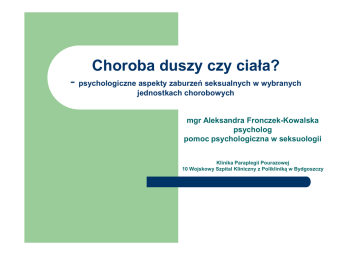 Choroba duszy czy ciała? - psychologiczne aspekty zaburzeń seksualnych w wybranych jednostkach chorobowych mgr Aleksandra Fronczek-Kowalska psycholog pomoc psychologiczna w seksuologii Klinika Paraplegii Pourazowej 10 Wojskowy Szpital Kliniczny z Polikliniką w Bydgoszczy Co to znaczy psychosomatyczny? Psyche oznacza: psychika, soma oznacza: ciało. Psychosomatyczny znaczy zatem: dotyczący zarówno psychiki, jak i ciała. W definicji tej kryje się załoŜenie o wzajemnej zaleŜności tych dwóch elementów. Psychika oddziałuje więc na ciało, ale równieŜ ciało na psychikę. Ten drugi przypadek określa się terminem: zaleŜność somatopsychiczna. „O procesach somatopsychicznych” mówi się wtedy gdy zaburzenia somatyczne wtórnie prowadzą do określonych zmian psychicznych. (Harald J. Freyberger, Wolfgang Schneider) Psyche & Soma prawidłowy obraz „ja” w roli seksualnej satysfakcja z Ŝycia seksualnego dobra samoocena, akceptacja potrzeba miłości, bezpieczeństwa, więzi erotyczne Psyche & Soma brak akceptacji własnego ciała zaburzony obraz „ja” w roli seksualnej brak poczucia bezpieczeństwa niska samoocena rozdźwięk między „ja” idealnym a realnym, między „chcę” a „robię” Zaburzenia psychosomatyczne Zaburzenia psychosomatyczne u kobiet Kiedy kobieta nie moŜe płakać, płacze jej ciało Zaburzenia psychosomatyczne u kobiet bóle podbrzusza dolegliwości sromu dolegliwości pęcherza moczowego miesiączka nietrzymanie moczu antykoncepcja choroby piersi wycięcie macicy bolesne stosunki menopauza Dolegliwości pęcherza moczowego Ból jako moŜliwość czerpania korzyści odmowa współŜycia – usprawiedliwienie „Nie mogę mieć stosunku, a chcę” Bóle podbrzusza Ból jako „mur” obronny (np. rygoryzm religijny) Nietrzymanie moczu Mocz jako symboliczny ekwiwalent łez Mastektomia koncentracja na zmianach w swoim wyglądzie z punktu widzenia medycznego brak przeciwwskazań do udanego Ŝycia seksualnego lęk przed odrzuceniem przez partnera brak akceptacji własnego ciała depresja wstyd, zahamowanie pierś jako atrybut kobiecości” i macierzyństwa sfera erogenna lęk przed bólem obawa przed śmiercią uczucie „pozbawienia płci” Amputacja piersi zawsze odbija się na Ŝyciu psychoseksualnym! Amputacja piersi wyniki badań wykazują, Ŝe 56% kobiet po amputacji piersi ma zaburzenia seksualne problemy z osiągnięciem orgazmu wstyd pokazania się nago przed partnerem uczucie „zniszczenia” amputacja jednej piersi – co druga kobieta nie odczuwa Ŝadnych doznań erotycznych na wysokości klatki piersiowej Atmosfera poŜądania seksualnego zmniejsza się, a nawet zanika! Nowotwory - chemioterapia, radioterapia kobieta zaprzestaje wszelkiej aktywności seksualnej w czasie trwania tego leczenia, a nawet długo po jego przerwaniu, z uwagi na zmęczenie, uczucie pieczenia oraz z powodu strachu, który jej nie opuszcza męŜczyzna stawia sobie wiele pytań i doświadcza wiele obaw – boi się stracić towarzyszkę, boi się takŜe samemu zachorować (mit: rak jest zaraźliwy) jeśli w związku występowały konflikty, nowotwór moŜe je zaostrzyć – o Ŝyciu seksualnym moŜna zapomnieć choroba, strach przed utratą partnera, poczucie winy, Ŝe ja czuję się dobrze, kiedy partnerka jest chora, likwidują napięcia małŜeńskie, ale w takiej atmosferze trudno o poŜądanie! Wycięcie macicy po amputacji piersi kobiety najgorzej znoszą usunięcie macicy związek między przyjemnością a prokreacją jest często bardzo silny – wycięcie macicy nierzadko pociąga za sobą brak zainteresowania Ŝyciem seksualnym Menopauza skłonność do skupiania się na ciele („fale gorąca”, tycie) hipochondria zaburzenia snu, chwiejność nastrojów utrata kobiecości = atrybut młodości samotność syndrom „pustego gniazda” Zaburzenia seksualne a choroby przewlekłe ObniŜony popęd seksualny brak zainteresowania seksem jako zapowiedź choroby ogólny spadek odczuwania poŜądania: obawy związane z przyszłością, zmęczenie, chroniczny ból, złe samopoczucie fizyczne Przyczyny fizjologiczne: zaburzenia hormonalne (u męŜczyzn: niski poziom testosteronu, następstwo terapii hormonalnej stosowanej w leczeniu zaawansowanego raka prostaty – obniŜenie poziomu androgenów (Schover, 1993); u kobiet – menopauza, usunięcie jajników, chemioterapia uszkodzenia CUN (np. wzrost poziomu prolaktyny, ostatnie stadium choroby niewydolności nerek, zaŜywanie leków przeciwbólowych zawierających opiaty bądź fenotiazyny (Schover, Jensen, 1988) ObniŜony popęd seksualny Czynniki psychologiczne ObniŜony popęd seksualny Depresja ObniŜony popęd seksualny Utrata poczucia własnej wartości związana z chorobą ObniŜony popęd seksualny Stereotypy: męŜczyźni – zdolność do zarabiania pieniędzy, utrata sprawności seksualnej, negatywny wpływ choroby na wykonywanie zawodu – „zamach na męskość” ObniŜony popęd seksualny Koncentracja na zmianach w swoim wyglądzie (kobiety), mastektomia – zmiana popędu płciowego u kobiety, ocalenie piersi, rekonstrukcja piersi jako czynniki podnoszące samoocenę, ale nie wpływają na zachowania seksualne, ani na osiągniecie satysfakcji ObniŜony popęd seksualny Utrata poczucia własnej wartości związana z chorobą ObniŜony popęd seksualny Lęki związane z chorobą (Schover, Jensen, 1988) – „fałszywe” obawy, Ŝe rak moŜe być przenoszony drogą płciową; zawał serca, udar – uprawianie seksu moŜe wywołać kolejny kryzys naczyniowo sercowy ObniŜony popęd seksualny Zanik bliskości ObniŜony popęd seksualny Poczucie winy spowodowane takimi zachowaniami seksualnymi w przeszłości jak: romanse, seks jako coś nieczystego, ślubowanie całkowitej wstrzemięźliwości seksualnej w zamian za wyzdrowienie lub przedłuŜenie Ŝycia ObniŜony popęd seksualny Element obrazu siebie struktura Ja (Andersen, Cyranowski, 1995) – spostrzeganie seksualności przez kobiety 
