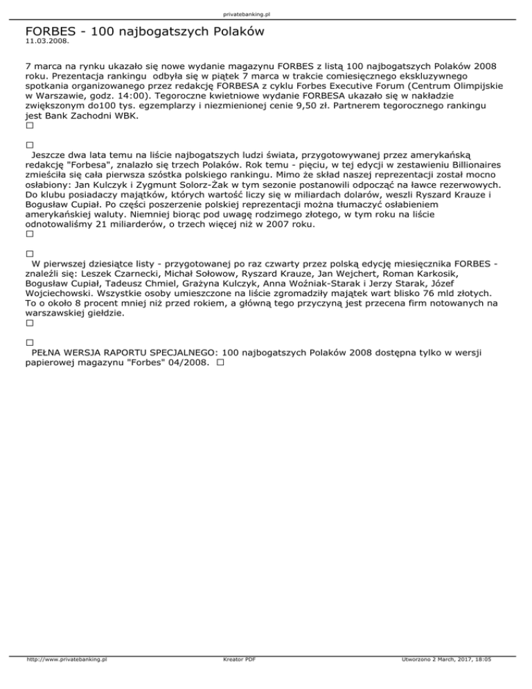 privatebanking.pl FORBES - 100 najbogatszych Polaków 11.03.2008. 7 marca na rynku ukazało się nowe wydanie magazynu FORBES z listą 100 najbogatszych Polaków 2008 roku. Prezentacja rankingu odbyła się w piątek 7 marca w trakcie comiesięcznego ekskluzywnego spotkania organizowanego przez redakcję FORBESA z cyklu Forbes Executive Forum (Centrum Olimpijskie w Warszawie, godz. 14:00). Tegoroczne kwietniowe wydanie FORBESA ukazało się w nakładzie zwiększonym do100 tys. egzemplarzy i niezmienionej cenie 9,50 zł. Partnerem tegorocznego rankingu jest Bank Zachodni WBK. Jeszcze dwa lata temu na liście najbogatszych ludzi świata, przygotowywanej przez amerykańską redakcję "Forbesa", znalazło się trzech Polaków. Rok temu - pięciu, w tej edycji w zestawieniu Billionaires zmieściła się cała pierwsza szóstka polskiego rankingu. Mimo że skład naszej reprezentacji został mocno osłabiony: Jan Kulczyk i Zygmunt Solorz-Żak w tym sezonie postanowili odpocząć na ławce rezerwowych. Do klubu posiadaczy majątków, których wartość liczy się w miliardach dolarów, weszli Ryszard Krauze i Bogusław Cupiał. Po części poszerzenie polskiej reprezentacji można tłumaczyć osłabieniem amerykańskiej waluty. Niemniej biorąc pod uwagę rodzimego złotego, w tym roku na liście odnotowaliśmy 21 miliarderów, o trzech więcej niż w 2007 roku. W pierwszej dziesiątce listy - przygotowanej po raz czwarty przez polską edycję miesięcznika FORBES znaleźli się: Leszek Czarnecki, Michał Sołowow, Ryszard Krauze, Jan Wejchert, Roman Karkosik, Bogusław Cupiał, Tadeusz Chmiel, Grażyna Kulczyk, Anna Woźniak-Starak i Jerzy Starak, Józef Wojciechowski. Wszystkie osoby umieszczone na liście zgromadziły majątek wart blisko 76 mld złotych. To o około 8 procent mniej niż przed rokiem, a główną tego przyczyną jest przecena firm notowanych na warszawskiej giełdzie. PEŁNA WERSJA RAPORTU SPECJALNEGO: 100 najbogatszych Polaków 2008 dostępna tylko w wersji papierowej magazynu "Forbes" 04/2008. http://www.privatebanking.pl Kreator PDF Utworzono 2 March, 2017, 18:05