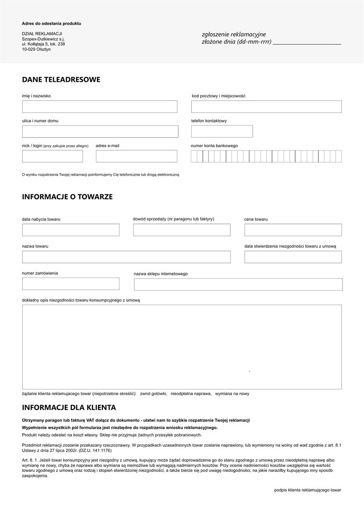 Adres do odesłania produktu zgłoszenie reklamacyjne złożone dnia (dd-mm-rrrr) ___________________________ DZIAŁ REKLAMACJI Szopex-Dutkiewicz s.j. ul. Kołłątaja 5, lok. 238 10-029 Olsztyn DANE TELEADRESOWE imię i nazwisko kod pocztowy i miejscowość ulica i numer domu telefon kontaktowy nick / login (przy zakupie przez allegro) adres e-mail numer konta bankowego O wyniku rozpatrzenia Twojej reklamacji poinformujemy Cię telefonicznie lub drogą elektroniczną. INFORMACJE O TOWARZE data nabycia towaru dowód sprzedaży (nr paragonu lub faktyry) nazwa towaru numer zamówienia cena towaru data stwierdzenia niezgodności towaru z umową nazwa sklepu internetowego dokładny opis niezgodności towaru konsumpcyjnego z umową , żądanie klienta reklamujacego towar (niepotrzebne skreślić): zwrot gotówki, nieodpłatna naprawa, wymiana na nowy INFORMACJE DLA KLIENTA Otrzymany paragon lub fakturę VAT dołącz do dokumentu - ułatwi nam to szybkie rozpatrzenie Twojej reklamacji Wypełnienie wszystkich pól formularza jest niezbędne do rozpatrzenia wniosku reklamacyjnego. Produkt należy odesłać na koszt własny. Sklep nie przyjmuje żadnych przesyłek pobraniowych. Przedmiot reklamacji zostanie przekazany rzeczoznawcy. W przypadkach uzasadnionych towar zostanie naprawiony, lub wymieniony na wolny od wad zgodnie z art. 8.1 Ustawy z dnia 27 lipca 2002r. (DZ.U. 141 1176) Art. 8. 1. Jeżeli towar konsumpcyjny jest niezgodny z umową, kupujący może żądać doprowadzenia go do stanu zgodnego z umową przez nieodpłatną naprawę albo wymianę na nowy, chyba że naprawa albo wymiana są niemożliwe lub wymagają nadmiernych kosztów. Przy ocenie nadmierności kosztów uwzględnia się wartość towaru zgodnego z umową oraz rodzaj i stopień stwierdzonej niezgodności, a także bierze się pod uwagę niedogodności, na jakie naraziłby kupującego inny sposób zaspokojenia. podpis klienta reklamującego towar