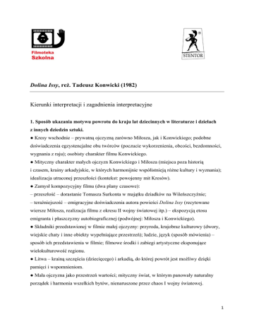 Dolina Issy, reż. Tadeusz Konwicki (1982) Kierunki interpretacji i zagadnienia interpretacyjne 1. Sposób ukazania motywu powrotu do kraju lat dziecinnych w literaturze i dziełach z innych dziedzin sztuki. ● Kresy wschodnie – prywatną ojczyzną zarówno Miłosza, jak i Konwickiego; podobne doświadczenia egzystencjalne obu twórców (poczucie wykorzenienia, obcości, bezdomności, wygnania z raju); osobisty charakter filmu Konwickiego. ● Mityczny charakter małych ojczyzn Konwickiego i Miłosza (miejsca poza historią i czasem, krainy arkadyjskie, w których harmonijnie współistnieją różne kultury i wyznania); idealizacja utraconej przeszłości (kontekst: powojenny mit Kresów). ● Zamysł kompozycyjny filmu (dwa plany czasowe): – przeszłość – dorastanie Tomasza Surkonta w majątku dziadków na Wileńszczyźnie; – teraźniejszość – emigracyjne doświadczenia autora powieści Dolina Issy (recytowane wiersze Miłosza, realizacja filmu z okresu II wojny światowej itp.) – ekspozycją etosu emigranta i płaszczyzny autobiograficznej (podwójnej: Miłosza i Konwickiego). ● Składniki przedstawionej w filmie małej ojczyzny: przyroda, krajobraz kulturowy (dwory, wiejskie chaty i inne obiekty wypełniające przestrzeń); ludzie, język (sposób mówienia) – sposób ich przedstawienia w filmie; filmowe środki i zabiegi artystyczne eksponujące wielokulturowość regionu. ● Litwa – krainą szczęścia (dziecięcego) i arkadią, do której powrót jest możliwy dzięki pamięci i wspomnieniom. ● Mała ojczyzna jako przestrzeń wartości; mityczny świat, w którym panowały naturalny porządek i harmonia wszelkich bytów, nienaruszone przez chaos I wojny światowej. 1 ● Poetycki i oniryczny charakter filmu oraz jego funkcje (wspomnienie, nostalgia, poczucie wydziedziczenia i straty, potrzeba zakorzenienia w tradycji itp.); podkreślenie subiektywnego charakteru rekonstruowanej w filmie (za powieścią) przestrzeni. ● Dolina Issy jako film o zagładzie dawnego świata; idealizacja i mityzacja przeszłości podkreślająca dramat wykorzenienia, wygnania twórców z raju dzieciństwa. ● Konwicki jako autor jednego tematu (do którego powraca w swoich powieściach i filmach): powroty do swej kresowej małej ojczyzny – świata, którego już nie ma. Przykładowe utwory literackie korespondujące z zagadnieniem: ● Adam Mickiewicz, Pan Tadeusz – obraz Litwy i krainy nadniemeńskiej (wraz z należącym do niej światem dawnej szlachty) jako utraconego kraju lat dziecinnych, który jest „święty i czysty”, stanowi przestrzeń szczęśliwych wydarzeń, szczerych uczuć i prawdziwych wartości; istnieje tylko w pamięci stęsknionych emigrantów, a widzieć można go jedynie oczyma duszy. ● Czesław Miłosz, Dolina Issy – nierozerwalny związek przyrody z życiem mieszkańców doliny i znaczenie tego miejsca dla inicjacji w dorosłość młodzieńczego bohatera utworu; natura jako wielka, niezrozumiała siła – piękna i okrutna zarazem; mistrzostwo opisów przyrody. ● Tadeusz Konwicki, Kronika wypadków miłosnych – opowieść o pierwszym wielkim uczuciu dwojga maturzystów oraz ich wchodzeniu w dojrzałość jako pretekst powrotu do „kraju lat dziecinnych” i wspomnień o utraconej arkadii. ● Paweł Huelle, Weiser Dawidek (lub inna powieść z nurtu tzw. literatury „małych ojczyzn”) – opisanie wydarzeń z okresu dzieciństwa usytuowanych w pejzażu przedwojennego Gdańska, będącego utraconą małą ojczyzną autora; wyidealizowana rekonstrukcja nieistniejącego już świata z perspektywy dwudziestu kilku lat. 2. Różne sposoby przedstawienia ponadczasowych zagadnień egzystencjalnych oraz związanych z nimi refleksji w utworach literackich i innych tekstach kultury. ● Nostalgiczny obraz małej ojczyzny Miłosza (i jednocześnie małej ojczyzny reżysera), postrzeganej jako utracony raj dzieciństwa, arkadyjska kraina szczęścia i jego funkcje: – rekonstrukcja wyidealizowanej przeszłości, – zobrazowanie poczucia straty i wykorzenienia, – poszukiwanie zakorzenienia w tradycji, 2 – potrzeba pocieszenia i odzyskania poczucia tożsamości. ● Marzenia o arkadii, miejscu nietkniętym chaosem wojny (historii), gdzie panuje naturalny porządek świata. ● Losy Tomasza Surkonta – opowieść o dojrzewaniu, inicjacji w dorosłość, wtajemniczaniu w naturę, miłość, śmierć. ● Świat jako arena ścierania się sił dobra i zła (historia Baltazara). ● Pytanie o miejsce Boga w życiu ludzi i Jego istotę. ● Opozycja między światem mężczyzn i światem kobiet, różne sfery, do których należą. ● Nierozstrzygnięte pytanie o tożsamość człowieka (korzenie, narodowość, wyznanie, rodzina, język, miejsce zamieszkania, przynależność etniczna itp.). Przykładowe utwory literackie korespondujące z zagadnieniem: ● William Shakespeare, Makbet – dramatyczna, pesymistyczna wizja człowieka, który nie jest w stanie zapanować nad swymi namiętnościami; przeświadczenie, że każdy ma w sobie ziarno zła, które może wykiełkować i zniszczyć człowieka (losy Makbeta ewokują pytanie, co sprawia, że uczciwy człowiek staje się zbrodniarzem); topos świata-teatru, w którym człowiek jest tylko aktorem. ● Juliusz Słowacki, wybrane wiersze (np. Hymn) – wyraz samotności artysty, refleksje o istnieniu, przemijaniu, nicości, relacjach człowieka z Bogiem itp. ● Bolesław Prus, Lalka – Wokulski, Rzecki (a także inni bohaterowie, np. doktor Szuman) snują różnorodne refleksje filozoficzne, np.: ▪ Jaki jest sens egzystencji człowieka? Skąd przybył i dokąd dąży? ▪ Czy posiadanie uczuć i zdolność do miłości są szczęściem czy przekleństwem człowieka? ▪ Czy człowiek jest tylko marionetką w rękach losu? ▪ Jaki sens mają wszelkie starania i pragnienia ludzkie? ▪ Na czym polega szczęście człowieka? Jak je osiągnąć? ▪ Czy człowiek jest wolny w swoich dążeni