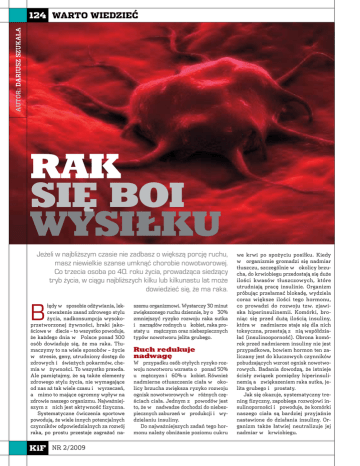 AUTOR: Dariusz Szukała 124 Warto wiedzieć Rak się boi wysiłku Jeżeli w najbliższym czasie nie zadbasz o większą porcję ruchu, masz niewielkie szanse umknąć chorobie nowotworowej. Co trzecia osoba po 40. roku życia, prowadząca siedzący tryb życia, w ciągu najbliższych kilku lub kilkunastu lat może dowiedzieć się, że ma raka. B łędy w sposobie odżywiania, lekceważenie zasad zdrowego stylu życia, nadkonsumpcja wysokoprzetworzonej żywności, braki jakościowe w diecie – to wszystko powoduje, że każdego dnia w Polsce ponad 300 osób dowiaduje się, że ma raka. Tłumaczymy to na wiele sposobów – życie w stresie, geny, utrudniony dostęp do zdrowych i świeżych pokarmów, chemia w żywności. To wszystko prawda. Ale pamiętajmy, że są także elementy zdrowego stylu życia, nie wymagające od nas aż tak wiele czasu i wyrzeczeń, a mimo to mające ogromny wpływ na zdrowie naszego organizmu. Najważniejszym z nich jest aktywność fizyczna. Systematyczne ćwiczenia sportowe powodują, że wiele innych potencjalnych czynników odpowiedzialnych za rozwój raka, po prostu przestaje zagrażać na- KiF nr 2 / 2009 szemu organizmowi. Wystarczy 30 minut zwiększonego ruchu dziennie, by o 30% zmniejszyć ryzyko rozwoju raka sutka i narządów rodnych u kobiet, raka prostaty u mężczyzn oraz niebezpiecznych typów nowotworu jelita grubego. Ruch redukuje nadwagę W przypadku osób otyłych ryzyko rozwoju nowotworu wzrasta o ponad 50% u mężczyzn i 60% u kobiet. Również nadmierne otłuszczenie ciała w okolicy brzucha zwiększa ryzyko rozwoju ognisk nowotworowych w różnych częściach ciała. Jednym z powodów jest to, że w nadwadze dochodzi do niebezpiecznych zaburzeń w produkcji i wydzielaniu insuliny. Do najważniejszych zadań tego hormonu należy obniżanie poziomu cukru we krwi po spożyciu posiłku. Kiedy w organizmie gromadzi się nadmiar tłuszczu, szczególnie w okolicy brzucha, do krwiobiegu przedostają się duże ilości kwasów tłuszczowych, które utrudniają pracę insulinie. Organizm próbując przełamać blokadę, wydziela coraz większe ilości tego hormonu, co prowadzi do rozwoju tzw. zjawiska hiperinsulinemii. Komórki, broniąc się przed dużą ilością insuliny, która w nadmiarze staje się dla nich toksyczna, przestają z nią współdziałać (insulinooporność). Obrona komórek przed nadmiarem insuliny nie jest przypadkowa, bowiem hormon ten zaliczany jest do kluczowych czynników pobudzających wzrost ognisk nowotworowych. Badania dowodzą, że istnieje ścisły związek pomiędzy hiperinsulinemią a zwiększeniem raka sutka, jelita grubego i prostaty. Jak się okazuje, systematyczny trening fizyczny, zapobiega rozwojowi insulinoporności i powoduje, że komórki naszego ciała są bardziej przyjaźnie nastawione do działania insuliny. Organizm także łatwiej neutralizuje jej nadmiar w krwiobiegu. 125 Komórki tłuszczowe mogą sprzyjać nowotworom Głównie za sprawą produkowanej przez nie leptyny – specjalnego białka biorącego między innymi udział w regulacji mechanizmu łaknienia. Leptyna pełni rolę specyficznego przekaźnika informującego mózg o zasobach tkanki tłuszczowej. Jeżeli zapasy są wysokie, komórki tłuszczowe za pomocą leptyny informują ośrodkowy układ nerwowy, że dowóz pokarmu jest wystarczający, co sprzyja zahamowaniu przyjmowania pokarmu. I odwrotnie – gdy komórki tłuszczowe opróżniają swoje zapasy, poziom leptyny spada, a jej brak jest informacją dla mózgu, że pora coś zjeść. Kiedy poznano ten mechanizm, wysunięto hipotezę, że u osób otyłych najprawdopodobniej występuje zbyt niski poziom leptyny, co w efekcie rzutuje nadmiernym apetytem. Niestety, rozpoczęte badania tego nie potwierdziły. Co więcej, okazało się, że komórki tłuszczowe u osób otyłych produkują bardzo duże ilości leptyny, a mimo to mają one wciąż problem z nadmiernym łaknieniem. Dalsze prace badawcze wykazały, że problem tkwi zupełnie w czymś innym – kiedy poziom leptyny utrzymuje się na zbyt wysokim poziomie, komórki mózgowe przestają być wrażliwe na jej działanie, w efekcie czego wciąż wyostrzają apetyt. Zatem nie brak leptyny, lecz oporność mózgu na leptynę okazuje się jedną z głównych przyczyn wzmożonego łaknienia. Znacznie bardziej przyjazne dla leptyny okazują się komórki nabłonka jelitowego, dla których białko to może być ważnym czynnikiem wzrostu, pobudzając ich podział. Niestety ta forma „sympatyzowania” ma jedną poważną wadę – może prowadzić do rozwoju raka. Wszystko wskazuje na to, że nadmiar leptyny, którego wydzielaniu sprzyjają dodatkowo insulinooporność, wysoka podaż cukru i tłuszczu w diecie oraz żeńskie hormony estrogeny, zwiększa zachorowalność na nowotwór jelita grubego. Na szczęście okazuje się, że ryzyko rozwoju niebezpiecznych zmian możemy zminimalizować zwiększając aktywność fizyczną. Tajemnicza ochrona Kluczową rolę w procesie wzrostu oraz podziału komórek odgrywa hormon wzrostu, a dokładniej mówiąc produkowane pod jego wpływem specjalne związki zwane somatomedynami. Szczególnie aktywnie udziela się jeden z nich o nazwie: IGF-1. W organizmie jest on transportowany w połączeniu ze specjalnymi białkami, które przewożą go Aktywność fizyczna stymuluje pracę specjalnych enzymów niszczących wolne rodniki – cząsteczki chemiczne odpowiedzialne m.in. za rozwój wielu niebezpiecznych form raka 9,90 zł/500g nr 2 / 2009 Cena bez kosztów wysyłki 56 zł/3000g KiF www.megabol.pl 126 Warto wiedzieć biet. Wykazano, że im dłuższy okres pomiędzy pierwszą a ostatnią miesiączką w życiu kobiety, tym większa podatność na nowotwór. Mniejszym ryzykiem objęte są więc kobiety, które późno zaczęły miesiączkować oraz u których wcześniej wystąpiła menopauza, gdyż organizm ich krócej narażony był na działanie estrogenów. Poziom żeńskich hormonów zaczyna opada