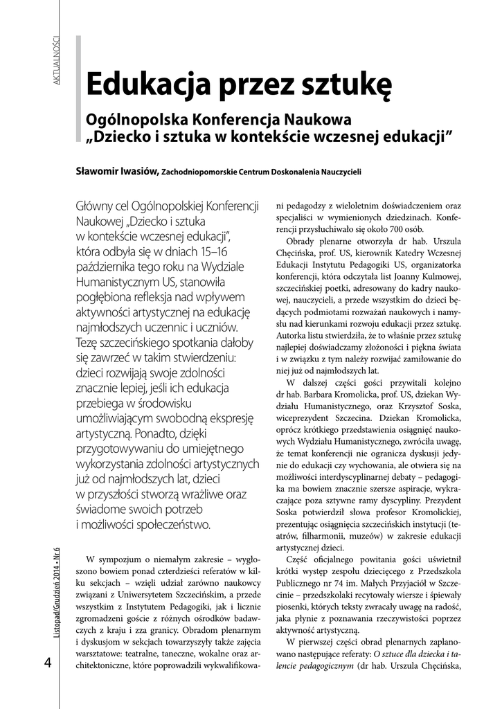 AKTUALNOŚCI Edukacja przez sztukę Ogólnopolska Konferencja Naukowa „Dziecko i sztuka w kontekście wczesnej edukacji” Sławomir Iwasiów, Zachodniopomorskie Centrum Doskonalenia Nauczycieli Listopad/Grudzień 2014 • Nr 6 Główny cel Ogólnopolskiej Konferencji Naukowej „Dziecko i sztuka w kontekście wczesnej edukacji”, która odbyła się w dniach 15–16 października tego roku na Wydziale Humanistycznym US, stanowiła pogłębiona refleksja nad wpływem aktywności artystycznej na edukację najmłodszych uczennic i uczniów. Tezę szczecińskiego spotkania dałoby się zawrzeć w takim stwierdzeniu: dzieci rozwijają swoje zdolności znacznie lepiej, jeśli ich edukacja przebiega w środowisku umożliwiającym swobodną ekspresję artystyczną. Ponadto, dzięki przygotowywaniu do umiejętnego wykorzystania zdolności artystycznych już od najmłodszych lat, dzieci w przyszłości stworzą wrażliwe oraz świadome swoich potrzeb i możliwości społeczeństwo. 4 W sympozjum o niemałym zakresie – wygłoszono bowiem ponad czterdzieści referatów w kilku sekcjach – wzięli udział zarówno naukowcy związani z Uniwersytetem Szczecińskim, a przede wszystkim z Instytutem Pedagogiki, jak i licznie zgromadzeni goście z różnych ośrodków badawczych z kraju i zza granicy. Obradom plenarnym i dyskusjom w sekcjach towarzyszyły także zajęcia warsztatowe: teatralne, taneczne, wokalne oraz architektoniczne, które poprowadzili wykwalifikowa- ni pedagodzy z wieloletnim doświadczeniem oraz specjaliści w wymienionych dziedzinach. Konferencji przysłuchiwało się około 700 osób. Obrady plenarne otworzyła dr hab. Urszula Chęcińska, prof. US, kierownik Katedry Wczesnej Edukacji Instytutu Pedagogiki US, organizatorka konferencji, która odczytała list Joanny Kulmowej, szczecińskiej poetki, adresowany do kadry naukowej, nauczycieli, a przede wszystkim do dzieci będących podmiotami rozważań naukowych i namysłu nad kierunkami rozwoju edukacji przez sztukę. Autorka listu stwierdziła, że to właśnie przez sztukę najlepiej doświadczamy złożoności i piękna świata i w związku z tym należy rozwijać zamiłowanie do niej już od najmłodszych lat. W dalszej części gości przywitali kolejno dr hab. Barbara Kromolicka, prof. US, dziekan Wydziału Humanistycznego, oraz Krzysztof Soska, wiceprezydent Szczecina. Dziekan Kromolicka, oprócz krótkiego przedstawienia osiągnięć naukowych Wydziału Humanistycznego, zwróciła uwagę, że temat konferencji nie ogranicza dyskusji jedynie do edukacji czy wychowania, ale otwiera się na możliwości interdyscyplinarnej debaty – pedagogika ma bowiem znacznie szersze aspiracje, wykraczające poza sztywne ramy dyscypliny. Prezydent Soska potwierdził słowa profesor Kromolickiej, prezentując osiągnięcia szczecińskich instytucji (teatrów, filharmonii, muzeów) w zakresie edukacji artystycznej dzieci. Część oficjalnego powitania gości uświetnił krótki występ zespołu dziecięcego z Przedszkola Publicznego nr 74 im. Małych Przyjaciół w Szczecinie – przedszkolaki recytowały wiersze i śpiewały piosenki, których teksty zwracały uwagę na radość, jaka płynie z poznawania rzeczywistości poprzez aktywność artystyczną. W pierwszej części obrad plenarnych zaplanowano następujące referaty: O sztuce dla dziecka i talencie pedagogicznym (dr hab. Urszula Chęcińska, posłużyła się pojęciem „cyfrowego szarpnięcia”, które – zarówno nauczycielom, jak i osobom odpowiedzialnym za wspomaganie rozwoju zawodowego kadr oświatowych – musi dać do myślenia. Oznacza to między innymi tyle, że nauczyciel nie może ścigać się z postępem technologicznym, ponieważ zawsze będzie skazany na dydaktyczne niepowodzenia. Jak zatem może sobie poradzić? Zdaniem Adamek, każdy nauczyciel powinien, o ile to możliwe, być „przewodnikiem” uczniów po świecie pełnym bodźców płynących między innymi za pośrednictwem mediów. AKTUALNOŚCI Edukacja artystyczna posiada tę zaletę, że – we- Fot. dług profesor Adamek – uwrażliwia na owe bodźce, Michał Orowicz pozwala dokonywać racjonalnych ocen i budować własne systemy wartości. Poza tym współczesna kultura, a także przemiany społeczne, wymagają zupełnie innego niż dotychczas spojrzenia na edukację – dlatego, jak podkreśliła referentka, trzeba przeformułować nauczycielskie powinności, a więc to nie stanie przy tablicy, ale nauka przez doświadczanie świata staje się coraz bardziej potrzebna. Sens takiego działania oddaje pojęcie „giętkości dydaktyki”, ukute przez Stanisława Bortnowskiego, polonistę i dydaktyka literatury. Podsumowując swoją wypowiedź, profesor Adamek podkreśliła, że do przeprowadzenia efektywnych zmian w edukacji – które będą dobre nie tylko dla trwałości systemu, ale przede wszystkim właściwe dla lepszego rozwoju najmłodszych uczniów – „Potrzebny jest mądry nauczyciel, który kocha to, co robi”. Konferencji towarzyszyły także przedsięwzięcia artystyczne – w przerwach można było podziwiać trzy wystawy przygotowane przez artystów i wykładowców Akademii Sztuki w Szczecinie oraz wystawę prac uczniów z niepublicznej szkoły Ars Atelier w Szczecinie. Listopad/Grudzień 2014 • Nr 6 prof. US), Teoretyczne i praktyczne aspekty rozwoju edukacji artystycznej (dr hab. Zbigniew Romańczuk, prof. AS), Jakość edukacji – nauczyciele jako przewodnicy w procesie uczenia się dziecka/ucznia (prof. dr hab. Irena Adamek z Uniwersytetu Pedagogicznego w Krakowie), Od kreatywności do metakompetencji tworzenia – model edukacji dzieci w najmłodszym wieku szkolnym (dr hab. Janina Uszyńska-Jarmoc, prof. UwB), Wielowymiarowość artystycznej twórczości – dziecko w poszukiwaniu mikro- i makroświata (dr hab. Hanna Krauze-Sikorska, prof. UAM, Dlaczego sztuka – plastyka jest potrzebna dziecku w edukacji? (dr hab. Urszula Szuścik, prof. UŚ), Genealogia. Artefakty d