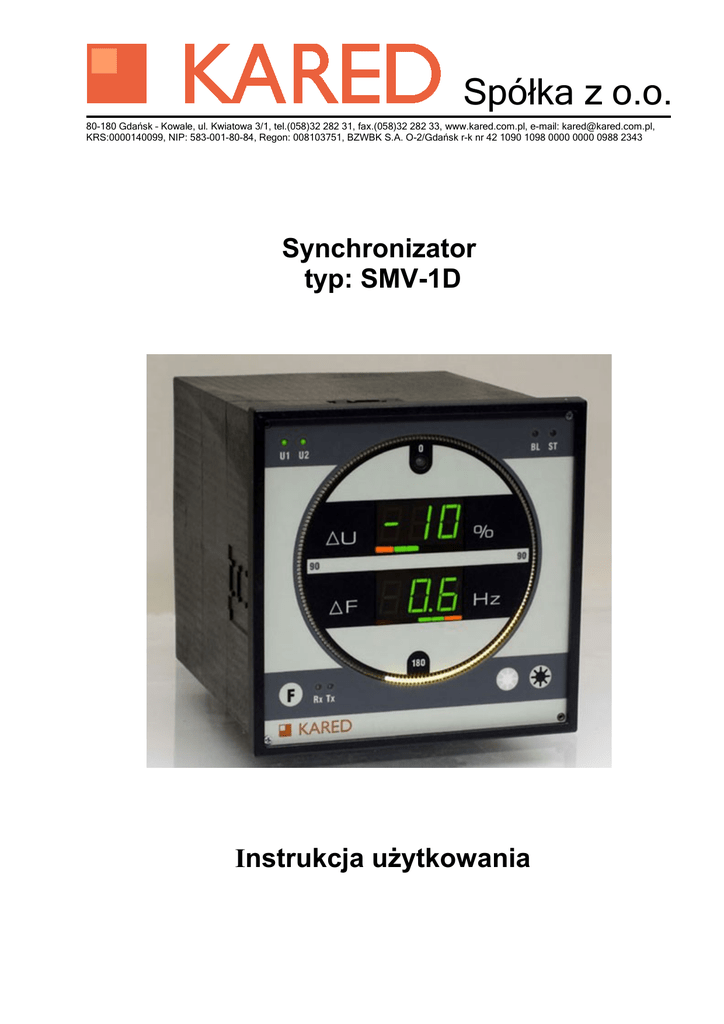 Spółka z o.o. 80-180 Gdańsk – Kowale, ul. Kwiatowa 3/1, tel.(058)32 282 31, fax.(058)32 282 33, www.kared.com.pl, e-mail: [email protected], KRS:0000140099, NIP: 583-001-80-84, Regon: 008103751, BZWBK S.A. O-2/Gdańsk r-k nr 42 1090 1098 0000 0000 0988 2343 Synchronizator typ: SMV-1D Instrukcja użytkowania Synchronizator SMV-1d – Instrukcja użytkowania PUP KARED zastrzega sobie prawo wprowadzania zmian w swoich produktach polegających na doskonaleniu ich cech technicznych. Zmiany te nie zawsze mogą być na bieżąco uwzględniane w dokumentacji. Marki i nazwy produktów wymienione w niniejszej instrukcji stanowią znaki towarowe lub zarejestrowane znaki towarowe, należące odpowiednio do ich właścicieli. Nasz adres: PUP KARED Sp. z o.o. 80-180 Kowale k. Gdańska, ul. Kwiatowa 3/1 telefon: +48-58-322 82 31 fax: +48-58-324 86 46 email: [email protected] www: http://www.kared.com.pl/ Copyright 2009-2010 by PUP Kared. Wszelkie prawa zastrzeżone. PUP KARED Sp. z o.o. IU_SMV-1d_109 wersja: 1.09 Strona 2 Synchronizator SMV-1d – Instrukcja użytkowania Spis treści 1. Znaczenie instrukcji użytkowania................................................................................................5 2. Informacja o zgodności............................................................................................................... 5 3. Zastosowanie urządzenia SMV-1d..............................................................................................6 4. Zasady bezpieczeństwa.............................................................................................................. 6 4.1. Instalacja urządzenia ............................................................................................................... 6 4.2. Uruchomienie urządzenia.........................................................................................................7 4.3. Eksploatacja urządzania.......................................................................................................... 7 4.4. Otwieranie obudowy................................................................................................................. 7 4.5. Obsługa.................................................................................................................................... 7 4.6. Przeróbki i zmiany.................................................................................................................... 7 4.7. Zakłócenia................................................................................................................................ 7 4.8. Tabliczki znamionowe, informacyjne i naklejki.........................................................................8 4.9. Symbole................................................................................................................................... 8 5. Opis techniczny........................................................................................................................... 9 5.1. Opis ogólny.............................................................................................................................. 9 6. Dane techniczne........................................................................................................................ 11 6.1. Warunki środowiskowe........................................................................................................... 11 6.2. Dane o kompletności.............................................................................................................. 11 6.3. Charakterystyka zasilania.......................................................................................................12 6.4. Charakterystyka ogólna wejść................................................................................................12 6.5. Dane wejść pomiarowych.......................................................................................................12 6.6. Dane wejść dwustanowych....................................................................................................13 6.7. Charakterystyka wyjść........................................................................................................... 13 7. Instalacja................................................................................................................................... 13 8. Obsługa..................................................................................................................................... 17 8.1. Obsługa bieżąca..................................................................................................................... 17 8.2. Ręczny odczyt nastaw............................................................................................................ 17 9. Algorytm SMV-1d...................................................................................................................... 18 9.1. Zastosowane symbole............................................................................................................18 9.1. Zastosowane symbole............................................................................................................18 9.2. Nastawy................................................................................................................................. 18 9.3. Definicje................................................................................................................................. 19 9.4. Algorytm działania urządzenia SMV-1d..................................................................................20 10. Komunikacja przez łącze szeregowe.......................................................................................24 10.1. Informacje podstawowe........................................................................................................24 PUP KARED Sp. z o.o. IU_SMV-1d_109 wersja: 1.
