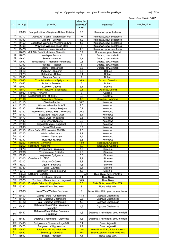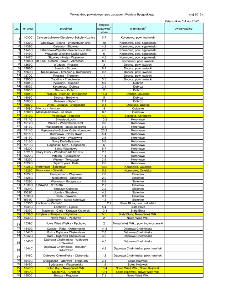 Wykaz dróg powiatowych pod zarządem Powiatu Bydgoskiego maj 2013 r. Załącznik nr 3 A do SIWZ Lp. 1 2 3 4 5 6 7 8 9 10 11 12 13 14 15 16 17 18 19 20 21 22 23 24 25 26 27 28 29 30 31 32 33 34 35 36 37 38 39 40 41 42 43 44 45 46 47 48 49 50 nr drogi przebieg długość całkowita1 w km 1030C Cekcyn-Lubiewo-Cierplewo-Sokole Kuźnica 0,7 Koronowo, pow. tucholski 1137C 1139C 1145C 1146C 1147C 1266C 1267C 1268C 1269C 1270C 1295C 1501C 1502C 1503C 1504C 1505C 1506C 1507C 1508C 1509C 1510C 1511C 1512C 1513C 1514C 1515C 1517C 1518C 1519C 1520C 1521C 1522C 1523C 1524C 1525C 1526C 1527C 1528C 1529C 1530C 1531C 1532C 1533C 1534C 1535C 1536C 1537C 1538C 1539C Obodowo - Sośno - Wierzchucin król. Dziedno - Sitowiec Zabartowo-Wąwelno-Wierzchucin Król. Wąwelno-Wiskitno-Łąsko Małe Sitowiec - Huta - Wąwelno dr k 56 - Serock - Łowin - Zbrachlin Wudzyn - Pruszcz Serock - Stronno Nieściszewo - Trzebień (- Kotomierz) Pruszcz - Trzebień Topólno - Trzeciewiec Pyszczyn - Suponin Kotomierz - Dobrcz Sienno - Dobrcz Trzebień - Niemcz - Bydgoszcz Dobrcz - Borówno Kusowo - Gądecz Włóki - Jarużyn - Bydgoszcz Niemcz - Jarużyn Maksymilianowo - st. kolej. Popielewo - Słupowo Sitowiec-Lucim Wilcze - Wierzchucin Król. Mąkowarsko - stacja kolejowa Mąkowarsko-Sokole Kuźn.-Koronowo Buszkowo - Nowy Dwór Nowy Dwór - Więzowno Nowy Dwór-Byszewo Gogoliński Młyn - Gogolinek Salno-Witoldowo Stary Dwór - Witodowo (dr 1519C)` Wtelno - Gościeradz Wtelno - Tryszczyn Tryszczyn-rz. Brda Koronowo - Żołędowo Koronowo - Osielsko Prosperowo - Wojnowo Trzemiętowo - Sicienko Wojnowo - Bydgoszcz Osówiec - dr 1529C Kruszyn-Osówiec Ugoda - Strzelewo Sitno - Zawada Zielonczyn - stacja kolejowa Łochowo - Zamość Łochowo - Lipniki Trzciniec - Ciele - Kruszyn Krajeński Przyłęki - Olimpin - Kobylarnia Nowa Wieś - Pęchowo 10 4,2 4,5 5 4,3 6,9 3 6,1 0,3 1 5,5 8,8 2,1 2 16,3 5 2,1 9,1 8 0,6 4,9 10,2 9,6 0,1 20,2 5,4 2,5 6,8 6 5,7 7,3 1,4 2,5 2,6 13,9 5,2 7,8 2,9 6,8 2,7 3,2 4,3 3,1 1,3 5,4 10,3 5,5 2 Koronowo, pow. sępoleński Koronowo, pow. sępoleński Koronowo, pow. sępoleński Koronowo, pow. sępoleński Koronowo, pow. sępoleński Koronowo, pow. świecki Dobrcz, pow. świecki Dobrcz, pow. świecki Dobrcz, pow. świecki Dobrcz, pow. świecki Dobrcz, pow. świecki Dobrcz Dobrcz Dobrcz Dobrcz, Osielsko Dobrcz Dobrcz Osielsko, Dobrcz Osielsko Osielsko Sicienko, Koronowo Koronowo Koronowo Koronowo Koronowo Koronowo Koronowo Koronowo Koronowo Koronowo Koronowo Koronowo Koronowo Koronowo Koronowo, Osielsko Koronowo, Osielsko Sicienko Sicienko Sicienko Sicienko Sicienko Sicienko Sicienko Sicienko Białe Błota, pow. nakielski Białe Błota Białe Błota Białe Błota, Nowa Wieś Wlk. Nowa Wieś Wlk. 2,7 w gminach2 51 52 53 54 1539C Nowa Wieś Wielka - Pęchowo 2 Nowa Wieś Wlk., pow. inowrocławski 1540C 1541C 1542C 11,8 2,8 4,6 Dąbrowa Chełmińska Dąbrowa Chełmińska Dąbrowa Chełmińska 55 1543C 4,3 Dąbrowa Chełmińska 56 1544C Czarże - Rafa - Ostromecko Gzin - Dąbrowa Chełmińska Rafa - Dąbrowa Chełmińska Dąbrowa Chełmińska - Wałdowo Królewskie Dąbrowa Chełmińska - Bolumin Skłudzewo 4,8 Dąbrowa Chełmińska, pow. toruński 57 58 59 60 61 62 1545C Dąbrowa Chełmińska - Cichoradz 1,8 Dąbrowa Chełmińska, pow. toruński 1546C 1547C 1548C 1549C 1550C Bydgoszcz - Otorowo - droga 397 Bydgoszcz - Wypaleniska Solec Kuj. - Nowa Wieś Wlk. Solec Kuj. - Chrośna Brzoza - Prądocin 3,4 1,9 13,4 10,4 7,1 Solec Kujawski Solec Kujawski Nowa Wieś Wlk., Solec Kujawski Solec Kujawski, Nowa Wieś Wlk. Nowa Wieś Wlk. uwagi ogólne Wykaz dróg powiatowych pod zarządem Powiatu Bydgoskiego 63 64 65 66 1551C Nowa Wieś Wielka - Leszyce - Dąbrowa M. 5,9 Nowa Wieś Wlk. 1552C 1553C 1554C Tarkowo D. - Dąbrowa Wlk. Wilcza Góra - stacja kolejowa Samsieczno-Gorzeń 7,8 0,2 0,9 Nowa Wieś Wlk. Koronowo Sicienko Dąbrowa Chełmińska, pow. chełmiński Sicienko, pow. Nakielski Sicienko, Koronowo Sicienko, pow. nakielski Białe Błota Solec Kujawski, pow.toruński, pow. inowrocławski 67 68 69 70 71 1601C Kokocko - Czarże - Dąbrowa Chełmińska 9,8 1908C 1909C 1910C 1926C Drzewianowo - Murucin Krukowo-Wierzchucinek-Witoldowo Samsieczynek - Wojnowo Nakło-Gorzeń-Bydgoszcz 2 12,1 9 7,7 72 2033C Cierpice - Rojewo - Inowrocław suma 6 397,5 droga o przebiegu w więcej niż jednej gminie pow. Bydg. maj 2013 r.