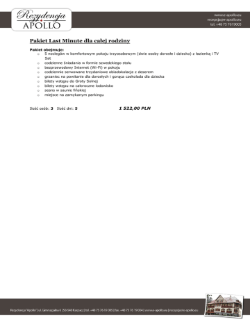 Pakiet Last Minute dla całej rodziny Pakiet obejmuje: o 5 noclegów w komfortowym pokoju trzyosobowym (dwie osoby dorosłe i dziecko) z łazienką i TV Sat o codzienne śniadania w formie szwedzkiego stołu o bezprzewodowy Internet (Wi-Fi) w pokoju o codziennie serwowane trzydaniowe obiadokolacje z deserem o grzaniec na powitanie dla dorosłych i gorąca czekolada dla dziecka o bilety wstępu do Groty Solnej o bilety wstępu na całoroczne lodowisko o seans w saunie fińskiej o miejsce na zamykanym parkingu Ilość osób: 3 Ilość dni: 5 1 522,00 PLN