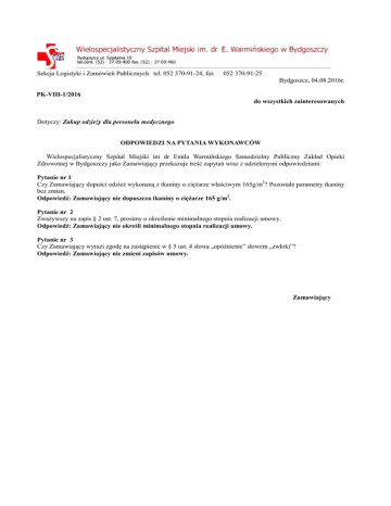 Sekcja Logistyki i Zamówień Publicznych tel. 052 370-91-24, fax 052 370-91-25 Bydgoszcz, 04.08.2016r. PK-VIII-1/2016 do wszystkich zainteresowanych Dotyczy: Zakup odzieży dla personelu medycznego ODPOWIEDZI NA PYTANIA WYKONAWCÓW Wielospecjalistyczny Szpital Miejski im dr Emila Warmińskiego Samodzielny Publiczny Zakład Opieki Zdrowotnej w Bydgoszczy jako Zamawiający przekazuje treść zapytań wraz z udzielonymi odpowiedziami: Pytanie nr 1 Czy Zamawiający dopuści odzież wykonaną z tkaniny o ciężarze właściwym 165g/m2? Pozostałe parametry tkaniny bez zmian. Odpowiedź: Zamawiający nie dopuszcza tkaniny o ciężarze 165 g/m2. Pytanie nr 2 Zważywszy na zapis § 2 ust. 7, prosimy o określenie minimalnego stopnia realizacji umowy. Odpowiedź: Zamawiający nie określi minimalnego stopnia realizacji umowy. Pytanie nr 3 Czy Zamawiający wyrazi zgodę na zastąpienie w § 5 ust. 4 słowa „opóźnienie” słowem „zwłoki”? Odpowiedź: Zamawiający nie zmieni zapisów umowy. Zamawiający