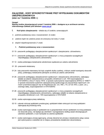 Załącznik do poradnika: Zasady wypełniania dokumentów ubezpieczeniowych ZAŁĄCZNIK - KODY WYKORZYSTYWANE PRZY WYPEŁNIANIU DOKUMENTÓW UBEZPIECZENIOWYCH (stan na 1 kwietnia 2006 r.) Uwaga! Wykazy kodów obowiązujących przed 1 kwietnia 2006 r. dostępne są w archiwum serwisu internetowego Zakładu pod adresem www.zus.pl I. Kod tytułu ubezpieczenia - składa się z 6 znaków, oznaczających: 1) podmiot podstawowy wraz z rozszerzeniem (4 znaki) 2) ustalone bądź nie ustalone prawo do emerytury lub renty (1 znak) 3) stopień niepełnosprawności (1 znak) 1. Podmiot podstawowy wraz z rozszerzeniem: 01 10 - pracownik podlegający ubezpieczeniom społecznym i ubezpieczeniu zdrowotnemu 01 11 - pracownik podlegający ubezpieczeniom społecznym i z mocy przepisów szczególnych niepodlegający ubezpieczeniu zdrowotnemu 01 12 - osoba pobierająca świadczenie szkoleniowe wypłacane po ustaniu zatrudnienia 01 20 - pracownik młodociany 01 24 - były pracownik mianowany lub były urzędnik służby cywilnej, z którym został rozwiązany stosunek pracy, pobierający świadczenie pieniężne za okres po ustaniu zatrudnienia 01 25 - pracownik podlegający ubezpieczeniom społecznym i ubezpieczeniu zdrowotnemu, opłacający składki na własne ubezpieczenia w przypadku określonym w art. 109 rozporządzenia nr 574/72/EWG z dnia 21 marca 1972r. w sprawie wykonywania rozporządzenia (EWG) nr 1408/71 w sprawie stosowania systemów zabezpieczenia społecznego do pracowników najemnych i ich rodzin przemieszczających się we Wspólnocie (Dz. Urz. WE L 74 z 27.03.1972, z późn. zm.), zwanego dalej „rozporządzeniem nr 574/72/EWG 01 26 - pracownik podlegający ubezpieczeniom społecznym i z mocy przepisów szczególnych niepodlegający ubezpieczeniu zdrowotnemu, opłacający składki na własne ubezpieczenia w przypadku określonym w art. 109 rozporządzenia nr 574/72/EW 02 00 - osoba wykonująca pracę nakładczą 03 10 - członek rolniczej spółdzielni produkcyjnej, spółdzielni kółek rolniczych lub innej spółdzielni zajmującej się produkcją rolną 03 20 - osoba wykonująca pracę w spółdzielni lub w gospodarstwie rolnym spółdzielni na innej podstawie niż stosunek pracy, nie będąca jej członkiem i wynagradzana według zasad obowiązujących członków spółdzielni, w tym kandydat na członka spółdzielni 04 11 - osoba wykonująca umowę agencyjną, umowę zlecenia lub umowę o świadczenie usług i praca jest wykonywana w siedzibie lub w miejscu prowadzenia działalności zleceniodawcy Zakład Ubezpieczeń Społecznych 2006 r. Załącznik do poradnika: Zasady wypełniania dokumentów ubezpieczeniowych 04 12 - osoba wykonująca umowę agencyjną, umowę zlecenia lub umowę o świadczenie usług i praca nie jest wykonywana w siedzibie lub w miejscu prowadzenia działalności zleceniodawcy 04 17 - osoba wykonująca umowę agencyjną, umowę zlecenia lub umowę o świadczenie usług i praca jest wykonywana w siedzibie lub w miejscu prowadzenia działalności zleceniodawcy, z mocy przepisów szczególnych niepodlegająca ubezpieczeniu zdrowotnemu 04 18 - osoba wykonująca umowę agencyjną, umowę zlecenia lub umowę o świadczenie usług i praca nie jest wykonywana w siedzibie lub w miejscu prowadzenia działalności zleceniodawcy, z mocy przepisów szczególnych niepodlegająca ubezpieczeniu zdrowotnemu 04 21 - osoba współpracująca z osobą wykonującą umowę agencyjną, umowę zlecenia lub umowę o świadczenie usług i praca jest wykonywana w siedzibie lub w miejscu prowadzenia działalności zleceniodawcy 04 22 - osoba współpracująca z osobą wykonującą umowę agencyjną, umowę zlecenia lub umowę o świadczenie usług i praca nie jest wykonywana w siedzibie lub w miejscu prowadzenia działalności zleceniodawcy 04 24 - osoba współpracująca z osobą wykonującą umowę agencyjną, umowę zlecenia lub umowę o świadczenie usług i praca jest wykonywana w siedzibie lub w miejscu prowadzenia działalności zleceniodawcy, z mocy przepisów szczególnych niepodlegająca ubezpieczeniu zdrowotnemu 04 25 - osoba współpracująca z osobą wykonującą umowę agencyjną, umowę zlecenia lub umowę o świadczenie usług i praca nie jest wykonywana w siedzibie lub w miejscu prowadzenia działalności zleceniodawcy, z mocy przepisów szczególnych niepodlegająca ubezpieczeniu zdrowotnemu 04 26 - osoba wykonująca umowę agencyjną, umowę zlecenia lub umowę o świadczenie usług i praca jest wykonywana w miejscu prowadzenia działalności zleceniodawcy, opłacająca składki na własne ubezpieczenia w przypadku określonym w art. 109 rozporządzenia nr 574/72/EWG 04 27 - osoba wykonująca umowę agencyjną, umowę zlecenia lub umowę o świadczenie usług i praca nie jest wykonywana w miejscu prowadzenia działalności zleceniodawcy, opłacająca składki na własne ubezpieczenia w przypadku określonym w art. 109 rozporządzenia nr 574/72/EWG 04 28 - osoba wykonująca umowę agencyjną, umowę zlecenia lub umowę o świadczenie usług i praca jest wykonywana w miejscu prowadzenia działalności zleceniodawcy, z mocy przepisów szczególnych niepodlegająca ubezpieczeniu zdrowotnemu, opłacająca składki na własne ubezpieczenia w przypadku określonym w art. 109 rozporządzenia nr 574/72/EWG 04 29 - osoba wykonująca umowę agencyjną, umowę zlecenia lub umowę o świadczenie usług i praca nie jest wykonywana w miejscu prowadzenia działalności zleceniodawcy, z mocy przepisów szczególnych niepodlegająca ubezpieczeniu zdrowotnemu, opłacająca składki na własne ubezpieczenia w przypadku określonym w art. 109 rozporządzenia nr 574/72/EWG 05 10 - osoba prowadząca pozarolniczą działalność gospodarczą, dla której podstawę wymiaru składek na ubezpieczenia społeczne stanowi zadeklarowana kwota nie niższa niż 60% kwoty przeciętnego miesięcznego wynagrodzenia 05 11 - osoba współpracująca z osobą prowadzącą pozarolniczą działalność Zakład Ubezpi