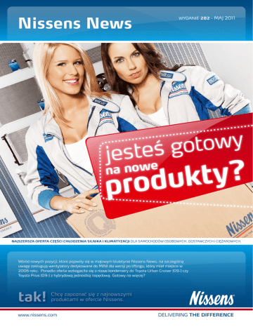 Nissens News wydanie 282 - MAJ 2011 y w o t o g ś e t jes we ? y t k u d o r p na no Najszersza oferta części chłodzenia silnika i klimatyzacji dla samochodów osobowych, dostawczych i ciężarowych. Wśród nowych pozycji, które pojawiły się w majowym biuletynie Nissens News, na szczególną uwagę zasługują wentylatory dedykowane do MINI dla wersji po liftingu, który miał miejsce w 2006 roku. Ponadto oferta wzbogaciła się o nowe kondensery do Toyota Urban Cruiser (09-) czy Toyota Prius (09-) z hybrydową jednostką napędową. Gotowy na więcej? tak! Chcę zapoznać się z najnowszymi produktami w ofercie Nissens. www.nissens.com c iesią j m co ięce Nissens News 282 Maj 2011 e wduktów! z c z jeswych pro no O.E. MAT. RADIATORS SMART For Two (07-) All Models M + 02/07- 451 501 00 01 68451 A/A BMW 5-Series F10 535i (10-) 3.0i M/A +/- 02/10- 1711 7 570 097, 1711 7 562 582 60775 A/A BMW 5-Series GT F07 535i (09-) 3.0i M/A +/- 02/09- 1711 7 570 097, 1711 7 562 582 60775 A/A Opel/Vauxhall Vectra C (02-) 3.0 CDTi M/A + 04/02- 1300 251, 13108569 630742 P/A Opel/Vauxhall Signum (03-) 3.0 CDTi M/A + 04/02- 1300 251, 13108569 630742 P/A 4.2 Supercharged A +/- 05/05- PCC500670 64327 A/A 1.4i-1.4D M/A + 03/09- 88460-52150 940131 A/A All models M/A + 03/09- 88460-74010 940136 A/A 1.8i A 01/09- 88460-47150 940175 A/A Nissan X-Trail (07-) 2.0 D M +/- 06/07- 14461-JG70B, 14461-JG70C 96582 A/A Renault Koleos (08-) 2.0 D M +/- 07/08- 14461-JG70B, 14461-JG70C 96582 A/A MINI 07- Cooper S (06-) M/A +/- 10/06- 1742.2.752.632 85631 P/P MINI 07- Cooper (06-) M/A +/- 10/06- 1742.2.754.854 85632 P/P Range Rover (02-) CONDENSERS Toyota Urban Cruiser (09-) Toyota IQ (09-) Toyota Prius (09-) INTERCOOLERS FANS Nissens nie uznaje kompromisów w zakresie jakości. Wszystkie chłodnice produkowane przez Nissens są projektowane, badane i wytwarzane zgodnie z najwyższymi standardami określanymi przez normy ISO 9001 / TS 16949 oraz spełniają w 100% wymagania OE. W częściach samochodowych wszystko ma znaczenie – stawiamy na jakość. c iesią j m co ięce e wduktów! z c z jeswych pro Nissens News 282 Maj 2011 no Nissens AluXChanger – nowy wymiar wymienników ciepła. W oparciu o zaawansowaną technologię spiekania aluminium, Nissens opracował i zaprojektował rozwiązanie AluXChanger dla wymienników ciepła typu ciecz-ciecz. Spiekanie aluminium oferuje wiele korzyści w porównaniu z konwencjonalnymi wymiennikami ciepła ze stali nierdzewnej, dostępnymi na rynku. AluXChanger to prawdziwa rewolucja. Rozwiązanie Nissens AluXChanger oferuje szereg funkcji produktowo-technicznych, które odróżnia je od tradycyjnych konstrukcji. Był to podstawowy cel podczas naszych prac projektowych, aby sprostać rosnącym wymaganiom klientów. AluXChanger oferuje wiele korzyści oraz pełne dostosowanie do potrzeb konstrukcyjnych klienta. Skontaktuj się znaszym biurem handlowym aby dowiedzieć się więcej na temat produktu. Wszelkie prawa zastrzeżone ©Nissens A/S Chłodnice Nissens Polska sp. z o.o. ul. Syrenia 4, 61-017 Poznań tel. 061 65 35 207 / 208 / 210, fax 061 65 35 209, [email protected] www.nissens.com.pl
