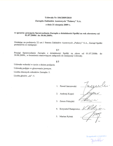 SPRAWOZDANIE ZARZĄDU Z DZIAŁALNOŚCI ZAKŁADÓW AZOTOWYCH „PUŁAWY” SPÓŁKA AKCYJNA za okres 1 lipiec 2008 – 30 czerwiec 2009 sierpień 2009 Sprawozdanie Zarządu z działalności Zakładów Azotowych „Puławy” S.A. za okres 1.07.2008 r. – 30.06.2009 r . _____________________________________________________________________________________________ Spis treści 1. Podstawowe informacje o Spółce w roku obrotowym 2008/2009…............................ 3 1.1. Informacje ogólne.............................................................................................................. 3 1.2. Wybrane dane finansowe.................................................................................................. 4 1.3. Organizacja....................................................................................................................... 5 1.4. Silne i słabe strony……………………………………………………………................ 6 1.5. Analiza pozycji rynkowej………………………………………………………………. 7 2. Działalność Spółki w roku obrotowym 2008/2009…................................................... 9 2.1. Wyniki Spółki w roku obrotowym 2008/2009…............................................................. 9 2.2. Ważniejsze czynniki i zdarzenia mające znaczący wpływ na działalność, wyniki i rozwój Spółki.................................................................................................................... 12 2.3. Polityka handlowa i sprzedaż........................................................................................... 19 2.4. Zaopatrzenie w surowce strategiczne............................................................................... 23 2.5. Produkcja........................................................................................................................... 24 2.6. Polityka finansowa i zarządzanie ryzykiem finansowym................................................. 24 2.7 Majątek trwały Spółki………………………………………………………………….. 28 2.8. Działalność inwestycyjna.................................................................................................. 29 2.9. Sytuacja Spółki na rynku kapitałowym............................................................................. 33 3. Zasoby niematerialne...................................................................................................... 35 3.1. Relacje z klientami............................................................................................................ 35 3.2. Polityka personalna............................................................................................................ 35 3.3. Ochrona środowiska.......................................................................................................... 36 3.4. Badanie i rozwój................................................................................................................ 38 3.5. Pozycja Spółki w rankingach............................................................................................ 39 3.6. Działania na rzecz otoczenia Spółki, sponsoring, darowizny…………………………... 40 4. Szanse, zagrożenia, ryzyka.............................................................................................. 42 5. Przewidywana sytuacja finansowa …………………………....................................... 45 5.1. Przewidywana sytuacja finansowa……………………………………………………… 45 6. Inne ważne informacje.................................................................................................... 46 7. Oświadczenie o stosowaniu ładu korporacyjnego…………………………………… 53 Załącznik Nr 1 Zasady polityki sponsoringowej 2 Sprawozdanie Zarządu z działalności Zakładów Azotowych „Puławy” S.A. za okres 1.07.2008 r. – 30.06.2009 r . _____________________________________________________________________________________________ 1. Podstawowe informacje o Spółce w roku obrotowym 2008/2009 (1.07.2008 r. – 30.06.2009 r.) NAZWA I SIEDZIBA: Zakłady Azotowe "Puławy" Spółka Akcyjna Al. Tysiąclecia Państwa Polskiego 13 24-110 Puławy 1.1. Informacje ogólne FORMA PRAWNA CZAS TRWANIA Spółka Akcyjna posiadająca osobowość prawną zgodnie z prawem polskim. Nieograniczony. WPIS DO KRAJOWEGO REJESTRU SĄDOWEGO Spółka wpisana jest do Krajowego Rejestru Sądowego prowadzonego przez Sąd Rejonowy w Lublinie, XI Wydział Gospodarczy, numer KRS: 0000011737 pod nazwą Zakłady Azotowe „Puławy” Spółka Akcyjna. PODSTAWOWY PRZEDMIOT DZIAŁANIA SPÓŁKI 1. Produkcja podstawowych chemikaliów, nawozów i związków azotowych, tworzyw sztucznych i kauczuku syntetycznego w formach podstawowych; 2. Produkcja pozostałych wyrobów chemicznych; 3. Produkcja włókien chemicznych; 4. Produkcja wyrobów z gumy i tworzyw sztucznych; 5. Wytwarzanie i zaopatrywanie w energię elektryczną, gaz, parę wodną, gorącą wodę i powietrze do układów klimatyzacyjnych; 6. Dostawa wody; gospodarowanie ściekami i odpadami oraz działalność związana z rekultywacją; 7. Handel hurtowy, z wyłączeniem handlu pojazdami samochodowymi; 8. Handel detaliczny, z wyłączeniem handlu detalicznego pojazdami samochodowymi. OFERTA HANDLOWA Produkty nawozowe: Roztwór saletrzano-mocznikowy (RSM) Saletra amonowa Mocznik Siarczan amonu Produkty nienawozowe: Melamina Kaprolaktam ciekły i stały Nadtlenek wodoru AdBlue® - 32,5% roztwór mocznika Ciekły dwutlenek węgla Suchy lód Amoniak ciekły Kwas azotowy Wodór sprężony Energia elektryczna Energia cieplna Inne Jednostki emisji zredukowanej ERU Uprawnienia do emisji EUA 3 Sprawozdanie Zarządu z działalności Zakładów Azotowych „Puławy” S.A. za okres 1.07.2008 r. – 30.06.2009 r . ______________________