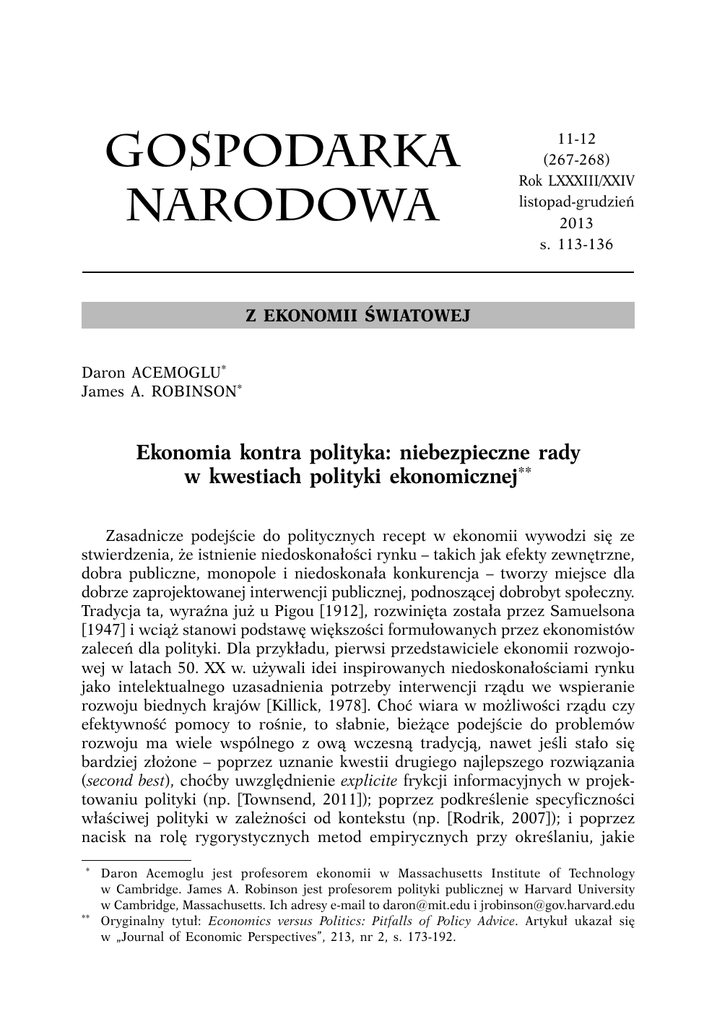 GOSPODARKA NARODOWA 11-12 (267-268) Rok LXXXIII/XXIV listopad-grudzień 2013 s. 113-136 Z EKONOMII ŚWIATOWEJ Daron ACEMOGLU* James A. ROBINSON* Ekonomia kontra polityka: niebezpieczne rady w kwestiach polityki ekonomicznej** Zasadnicze podejście do politycznych recept w ekonomii wywodzi się ze stwierdzenia, że istnienie niedoskonałości rynku – takich jak efekty zewnętrzne, dobra publiczne, monopole i niedoskonała konkurencja – tworzy miejsce dla dobrze zaprojektowanej interwencji publicznej, podnoszącej dobrobyt społeczny. Tradycja ta, wyraźna już u Pigou [1912], rozwinięta została przez Samuelsona [1947] i wciąż stanowi podstawę większości formułowanych przez ekonomistów zaleceń dla polityki. Dla przykładu, pierwsi przedstawiciele ekonomii rozwojowej w latach 50. XX w. używali idei inspirowanych niedoskonałościami rynku jako intelektualnego uzasadnienia potrzeby interwencji rządu we wspieranie rozwoju biednych krajów [Killick, 1978]. Choć wiara w możliwości rządu czy efektywność pomocy to rośnie, to słabnie, bieżące podejście do problemów rozwoju ma wiele wspólnego z ową wczesną tradycją, nawet jeśli stało się bardziej złożone – poprzez uznanie kwestii drugiego najlepszego rozwiązania (second best), choćby uwzględnienie explicite frykcji informacyjnych w projektowaniu polityki (np. [Townsend, 2011]); poprzez podkreślenie specyficzności właściwej polityki w zależności od kontekstu (np. [Rodrik, 2007]); i poprzez nacisk na rolę rygorystycznych metod empirycznych przy określaniu, jakie * ** Daron Acemoglu jest profesorem ekonomii w Massachusetts Institute of Technology w Cambridge. James A. Robinson jest profesorem polityki publicznej w Harvard University w Cambridge, Massachusetts. Ich adresy e-mail to [email protected] i [email protected] Oryginalny tytuł: Economics versus Politics: Pitfalls of Policy Advice. Artykuł ukazał się w „Journal of Economic Perspectives”, 213, nr 2, s. 173-192. 114 GOSPODARKA NARODOWA Nr 11-12/2013 rodzaje interwencji mogą być efektywne (np. [Banerjee, Duflo, 2011]). Jednak we wszystkich tych podejściach kwestie polityczne są w zasadzie nieobecne. Takie zaniedbanie kwestii politycznych uzasadniane jest często – wyraźnie lub milcząco – na jeden z trzech sposobów. Pierwszy to utrzymywanie, że politycy są w zasadzie zainteresowani, lub do tego się ich skłania, by działać na rzecz dobrobytu społecznego – na przykład dlatego, że polityka efektywna społecznie jest tym właśnie, co pozwala politykom pozostać przy władzy lub zostać ponownie wybranymi, tak jak w modelach Whitmana [1989, 1995] oraz Mulligana i Tsui’ego [2006, 2008]. Drugi sposób to postrzeganie czynników politycznych jako losowych, rzucających tylko potencjalnie poważny, lecz niesystematyczny piasek w koła mechanizmu polityki ekonomicznej (np. Sachs, [2005], albo jak u Bannerjee [2012] argument, że polityka ekonomiczna liberyjskiego dyktatora, Samuela Doe, była katastrofalna, ponieważ nie rozumiał on, „na czym polega bycie prezydentem”). W trzecim uzasadnieniu uznaje się, że ekonomia polityczna ma znaczenie, lecz utrzymuje, że „dobra ekonomia to dobra polityka”, mając na myśli, że dobra polityka ekonomiczna siłą rzeczy rozluźnia ograniczenia polityczne (np. [Boycko, Shleifer, Vishny, 1995], [Banerjee, Duflo, 2011, zwłaszcza na s. 261], [Sachs i in., 2004]). Wniosek jest taki sam jak w poprzednich dwóch podejściach: można niezachwianie wspierać dobrą politykę ekonomiczną, mając pewność, że nie tylko rozwiąże ona problem niedoskonałości rynku, ale także uruchomi dobroczynne siły polityczne – czymkolwiek miałyby one być. W tym artykule twierdzimy nie tylko, że doradztwo ekonomiczne ignoruje politykę na własne ryzyko, ale również, że istnieją systematycznie działające siły, które czasami przekształcają dobrą ekonomię w złą politykę, przy czym to drugie, niestety, często przeważa nad dobrem ekonomicznym. Oczywiście nie twierdzimy, że doradztwo ekonomiczne powinno wzdragać się przed identyfikowaniem niedoskonałości rynku i wskazywaniem kreatywnych sposobów ich przezwyciężenia; nie sugerujemy też całkowitego odejścia od dobrej polityki gospodarczej. Argumentujemy raczej, że analiza ekonomiczna musi – teoretycznie i empirycznie – identyfikować warunki, przy których polityka i ekonomia popadają w konflikt, a następnie oceniać propozycje w zakresie polityki, biorąc pod uwagę ów konflikt i wynikające z niego potencjalne skutki uboczne. Nasz podstawowy argument jest prosty: istniejąca równowaga polityczna może nie być niezależna względem pewnej niedoskonałości rynku; tak naprawdę może zasadniczo na niej się opierać. Wobec związków zawodowych wykorzystujących pozycję monopolistyczną i podnoszących płace swych członków, wielu ekonomistów zalecałoby zniesienie lub ograniczenie możliwości wykorzystania przez związki tej władzy monopolistycznej, co w pewnych okolicznościach stanowi bez wątpienia właściwą politykę. Ale związki nie wpływają jedynie na sposób, w jaki funkcjonuje rynek pracy; mają one również istotne implikacje dla systemu politycznego. Z historycznego punktu widzenia związki odgrywały kluczową rolę w tworzeniu demokracji w wielu częściach świata, zwłaszcza w Europie Zachodniej; zakładały one, finansowały i wspierały partie polityczne, takie jak Partia Pracy w Wielkiej Brytanii lub socjaldemokratyczne ugrupo- Daron Acemoglu, James A. Robinson, Ekonomia kontra polityka: niebezpieczne rady… 115 wania w Skandynawii, które wywarły duży wpływ na politykę publiczną oraz zasięg podatków i redystrybucję dochodu, często równoważąc władzę polityczną interesów biznesowych i elit politycznych o ustalonej pozycji. Ponieważ wyższe płace, jakie związki zawodowe uzyskują dla swych członków, są jednym z głównych powodów, dla których ludzie zapisują