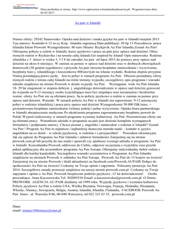 Dane pochodzą ze strony: http://www.ogloszenia.wirtualnaskandynawia.pl/. Wygenerowano dnia: 02-03-2017. Au pair w Islandii Numer oferty: 29242 Stanowisko: Opieka nad dziećmi i nauka języka/Au pair w Islandii/sierpień 2015 Typ umowy: Kontrakt 6-12 m-cy Kraj: Islandia zagranicą Data publikacji: 20 lip 15 Pracodawca: praca Islandia klient Prowork Wynagrodzenie: 80 euro Miasto: Reykjavik Au Pair Islandia.Zostań Au Pair! Oferujemy pobyty u rodzin w Islandii, kursy językowe i prace au pair przy opiece nad dziećmi. Ofery róznych rodzin w Reykiaviku i na terenie całej Islandi.Get inspired by Island! Opis stanowiska Rodzina islandzka z 3 dzieci w wieku 3, 5 I 8 lat zatrudni Au pair od lipca 2015 do pomocy przy opiece nad dziećmi na okres 6 miesięcy. W zamian za pomoc w opiece nad dziećmi oraz w drobnych obowiązkach domowych (30 godzin tygodniowo ) przyszła Au pair otrzyma bezplatne zamieszkanie i wyzywienie, bezplatny kurs j. islandzkiego i kieszonkowe 80Euro/tydz na własne wydatki. Rodzina chętnie przyjmie Nianię posiadającą prawo jazdy. Jest to pobyt w ramach programu Au Pair. Obecnie posiadamy oferty róznych rodzin z terenu całej Islandii na różńe terminy wyjazdu, szczególowy opis programu i warunki udziału znajdziesz na stronie Prowork w dziale wyjazdy Au Pair. Wymagania wiek Au Pair Islandia 18- 29 lat znajomość w stopniu dobrym j. angielskiego doświadczenie w opiece nad dziećmi gotowość do wyjazdu na 9-12 miesięcy osoba wyjeżdżająca musi być niepaląca oraz niezamężna i bezdzietna ważne: oferty Au Pair nie są ofertami pracy. Są to pobyty językowe u rodzin w zamian za pomoc przy opiece nad dziećmi. Warunki W ramach pobytu Au Pair w Islandii ma zapewnione: 9-12 miesięczny pobyt w rodzinie irlandzkiej i pracę przy opiece nad dziećmi Wynagrodzenie 50 000 ISK/mies. + gwarantowane bezpłatne zamieszkanie (własny pokój) i pełne wyżywienie. Opieka biura partnerskiego w Islandii ubezpieczenie medyczne Po ukońćzeniu programu zagwarantowany bezpłatny powrót do Polski Wyjazd realizowany w ramach programu wymiany kulturowej Au Pair. Prezentowane oferty nie są ofertami pracy. Warunkiem udziału w programie au pair jest złożenie kompletu wymaganych formularzy i podpisanie umowy. Chcesz poznać j. angielski i zamieszkać z rodzina w Islandii? Zostań Au Pair ! Program Au Pair to najtańsza i najbardziej skuteczna metoda nauki – kontakt w języku angielskim na co dzień – w szkole językowej, w rodzinie i z przyjaciółmi! Procedura rekrutacyjna Jak się zgłosić do Programu Au Pair Islandia i załatwić formalności Zarejestruj się na stronie prowork.com.pl lub przyślij do nas maila i sprawdź czy spełniasz wymogi udziału w programie Au Pair w Islandii. Konsultantka Prowork oddzwoni do Ciebie, odpowie na pytania o wyjeździe oraz prześle pakiet aplikacyjny dla uczestników programu Au Pair Europa. Oferujemy indywidualny dobór rodzin z Islandii dla każdej kandydatki. Szczegółowe warunki uczestnictwa w Programie Au Pair Islandia znajdziecie na stronach Prowork w zakładce Au Pair Europa. Prowork Au Pair do 15 krajów na świecie! Zarejestruj się na stronie Prowork i śledź aktualności na facebook.com/Prowork.AUPAIR Dołącz do społeczności Au Pair na świecie! Czekamy na Twoje opinie i zapytania. Polecamy promocje Au Pair 2014. Szczegółowe zasady promocji znajdziesz na naszej stronie prowork.com.pl Czekamy na Twoje zapytanie i opinie o Au Pair. Prowork bezpieczne podróże językowe -15 lat doświadczenia! Osoba prowadząca: Anna Kaczorowska Tel: 502095536 Email: [email protected] O firmie: PROWORK AGENCJA AU PAIR działamy od 1999 roku. Wyjazdy językowe i wymiana kulturowa Pobyty językowe Au Pair u rodzin USA, Wielka Brytania, Norwegia, Francja, Holandia, Hiszpania, Włochy, Niemcy, Szwajcaria, Belgia, Austria, Islandia, Irlandia, Finlandia, FACEBOOK Prowork Au Pair biuro: ul. Warecka 8/46, 00-040 Warszawa, tel 022 323 63 35, prowork.com.pl Dane: email: [email protected] Dane pochodzą ze strony: http://www.ogloszenia.wirtualnaskandynawia.pl/. Wygenerowano dnia: 02-03-2017. Miejscowość: Reykjavik Region: Islandia