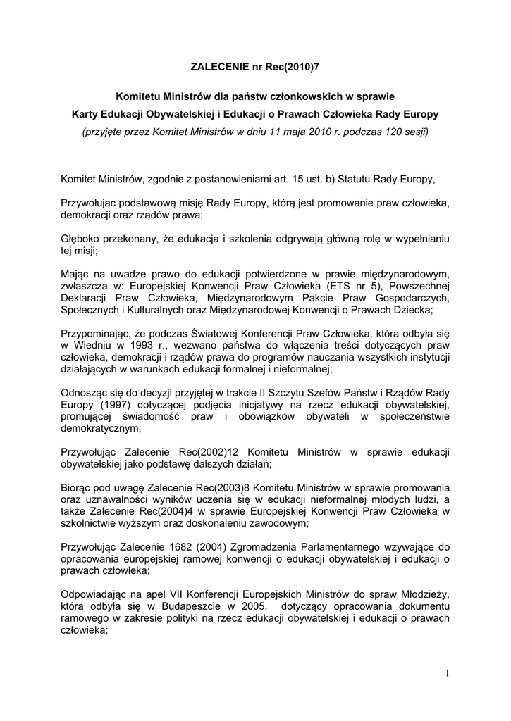 ZALECENIE nr Rec(2010)7 Komitetu Ministrów dla państw członkowskich w sprawie Karty Edukacji Obywatelskiej i Edukacji o Prawach Człowieka Rady Europy (przyjęte przez Komitet Ministrów w dniu 11 maja 2010 r. podczas 120 sesji) Komitet Ministrów, zgodnie z postanowieniami art. 15 ust. b) Statutu Rady Europy, Przywołując podstawową misję Rady Europy, którą jest promowanie praw człowieka, demokracji oraz rządów prawa; Głęboko przekonany, że edukacja i szkolenia odgrywają główną rolę w wypełnianiu tej misji; Mając na uwadze prawo do edukacji potwierdzone w prawie międzynarodowym, zwłaszcza w: Europejskiej Konwencji Praw Człowieka (ETS nr 5), Powszechnej Deklaracji Praw Człowieka, Międzynarodowym Pakcie Praw Gospodarczych, Społecznych i Kulturalnych oraz Międzynarodowej Konwencji o Prawach Dziecka; Przypominając, że podczas Światowej Konferencji Praw Człowieka, która odbyła się w Wiedniu w 1993 r., wezwano państwa do włączenia treści dotyczących praw człowieka, demokracji i rządów prawa do programów nauczania wszystkich instytucji działających w warunkach edukacji formalnej i nieformalnej; Odnosząc się do decyzji przyjętej w trakcie II Szczytu Szefów Państw i Rządów Rady Europy (1997) dotyczącej podjęcia inicjatywy na rzecz edukacji obywatelskiej, promującej świadomość praw i obowiązków obywateli w społeczeństwie demokratycznym; Przywołując Zalecenie Rec(2002)12 Komitetu Ministrów w sprawie edukacji obywatelskiej jako podstawę dalszych działań; Biorąc pod uwagę Zalecenie Rec(2003)8 Komitetu Ministrów w sprawie promowania oraz uznawalności wyników uczenia się w edukacji nieformalnej młodych ludzi, a także Zalecenie Rec(2004)4 w sprawie Europejskiej Konwencji Praw Człowieka w szkolnictwie wyższym oraz doskonaleniu zawodowym; Przywołując Zalecenie 1682 (2004) Zgromadzenia Parlamentarnego wzywające do opracowania europejskiej ramowej konwencji o edukacji obywatelskiej i edukacji o prawach człowieka; Odpowiadając na apel VII Konferencji Europejskich Ministrów do spraw Młodzieży, która odbyła się w Budapeszcie w 2005, dotyczący opracowania dokumentu ramowego w zakresie polityki na rzecz edukacji obywatelskiej i edukacji o prawach człowieka; 1 Pragnąc przyczynić się do osiągnięcia celów przyjętego przez Zgromadzenie Ogólne ONZ w 2005 r. Światowego Programu na Rzecz Edukacji o Prawach Człowieka, którego Rada Europy jest regionalnym partnerem w Europie ; Chcąc wykorzystać doświadczenia nabyte w 2005 r. podczas Europejskiego Roku Edukacji Obywatelskiej, w trakcie którego państwa członkowskie i organizacje pozarządowe przedstawiły wiele przykładów dobrych praktyk w zakresie edukacji obywatelskiej i edukacji o prawach człowieka, a także dążąc do ich zebrania, usystematyzowania i rozpowszechnienia w całej Europie; Mając świadomość, że państwa członkowskie są odpowiedzialne za organizację własnych systemów edukacji i treści programów nauczania; Uznając kluczową rolę, jaką w obszarze edukacji obywatelskiej i edukacji o prawach człowieka odgrywają organizacje pozarządowe i młodzieżowe, oraz pragnąc wesprzeć je w tych działaniach, Zaleca rządom państw członkowskich, by: – wdrażały działania wynikające z postanowień Karty Edukacji Obywatelskiej i Edukacji o Prawach Człowieka Rady Europy, przedstawionych w załączniku do niniejszego zalecenia; – zapewniły szerokie rozpowszechnienie Karty wśród władz odpowiedzialnych za edukację i młodzież; Poleca Sekretarzowi Generalnemu, by przekazał niniejsze zalecenie: – rządom państw-sygnatariuszy Europejskiej Konwencji Kulturalnej (ETS nr 18), które nie są państwami członkowskimi Rady Europy; – organizacjom międzynarodowym. Załącznik do Zalecenia Komitetu Ministrów Rec(2010)7 Karta Edukacji Obywatelskiej i Edukacji o Prawach Człowieka Rady Europy Przyjęta w ramach Zalecenia Rec(2010)7 Komitetu Ministrów Rozdział I – Postanowienia ogólne 1. Zakres Niniejsza Karta dotyczy edukacji obywatelskiej i edukacji o prawach człowieka zgodnie z definicją zawartą w pkt 2. Nie odnosi się ona bezpośrednio do powiązanych z nią obszarów takich jak: edukacja międzykulturowa, edukacja równych szans, edukacja na rzecz zrównoważonego rozwoju i edukacja dla pokoju, poza tymi, w których się pokrywają i wchodzą w interakcję z edukacją obywatelską i edukacją o prawach człowieka. 2 2. Definicje Na użytek niniejszej Karty: a. „Edukacja obywatelska” oznacza edukację, szkolenia, podnoszenie świadomości, informowanie oraz działania, których celem jest wyposażenie uczących się w wiedzę, umiejętności oraz kształtowanie ich postaw i zachowań mających wzmacniać realizację oraz obronę praw i obowiązków, poszanowanie różnorodności wraz z odgrywaniem aktywnej roli w społeczeństwie demokratycznym przy jednoczesnym promowaniu i ochronie demokracji oraz rządów prawa. b. „Edukacja o prawach człowieka” oznacza edukację, szkolenia, podnoszenie świadomości, informowanie oraz działania, których celem jest wyposażenie uczących się w wiedzę, umiejętności oraz kształtowanie ich postaw i zachowań służących wzmocnieniu udziału tych osób w działaniach na rzecz budowania i obrony powszechnej kultury praw człowieka w społeczeństwie, mając na uwadze promowanie i ochronę praw człowieka i podstawowych wolności. c. „Edukacja formalna” oznacza ustrukturyzowany system kształcenia i szkolenia zaczynający się od poziomu przedszkolnego i podstawowego, poprzez szkoły gimnazjalne i ponadgimnazjalne1 aż po uniwersytet. Z zasady odbywa się w ramach instytucji kształcenia ogólnego i zawodowego, oraz prowadzi do uzyskania świadectwa . d. „Edukacja nieformalna” oznacza wszelkie, realizowane poza edukacją formalną zaplanowane formy edukacyjne opracowane w celu poszerzenia umiejętności i kompetencji . e. „Edukacja pozaformalna” oznacza trwający ca