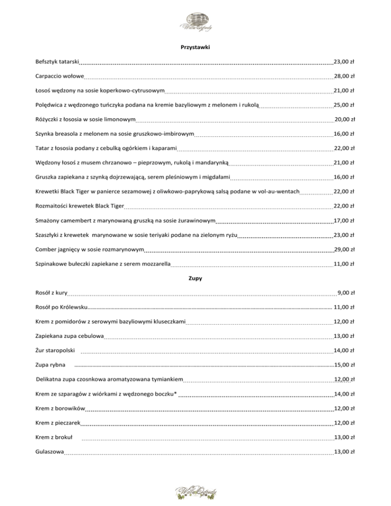 Przystawki Befsztyk tatarski 23,00 zł Carpaccio wołowe 28,00 zł Łosoś wędzony na sosie koperkowo-cytrusowym 21,00 zł Polędwica z wędzonego tuńczyka podana na kremie bazyliowym z melonem i rukolą 25,00 zł Różyczki z łososia w sosie limonowym 20,00 zł Szynka breasola z melonem na sosie gruszkowo-imbirowym 16,00 zł Tatar z łososia podany z cebulką ogórkiem i kaparami 22,00 zł Wędzony łosoś z musem chrzanowo – pieprzowym, rukolą i mandarynką 21,00 zł Gruszka zapiekana z szynką dojrzewającą, serem pleśniowym i migdałami 16,00 zł Krewetki Black Tiger w panierce sezamowej z oliwkowo-paprykową salsą podane w vol-au-wentach 22,00 zł Rozmaitości krewetek Black Tiger 22,00 zł Smażony camembert z marynowaną gruszką na sosie żurawinowym 17,00 zł Szaszłyki z krewetek marynowane w sosie teriyaki podane na zielonym ryżu 23,00 zł Comber jagnięcy w sosie rozmarynowym 29,00 zł Szpinakowe bułeczki zapiekane z serem mozzarella 11,00 zł Zupy Rosół z kury 9,00 zł Rosół po Królewsku……………………………………………………………………………………………………………………………………………… 11,00 zł Krem z pomidorów z serowymi bazyliowymi kluseczkami 12,00 zł Zapiekana zupa cebulowa 13,00 zł Żur staropolski 14,00 zł Zupa rybna …………………………………………………………………………………………………………………………………………….…………15,00 zł Delikatna zupa czosnkowa aromatyzowana tymiankiem 12,00 zł Krem ze szparagów z wiórkami z wędzonego boczku* 14,00 zł Krem z borowików 12,00 zł Krem z pieczarek 12,00 zł Krem z brokuł 13,00 zł Gulaszowa 13,00 zł Zupa szpinakowa z pulpecikami z łososia* 16,00 zł Barszcz czerwony z pasztecikiem (grzybowym lub mięsnym) 13,00 zł Krem z pieczonej papryki podawany z bazylią i kozim serem……………………………………………………….…….……………….…13,00 zł Chłodnik z awokado i ogórka z krewetką Black Tiger……………………………………………………………………………………………..15,00 zł Minestrone……………………………………………………………………………………………………………………………………………………………12,00 zł Zupa serowa z pulpecikami mięsnymi……………………………………………………………………………………………………………………14,00 zł Szlachetna zupa grzybowa……………………………………………………………………………………………………………………………………14,00 zł Zupa szpinakowo-jarzynowa…………………………………………………………………………………………………………………………………12,00 zł Drób Filet z kurczaka w sosie z grzybów leśnych 23,00 zł Filet z kurczaka ow. boczkiem, faszerowany fetą i suszonymi pomidorami w sosie pietruszkowo – czosnkowym 22,00 zł Filet z kurczaka ze szpinakiem na sosie curry 22,00 zł Filet z kurczaka w ziołach, na dipie z rukoli z grillowanymi pomidorami i parmezanem ………………………………………..24,00 zł Filet z kurczaka faszerowany warzywami na sosie prowansalskim 21,00 zł Filet z kurczaka faszerowany kozim serem, podany na puree paprykowym…………………………………………………………..29,00 zł Filet faszerowany brokułami, szynką i serem na sosie bazyliowym 22,00 zł Filet z kurczaka z suszoną śliwką na sosie z żubrówki* 23,00 zł Filet z kurczaka faszerowany serem pleśniowym w słonecznikowej panierce podany z sosem wiśniowo - pieprzowym 24,00zł Devolay drobiowy* 20,00 zł Cordon Blue z duszonymi pieczarkami 20,00 zł Medaliony z indyka w sosie ananasowo - rumowym 26,00zł Indyk w sosie orzechowym 24,00 zł Pierś z kaczki w sosie pomarańczowym 41,00 zł Pierś z kaczki w sosie z wędzonej śliwki 41,00 zł Pierś z kaczki w sosie śliwkowo – korzennym…………………………………………………………………………………………………………41,00 zł Wieprzowina Schab faszerowany kaszą i grzybami owijany wędzonym boczkiem na sosie z musztardy francuskiej………………….. 25,00 zł Medaliony z polędwicy wieprzowej w sosie kurkowym……………………………………………………………………….……………… 29,00 zł Medaliony z polędwicy wieprzowej w sosie borowikowym 27,00 zł Medaliony z polędwicy wieprzowej w sosie z suszonych pomidorów…………………………………………………………………….26,00 zł Medaliony z polędwicy wieprzowej z sosem serowo – żurawinowym 28,00 zł Medaliony z polędwicy wieprzowej z sosem serowym ………………………………………………………………………………………….28,00 zł Medaliony z polędwicy wieprzowej owijane wędzonym boczkiem, zapiekane z serem cambozola, podane na sosie ziołowym 30,00 zł Medaliony z polędwicy wieprzowej na musie rabarbarowym ……………………………………………………………………………… 29,00 zł Medaliony z polędwicy wieprzowej w sosie jabłkowym aromatyzowanym imbirem……………………………………………..32,00 zł Polędwiczka wieprzowa faszerowana ćwikłą na duszonych podgrzybkach…………………………………………………………….29,00 zł Polędwiczka wieprzowa z dipem z rukoli, grillowanymi pomidorami i parmezanem……………………………………………..31,00 zł Polędwiczka wieprzowa faszerowana szpinakiem i szparagami na sosie czosnkowym* 30,00 zł Polędwiczka wieprzowa faszerowana chrzanem na sosie buraczkowym* 29,00 zł Polędwiczka wieprzowa faszerowana suszonymi pomidorami w sosie czosnkowo – musztardowym ………………….26,00 zł 