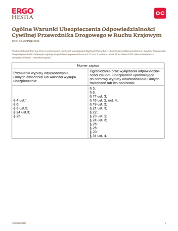 Ogólne Warunki Ubezpieczenia Odpowiedzialności Cywilnej Przewoźnika Drogowego w Ruchu Krajowym Kod: AB-OCPDK-01/12 Poniższa tabela informuje, które z postanowień zawartych w niniejszych Ogólnych Warunkach Ubezpieczenia Odpowiedzialności Cywilnej Przewoźnika Drogowego w Ruchu Krajowym regulują zagadnienia wymienione w art. 17 ust. 1 ustawy z dnia 11 września 2015 roku o działalności ubezpieczeniowej i reasekuracyjnej”. Numer zapisu Przesłanki wypłaty odszkodowania i innych świadczeń lub wartości wykupu ubezpieczenia: § 4 ust.1; § 6; § 8 ust.5; § 24 ust.3; § 25. TM/OW025/1601 Ograniczenia oraz wyłączenia odpowiedzialności zakładu ubezpieczeń uprawniające do odmowy wypłaty odszkodowania i innych świadczeń lub ich obniżenia: § 5; § 6; § 17 ust. 3; § 18 ust. 2, ust. 4; § 19 ust. 2; § 21 ust. 3; § 22; § 23 ust. 2; § 24 ust. 3; § 25; § 26; § 29; § 31 ust. 4. 1 POSTANOWIENIA OGÓLNE §1 1. Na podstawie niniejszych Ogólnych Warunków Ubezpieczenia Sopockie Towarzystwo Ubezpieczeń ERGO Hestia SA w Sopocie, zwane dalej „Ubezpieczycielem” zawiera umowy ubezpieczenia odpowiedzialności cywilnej z przewoźnikami uprawnionymi do wykonywania odpłatnie przewozu przesyłek towarowych w krajowym ruchu drogowym, zwanymi dalej „Ubezpieczającymi”. 2. Ubezpieczający może zawrzeć umowę ubezpieczenia na cudzy rachunek (na rachunek Ubezpieczonego). 3. W razie zawarcia umowy ubezpieczenia na cudzy rachunek, postanowienia niniejszych Ogólnych Warunków Ubezpieczenia stosuje się odpowiednio do osoby, na rachunek której zawarto umowę ubezpieczenia. §2 Umowy ubezpieczenia mogą być zawierane na uzgodnionych przez strony w formie pisemnej warunkach, odbiegających od postanowień niniejszych Ogólnych Warunków Ubezpieczenia. DEFINICJE §3 W rozumieniu niniejszych ogólnych warunków ubezpieczenia za: 1. AGD – uważa się w szczególności następujące przedmioty, sprzęty i urządzenia używane powszechnie w gospodarstwach domowych: czajniki, ekspresy do kawy, kuchenki, lokówki, lodówki, mikrofalówki, odkurzacze, okapy, piekarniki, płyty grzewcze, pralki, pralkosuszarki, roboty kuchenne, suszarki, wagi, zamrażarki, zmywarki, żelazka. 2. Alkohol – uważa się napoje i płyny o zawartości czystego alkoholu etylowego powyżej 2%. 3. Dzieła sztuki, zbiory filatelistyczne i numizmatyczne – uważa się wymienione poniżej rzeczy ruchome, ich części lub ich zespoły: a) oryginalne dzieła plastyczne, rzemiosła artystycznego i sztuki użytkowej, b) kolekcje stanowiące skatalogowane zbiory przedmiotów zgromadzonych i uporządkowanych według koncepcji osób, które te kolekcje tworzyły, c) skatalogowane numizmaty, zbiory filatelistyczne oraz pamiątki historyczne, a zwłaszcza militaria, sztandary, pieczęcie, odznaki, medale i ordery, d) wytwory techniki, a zwłaszcza urządzenia, środki transportu oraz maszyny i narzędzia świadczące o kulturze materialnej, charakterystyczne dla dawnych i nowych form gospodarki, dokumentujące poziom nauki i rozwoju cywilizacyjnego, e) skatalogowane materiały biblioteczne, f) wytwory sztuki ludowej i rękodzieła oraz inne obiekty etnograficzne, g) przedmioty upamiętniające wydarzenia historyczne bądź działalność wybitnych osobistości lub instytucji. 4. Franszyzę redukcyjną – uważa się kwotę, o jaką ubezpieczyciel pomniejsza należne świadczenie ubezpieczeniowe. 5. Inne dokumenty – uważa się wszystkie dokumenty, które w rozumieniu niniejszych warunków nie są wartościami pieniężnymi. 6. Kierowcę – uważa się osobę fizyczną kierującą pojazdem i wykonującą przewóz ładunku. 7. Konfiskatę towaru – uważa się przejęcie przesyłki towarowej przez organa państwowe. 8. Kontener – zgodnie z Konwencją o bezpiecznych kontenerach z dnia 2 grudnia 1972 roku uważa się urządzenie transportowe: a) o charakterze trwałym i wystarczająco mocne, aby mogło być wielokrotnie użyte, 2 b) zaprojektowane specjalnie do ułatwiania przewozu ładunków jednym lub kilkoma rodzajami środków transportu, bez potrzeby przeładunków pośrednich, c) zaprojektowane tak, aby mogło być zamocowane oraz aby można nim było łatwo manipulować i w tym celu wyposażone w naroża zaczepowe, d) o takich rozmiarach, że powierzchnia zawarta między czterema zewnętrznymi dolnymi narożami wynosi: • co najmniej 14 m2 (150 stóp kwadratowych) lub • co najmniej 7 m2 (75 stóp kwadratowych), jeżeli jest wyposażone w górne naroża zaczepowe. Określenie „kontener” nie obejmuje pojazdów, części pojazdów, nadwozi wymiennych ani opakowań towarów. „Naroża zaczepowe” oznaczają urządzenia z otworami i powierzchniami czołowymi, zamocowane w górnych lub dolnych narożnikach, służące do manipulowania kontenerem, jego piętrzenia lub zamocowania. 9. Kosmetyki – uważa się każdy produkt przeznaczony do kontaktu z zewnętrznymi częściami ciała ludzkiego lub zębami i jamą ustną oraz włosami w celu czyszczenia, ochraniania, perfumowania, upiększania, utrzymywania ich w dobrym stanie lub zmiany wyglądu. 10. Licencję – uważa się decyzję administracyjną wydaną przez ministra właściwego do spraw transportu lub określony w ustawie organ samorządu terytorialnego, uprawniającą do podejmowania i wykonywania działalności gospodarczej w zakresie krajowego transportu drogowego. 11. Materiały niebezpieczne – uważa się materiały sklasyfikowane przez międzynarodową umowę dotyczącą drogowego przewozu towarów i ładunków niebezpiecznych (ADR) z dnia 30 września 1957 roku – zwana dalej Umową ADR oraz określone przez Ustawę o przewozie drogowym towarów niebezpiecznych z dnia 28 listopada 2002 roku. 12. Osoby za które Ubezpieczający ponosi odpowiedzialność – uważa się, osoby którym Ubezpieczający zleca wykonanie przewozu i wydaje towar w celu przetransportowania lub przy pomocy których przewóz wykonuje. 13. Pozostawienie pojazdu bez