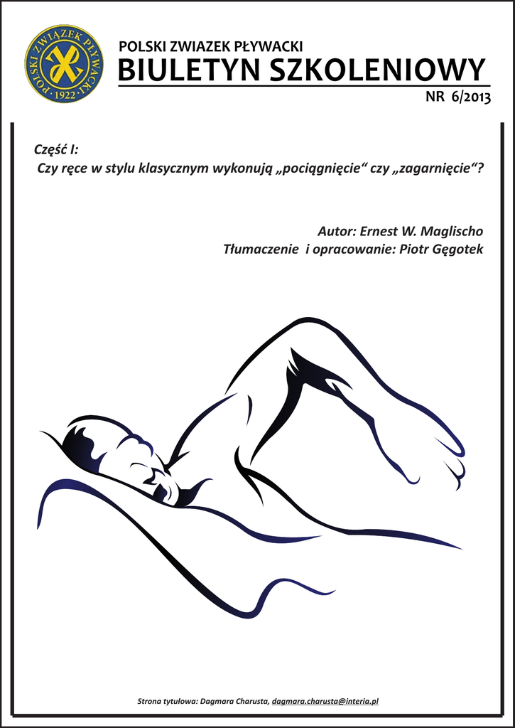 POLSKI ZWIAZEK P£YWACKI BIULETYN SZKOLENIOWY NR 6/2013 Czêœæ I: Czy rêce w stylu klasycznym wykonuj¹ „poci¹gniêcie“ czy „zagarniêcie“? Autor: Ernest W. Maglischo T³umaczenie i opracowanie: Piotr Gêgotek Strona tytu³owa: Dagmara Charusta, [email protected] J. Swimming Research, Vol. 21:1 (2013) Część I: Czy ręce w stylu klasycznym wykonują „pociągnięcie“ czy „zagarnięcie“? Autor: Ernest W. Maglischo Tłumaczenie i opracowanie: Piotr Gęgotek Redakcja: Piotr Makar Streszczenie. Obecnie pływacy odchodzą od stosowania zagarnięcia podczas ruchu rękami. Wraca tendencja używania napędu zdominowanego siłą ciągu, gdzie dłoń i ręka zachowują się bardziej jak wiosło a nie płat. Podczas gdy jest to prawdą w trzech stylach pływackich, spora część trenerów wciąż uważa, że styl klasyczny powinien być wyjątkiem od tego trendu. Uważają oni, że pływający stylem klasycznym powinni zagarniać ręce na zewnątrz i do środka. W tej pracy chcę przedstawić przykład dla specjalistów stylu klasycznego stosujących siłą ciągu zdominowanego stylu pracy ramion. Moje racjonalne uzasadnienie sugerowania takiego treningu zostanie przedstawione na początku artykułu, poczym przejdę do prezentacji obrazowej i graficznej danych, które je popierają. W ostatniej sekcji przedstawię w jaki sposób powinien zostać wykonany cykl ruchowy ramion. Wprowadzenie: Debata wciąż trwa: pływacy wykonują pociągnięcia czy zagarnięcia? Czy dominującą w pływaniu jest siła nośna czy jednak siła ciągu? W Części I artykułu przedstawię dlaczego sądzę, iż to właśnie siła ciągu jest dominującą w napędzie. Stosowanie w stylu klasycznym napędu zdominowanego siłą ciągu przedstawię w Części II. Przed 1970 rokiem zdecydowana większość opinii teoretyków opowiadała się za poglądem, że napęd w pływaniu wynika z zasady Akcji/Reakcji Newtona. Oznaczało to, że jeśli pływacy pchali swoje ręce bezpośrednio do tyłu przeciwnie do oporu wody (akcja), ich ciała przyspieszały w przód (reakcja). W rezultacie uważano, że ręce zachowywały się jak „wiosła”, za pomocą których pływacy ciągnęli a następnie pchali je przeciwnie do oporu wody w kierunku do tyłu od początku do końca ich podwodnego cyklu. Odkąd „Ciąg” został użyty jako termin określający opór wody, metoda ta została nazwana „Napędem oporowym” (red.: siłą napędową, siłą ciągu). Badania przeprowadzone przez Browna i Counsilmana w 1971 roku zmieniły obowiązujące dotychczas przekonania i doprowadziły do obalenia teorii traktującej siłę ciągu jako fundamentalny czynnik napędowy w pływaniu u ludzi. Ich przełomowe badania ukazały, że ręce pływaków podążały po krzywej a nie po torze prostym podczas podwodnego cyklu (patrz figura 1). Z tego powodu autorzy sugerowali, że pływacy pomimo stosowania obu sił (nośnej i ciągu) dla wytworzenia napędu, większy akcent kładli na siłę nośną. Siła nośna była domniemanym rezultatem efektu Bernoulliego. J. Swimming Research, Vol. 21:1 (2013) Twierdzenie Bernoulliego opisuje jak wytwarzane są siły nośne wokół płata (samolotu). Wydało się to użytecznym pojęciem w aerodynamice i hydrodynamice. Na ilustracji 2 przedstawiono graficznie zastosowanie twierdzenia Bernoulliego w odniesieniu do wytwarzanego napędu przez obserwowanego od dołu delfinistę, w trakcie podwodnej fazy "pociągnięcia" - jak nazywana jest przez większość. Figura 1.Typowe wzorce cyklu dla czterech styli pływackich widziane od przodu, z boku i z dołu. Modele reprezentują dwuwymiarowe tory ruchu dłoni pływaka podczas przemieszczania się w wodzie. Sposób w jaki uważano Twierdzenie Bernoulliego za określające wytwarzanie napędu może być przedstawione następująco. Ręka pływaka przemieszczając się w wodzie wytwarza różnicę ciśnień pomiędzy dolną częścią dłoni, gdzie ciśnienie jest większe, a górną gdzie ciśnienie jest mniejsze. Pływak odpychając wodę wewnętrzną częścią dłoni, przeciwnie do jej oporu wytwarza "siłę ciągu" zwróconą przeciwnie do kierunku poruszania się dłoni. Jedyną siłą jaka będzie wytwarzana J. Swimming Research, Vol. 21:1 (2013) podczas przemieszczania rąk pływaka wyłącznie ku tyłowi jest siła ciągu. Jednakże, gdy przemieszczają się one ukośnie do tyłu, jak to ma miejsce we wszystkich czterech stylach pływackich, siła określana jako „nośna” również będzie wytwarzana. Ta siła nośna będzie skierowana prostopadle do ciągu i zwrócona z obszaru o większym ciśnieniu powstałym na wewnętrznej stronie dłoni pływaka, w kierunku obszaru o niższym ciśnieniu po stronie grzbietowej. Różnica ciśnień wynika ze zwiększonego ciśnienia wody powstającego na dłoniach pływaka na skutek odpychania się nimi od oporującej wody. Uważa się, że obniżenie ciśnienia nad górną stroną ręki spowodowane jest zwiększeniem prędkości przepływającej wody nad tą powierzchnią. Wypadkowe sił nośnych i ciągu prowadzą do powstania sił zwróconych w różnych kierunkach wokół ręki pływaka. Ten wyodrębniony moment wypadkowych siły nośnej i ciągu, o zwrocie w kierunku przednim, nazywana jest siłą napędową. Tarcie Figura 2.Proponowana aplikacja Twierdzenia Bernoulliego w napędzie pływania u ludzi. Z odkryciem, że pływacy tak naprawdę wykonywali cykle po torach krzywoliniowych, wydawało się logiczne przyjąć, że to siła nośna a nie siła ciągu była głównym źródłem ich napędu. Ostatecznie stwierdzono, że światowej klasy pływacy nie używaliby cyklu o torze krzywoliniowym, jeśli dominującą siłą napędową byłaby siła ciągu. Zamiast tego odpychaliby swoje ręce bezpośrednio ku J. Swimming Research, Vol. 21:1 (2013) tyłowi. W konsekwencji tego rozumowania przeważającą opinią stało się, że w celu zmaksymalizowania wpływu sił nośnej do wytworzenia napędu, p
