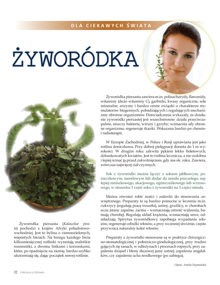 DLA CIEKAWYCH ŚWIATA ŻYWORÓDKA Żyworódka pierzasta zawiera m.in. polisacharydy, flawonidy, witaminy (dużo witaminy C), garbniki, kwasy organiczne, sole mineralne, enzymy i bardzo cenne związki o charakterze stymulatorów biogennych, pobudzających i regulujących mechanizmy obronne organizmów. Doświadczenia wykazały, że działanie żyworódki pierzastej jest wszechstronne: działa przeciwzapalnie, niszczy bakterie, wirusy i grzyby; wzmacnia siły obronne organizmu; regeneruje tkanki. Wskazana bardzo po chemioi radioterapii. W Europie Zachodniej, w Polsce i Rosji uprawiana jest jako roślina doniczkowa. Przy dobrej pielęgnacji dorasta do 1 m wysokości. W drugim roku zakwita pękiem lekko fioletowych, dzbankowatych kwiatów. Jest to roślina lecznicza, a nie ozdobna i lepiej ścinać ją przed zakwitnięciem, gdy ma ok. roku. Zawiera, wówczas najwięcej ciał czynnych. Sok z żyworódki można łączyć z sokiem jabłkowym, porzeczkowym, morelowym lub dodać do miodu pszczelego, najlepiej mniszkowego, akacjowego, ogórecznikowego lub wrzosowego, w stosunku 1 część soku z żyworódki na 3 części miodu. Żyworódka pierzasta (Kalauchoe pirata) pochodzi z krajów Afryki południowowschodniej. Jest to bylina o ciemnozielonych, mięsistych liściach. Na brzegu każdego liścia kilkumiesięcznej roślinki wyrastają maleńkie rozmnóżki, z dwoma listkami i korzonkami, które, po opadnięciu na ziemię, bardzo szybko ukorzeniają się, dając początek nowej roślinie. Można również robić maści i nalewki do stosowania zewnętrznego. Preparaty te są bardzo pomocne w leczeniu m.in. cukrzycy (regulują pracę trzustki), astmy, gruźlicy, w chorobach oczu (stany zapalne, zaćma – wzmacniają ostrość widzenia, hamują chorobę). Regulują układ krążenia, wzmacniają serce, odmładzają. Spirytus żyworódkowy zapobiega wypadaniu włosów, regeneruje cebulki włosów, a przy wczesnej siwiźnie, często przywraca naturalny kolor włosów. Preparaty z żyworódki stosowane są w praktyce chirurgiczno-stomatologicznej i położniczo-ginekologicznej, przy trudno gojących się ranach, w odleżynach i procesach ropnych, przy zapaleniu dziąseł i błony śluzowej jamy ustnej, zapaleniu migdałków, czy zapaleniu ucha środkowego (po zabiegu). Oprac. Aniela Szymańska 32 Cukrzyca a Zdrowie