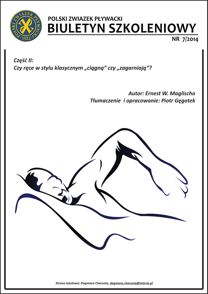 POLSKI ZWIAZEK P£YWACKI BIULETYN SZKOLENIOWY NR 7/2014 Czêœæ II: Czy rêce w stylu klasycznym „ci¹gn¹“ czy „zagarniaj¹“? Autor: Ernest W. Maglischo T³umaczenie i opracowanie: Piotr Gêgotek Strona tytu³owa: Dagmara Charusta, [email protected] J. Swimming Research, Vol. 21:1 (2013) Część II: Czy ręce w stylu klasycznym „ciągną“ czy „zagarniają“? Autor: Ernest W. Maglischo Tłumaczenie i opracowanie: Piotr Gęgotek Redakcja: Piotr Makar Streszczenie. Obecnie pływacy odchodzą od używania zagarniania podczas ruchu rękami. Wraca tendencja używania oporowo-zdominowanego napędu, gdzie dłoń i ręka zachowują się bardziej jak wiosło a nie płat. Podczas gdy jest to prawdą w trzech stylach pływackich, spora część trenerów wciąż uważa, że styl klasyczny powinien być wyjątkiem od tego trendu. Uważają oni, że pływający stylem klasycznym powinni zagarniać ręce na zewnątrz i do środka. W tej pracy chcę zaprezentować sprawę stylu klasycznego, używając oporowo-zdominowanego stylu ramion. Moje racjonalne uzasadnienie sugerowania takiego treningu zostanie przedstawione na początku artykułu, zanim przejdę do prezentacji obrazowej i graficznej danych, które je wspierają. W ostatniej sekcji przedstawię, w jaki sposób powinien zostać wykonany cykl ramion. Wprowadzenie do Części II: Teorie napędu zostały omówione w części I tego artykułu. Przywodzenie ramienia jako główny ruch napędzający i posób, w jaki jest ono wykonywane w kraulu, stylu grzbietowym i motylkowym również zostało omówione. W części II chcę przedstawić jak według mnie przywodzenie ramienia jest używane dla napędu podczas cyklu ramion w stylu klasycznym. Przywodzenie ramienia w stylu klasycznym Jak wspomniałem wcześniej w części I tego artykułu, wydaje się dla mnie logiczne, że pływacy w stylu klasycznym powinni używać tego samego ruchu przywodzenia ramienia, który jest stosowany dla napędu w trzech pozostałych stylach i to, że napęd również powinienen być oporowo-zdominowany. Dwa zdjęcia na figurze 1 pokazują boczny widok pływaka w stylu klasycznym używającego tego samego ruchu przywodzenia ramienia w swoim stylu, który został opisany dla pozostałych trzech stylów pływackich w części I tego artykułu. Zauważ, że jego chwyt wykonywany jest z rękami ugiętymi w łokciach i skierowanymi do tyłu (zobacz zdjęcie po lewej stronie na figurze 1), po czym zagarnia on swoimi ramionami horyzontalnie do tyłu bokiem po lini półkola, który kończy się, gdy zbliżają się one do żeber (zobacz zdjęcie po prawej stronie na figurze 1). J. Swimming Research, Vol. 21:1 (2013) Figura 1. Przywodzenie ramienia w stylu klasycznym. Pływak na zdjęciu to Jim Johnson, All American na 200 jardów stylem klasycznym. W tej chwili zrozumiałe byłoby zadanie pytania - dlaczego wzory cykli w stylu klasycznym pokazują ich dłonie przemieszczające się do tyłu tylko przy krótkim dystansie podczas fazy napędzającej ich cyklu ramion, jeśli w rzeczywistości pchają do tyłu naprzeciw wody swoimi rękami (zobacz figura 2). Aby odpowiedzieć na to pytanie, musimy rozróżnić pomiędzy dystansem, jaki ręce pływaka pokonują przemieszczając się do tyłu a ilością siły do tyłu, jaką wywierają na wodę podczas podwodnego cyklu ramion. Ilustracja na figurze 2 jest użyta właśnie do tego celu. Widok spod wzoru cyklu dla obu rąk pływaka pokazuje faktyczną drogę, którą wykonują przez wodę. Wzór ręki pływaka narysowany jest w odniesieniu do wody, co jest najbardziej dokładnym sposobem zademonstrowania rzeczywistego dystansu jaki jego ręce przemieszczają się na zewnątrz, do środka i do tyłu podczas cyklu ramion. Dwa rysunki ciała pływaka na tej figurze przedstawiają ruch ciała naprzód podczas cyklu ramion (od zacienionego rysunku do niezacienionego rysunku). Można wyraźnie zobaczyć, że ręce pływaka przemieszczają sie na zewnątrz i do środka w zdecydowanie większym dystansie niż przemieszczają się one do tyłu podczas podwodnego cyklu jego ramion. Jeśli dołączony byłby boczny widok, to pokazałby on, że ramiona również przemieszczają się w dół i do góry w większym stopniu niż przemieszczają się do tyłu (zobacz figura 1 w części I tego artykułu). J. Swimming Research, Vol. 21:1 (2013) Figura 2. Wzór cyklu ramioin w stylu klasycznym narysowany relatywnie do wody. Ilustracja pokazuje widok spod typowego wzoru rąk dla pływaka w stylu klasycznym. Wzór przemieszczania się rąk pływaka przez wodę. Narysowany jest relatywnie do wody i dostarcza wierną repezentację dwuwymiarowego kierunku ruchu rąk pływaka podczas cyklu ramion. Pozycje zacienionego i niezacienionego ciała wskazują jego ruch do przodu podczas cyklu ramion. Zauważ, że ręce pływaka przemieszczają się do tyłu tylko przez krótki dystans podczas zagarnięcia na zewnątrz i do wewnątrz (jak jest to zaznaczone przez czerwoną strzałkę z boku jego lewej ręki) Zauważ również, że część jego ruchu prawej ręki jest zaznaczona na czerwono. Oznacza ona czas przemieszczania się prostopadle na zewnątrz i do środka podczas rzeczywistej drogi przez wodę. Ten rysunek zaprezentowano w taki sposób, aby przedstawić, jak pływacy napędzają swoje ciała poprzez pchanie do tyłu, nawet gdy wzory ruchu ich cyklu są zaaokrąglone. Czerwona strzałka z boku wzoru cyklu dla lewej ręki wskazuje dystans, jaki ona w rzeczywiści przemieszcza się do tyłu podczas jednego cyklu. Gdy porównamy ten dystans z dystansem jego dłoni przemieszczanym na zewnątrz i do tyłu, można by rozsądnie wywnioskować, że napędza on swoje ciało do przodu poprzez wiosłowania swoimi dłońmi przez wodę. Wyjaśnię dlaczego to założenie nie jest prawdą. Zauważ czerwoną część wzoru cyklu dla prawej ręki na rysunku na figurze 2. Przedstawia on część wzoru cyklu, kiedy zawodnik wykonuje ruch prostopadle do tyłu. 