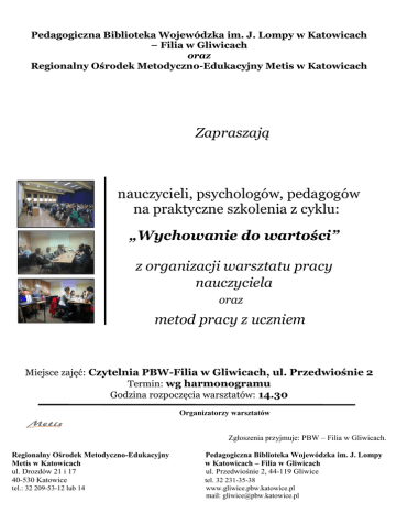 Pedagogiczna Biblioteka Wojewódzka im. J. Lompy w Katowicach – Filia w Gliwicach oraz Regionalny Ośrodek Metodyczno-Edukacyjny Metis w Katowicach Zapraszają nauczycieli, psychologów, pedagogów na praktyczne szkolenia z cyklu: „Wychowanie do wartości” z organizacji warsztatu pracy nauczyciela oraz metod pracy z uczniem Miejsce zajęć: Czytelnia PBW-Filia w Gliwicach, ul. Przedwiośnie 2 Termin: wg harmonogramu Godzina rozpoczęcia warsztatów: 14.30 Organizatorzy warsztatów Zgłoszenia przyjmuje: PBW – Filia w Gliwicach. Regionalny Ośrodek Metodyczno-Edukacyjny Metis w Katowicach ul. Drozdów 21 i 17 40-530 Katowice tel.: 32 209-53-12 lub 14 Pedagogiczna Biblioteka Wojewódzka im. J. Lompy w Katowicach – Filia w Gliwicach ul. Przedwiośnie 2, 44-119 Gliwice tel. 32 231-35-38 www.gliwice.pbw.katowice.pl mail: [email protected] WARSZTATY PRAKTYCZNE WYCHOWANIE DO WARTOŚCI Biblioteka Pedagogiczna w Gliwicach oraz Regionalny Ośrodek Metodyczno–Edukacyjny METIS w Katowicach zaprasza na cykl zajęć WYCHOWANIE DO WARTOŚCI. Proponujemy Państwu interesujące formy praktycznych szkoleń, podczas których zdobędą Państwo nowe oraz udoskonalą posiadane umiejętności w zakresie wykorzystania różnorodnych technik służących rozwijaniu ekspresji twórczej u dzieci oraz organizacji warsztatu pracy nauczyciela. Zajęcia poprowadzą konsultantki ROME METIS w Katowicach. Harmonogram zajęć w roku szkolnym 2016/2017 Kod Temat Termin Koszt 28 listopada 2016 15PLN 589W/GL Jak skutecznie wykorzystać wiedzę o rozwoju dziecka w przedszkolu i edukacji wczesnoszkolnej? 502W/GL Zabawy muzyczno-ruchowe w edukacji przedszkolnej i wczesnoszkolnej 1 grudnia 2016 15PLN 563W/GL Kamishibai – teatr ilustracji. Jak zamienić seans głośnego czytania w niezapomnianą chwilę magii... 7 grudnia 2016 15PLN 10 stycznia 2017 15PLN 7 lutego 2017 15PLN 7 marca 2017 15PLN 517W/GL Jak porozumiewać się z trudnym rodzicem? 571W/GL Profilaktyka problemowa – agresja słowna uczniów, gry uczniowskie i techniki manipulacyjne 562W/GL Dziecko z trudnościami emocjonalnymi w szkole i przedszkolu Zajęcia będą się odbywać wg harmonogramu od 14:30 do 17:30 w czytelni Pedagogicznej Biblioteki Wojewódzkiej w Katowicach – Filia w Gliwicach. Koszt udziału w zajęciach warsztatowych (obejmuje materiały, sprzęt): 15PLN. Ze względu na praktyczny charakter zajęć liczba miejsc w grupie jest ograniczona. O przyjęciu decyduje kolejność zgłoszeń potwierdzona wpłatą. Chętnych do udziału w warsztatach prosimy: 1. Osobiście, telefonicznie lub e-mailowo skontaktować się z Biblioteką Pedagogiczną: adres: Gliwice 44-100, ul. Przedwiośnie 2 tel.: 32 231-35-38 ; e-mail: [email protected] 2. Po otrzymaniu informacji o wpisaniu na listę – dokonać wpłaty (ceny za poszczególne warsztaty podano w harmonogramie spotkań) na konto METISu: ING BSK S.A.: 94 1050 1214 1000 0090 7749 6066 Tytuł przelewu: KOD + Imię i nazwisko uczestnika (np.: 502W/GL Jan Kowalski) Faktury oraz zaświadczenia z tytułu uczestnictwa w szkoleniach będą wystawiane wyłącznie zgodnie z danymi zawartymi w dokumencie przelewu. Kasa ROM-E „Metis” nie ma możliwości zmiany wystawionych faktur. Szczegółowych informacji dotyczących merytorycznego programu zajęć udziela koordynator warsztatów: p. Anna Dzięgiel: [email protected] ; 32-209-53-12 w.116 Uczestnicy otrzymają zaświadczenia ukończenia warsztatów z Regionalnego Ośrodka Metodyczno-Edukacyjnego METIS Katowice. Osoby uczestniczące we wszystkich sześciu szkoleniach mogą otrzymać zaświadczenie o ukończeniu kursu doskonalącego.