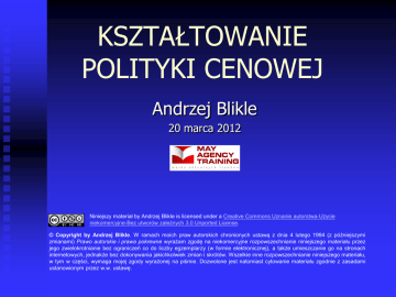 KSZTAŁTOWANIE POLITYKI CENOWEJ Andrzej Blikle 20 marca 2012 Niniejszy materiał by Andrzej Blikle is licensed under a Creative Commons Uznanie autorstwa-Użycie niekomercyjne-Bez utworów zależnych 3.0 Unported License. © Copyright by Andrzej Blikle. W ramach moich praw autorskich chronionych ustawą z dnia 4 lutego 1994 (z późniejszymi zmianami) Prawo autorskie i prawa pokrewne wyrażam zgodę na niekomercyjne rozpowszechnianie niniejszego materiału przez jego zwielokrotnianie bez ograniczeń co do liczby egzemplarzy (w formie elektronicznej), a także umieszczanie go na stronach internetowych, jednakże bez dokonywania jakichkolwiek zmian i skrótów. Wszelkie inne rozpowszechnianie niniejszego materiału, w tym w części, wymaga mojej zgody wyrażonej na piśmie. Dozwolone jest natomiast cytowanie materiału zgodnie z zasadami ustanowionym przez w.w. ustawę. Źródła [1] Robert J. Dolan i Hermann Simon, Power Pricing — How Managing Price Transforms the Bottom Line, The Free Press, New York 1996 [2] Thomas T. Nagle i Reed K. Holden, The strategy and tactics of pricing — a guide to profitable decision making, Prentice Hall Marketing Series 2002 20 marca 2012 © Andrzej Blikle, Kształtowanie polityki cenowej 2 Trzy strategie kształtowania cen PASYWNA: cena = koszt + marża nie reaguję na rynek REAKTYWNA: wezmę tyle, ile dadzą nie wpływam na rynek PROAKTYWNA: wpływam na to, ile dadzą kształtuję rynek 20 marca 2012 © Andrzej Blikle, Kształtowanie polityki cenowej 3 CZĘŚĆ PIERWSZA Ekonomia Cen Nasze wysiłki przyniosą znacznie więcej pożytku, gdy zajmiemy się utrzymaniem cen, niż poszerzaniem rynku. Jest to szczególnie prawdziwe wtedy, gdy nasze marże są niewielkie. Thomas T. Nagle i Reed K. Holden 20 marca 2012 © Andrzej Blikle, Kształtowanie polityki cenowej 4 Czynniki zyskotwórcze 1. 2. 3. 4. 20 marca 2012 Ceny Koszty zmienne Koszty stałe Wartość sprzedaży © Andrzej Blikle, Kształtowanie polityki cenowej 5 Zależność zysku od czynników zyskotwórczych koszty stałe 78% w obrotach, koszty zmienne 19% i zysk 3%. 140% 120% 116% 110% 100% 82% 80% 60% 40% 20% 28% 5% 5% 0% -5% -20% ceny produktów 20 marca 2012 koszty zmienne -5% koszty stałe © Andrzej Blikle, Kształtowanie polityki cenowej sprzedaż 6 Zależność zysku od wzrostu ceny koszty stałe 78% w obrotach, koszty zmienne 19% i zysk 3%. 2 500 2 000 1 500 1 000 500 0 0% 1% 2% 3% 4% 5% 6% 7% 8% 9% 10% Na wykresie zysk w tys. zł 20 marca 2012 © Andrzej Blikle, Kształtowanie polityki cenowej 7 Cena optymalna 6000 5000 4000 3000 2000 1000 0 0 10 20 30 sprzedaż jdn 40 50 60 70 80 90 100 zysk zł Dla każdego produktu i rynku zawsze istnieje cena optymalna. 20 marca 2012 © Andrzej Blikle, Kształtowanie polityki cenowej 8 Pasywna strategia ustalania ceny cena = koszt + marża PRODUKT KOSZT CENA WARTOŚĆ KLIENT Typowe konsekwencje: 1. wysokie marże na rynkach trudnych - bo mało sprzedajemy 2. niskie marże na rynkach łatwych – bo dużo sprzedajemy 20 marca 2012 odwrotnie niż powinno być © Andrzej Blikle, Kształtowanie polityki cenowej 9 Strategia Proaktywna KLIENT WARTOŚĆ CENA KOSZT Najczęściej nie jest możliwe ustalenie kosztu produktu przed ustaleniem jego ceny! PRODUKT Udział kosztów stałych w jdn zależy o liczby sprzedanych jdn koszt jednostkowy = F(sprzedaż) sprzedaż = G(cena) 20 marca 2012 © Andrzej Blikle, Kształtowanie polityki cenowej 10 Drugi kontrakt a koszty cenotwórcze kontrakt podstawowy kontrakt dodatkowy PRZYCHODY 25,00 zł 10 000 szt. 250 000 zł 110 000 zł cenotwórcze płace 50 000 zł cenotwórcze 75 000 zł cenotwórcze surowce, mat., ener. 30 000 zł cenotwórcze 45 000 zł cenotwórcze cena 1 szt. miesięcznie szt. miesięcznie zł 18,00 zł 15 000 szt 270 000 zł KOSZTY czynsze, amort.,... na 1 szt. 19,00 zł 8,00 zł 6,00 zł 10,00 zł 60 000 zł 150 000 zł ZYSK marża na 1 szt. miesięcznie 20 marca 2012 © Andrzej Blikle, Kształtowanie polityki cenowej 11 Ważna konkluzja Przy niewysokim udziale kosztów zmiennych możemy ustalać bardzo konkurencyjne ceny drugiego kontraktu, lub uzyskiwać na nim bardzo korzystne marże. 20 marca 2012 © Andrzej Blikle, Kształtowanie polityki cenowej 12 CZĘŚĆ DRUGA Rozumieć decyzje zakupowe klientów i wpływać na nie Istotą planowania strategicznego jest proaktywne zarządzanie niepewnością rynku, a nie jej ograniczanie. 20 marca 2012 © Andrzej Blikle, Kształtowanie polityki cenowej 13 Ekonomiczna wartość produktu wartość ekonomiczna = cena referencyjna (cena najlepszej alternatywy) + wartość różnicująca (wartość tego co różni produkt od jego najlepszej alternatywy) Przy ocenie wartości różnicującej należy wziąć pod uwagę: może być „+” lub „-” • podstawowe cechy produktu: surowce, dokładność wykonania, parametry techniczne itp. • dodatkowe korzyści: podniesienie prestiżu społecznego, uznanie w oczach obdarowanego, oszczędność w eksploatacji, bezpieczeństwo,… Analiza wartości różnicującej produktu pozwala odpowiedzieć na pytanie, czy nasz produkt jest przeceniony, czy niedoreklamowany. 20 marca 2012 © Andrzej Blikle, Kształtowanie polityki cenowej 14 Zdaniem Briana Tracy Jaki procent decyzji zakupowych jest podejmowany pod wpływem emocji? 100% 20 marca 2012 © Andrzej Blikle, Kształtowanie polityki cenowej 15 Nasza szansa na sterowanie popytem Istnieje dziewięć rodzajów efektów, które wpływają na gotowość klienta do dokonania zakupu oraz na jego wrażliwość w postrzeganiu różnicy pomiędzy ekonomiczną wartością produktu a jego ceną 1. 2. 3. 4. 5. 6. 7. 8. 9. 20 marca 2012 efekt odniesienia efekt trudnego porównania efekt kosztu zmiany dostawcy efekt „cena określa wartość” efekt referencyjnego kosztu zakupu efekt końcowej korzyści efekt dzielonego kosztu efekt niegodziwego zysku efekt wiązki © Andrzej Blikle, Kształtowanie polityki cenowej 16 1. Efekt odniesienia Cenowa wrażliwość klienta jest tym więk
