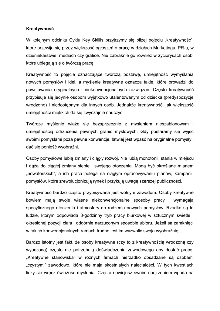 Kreatywność W kolejnym odcinku Cyklu Key Sklills przyjrzymy się bliżej pojęciu „kreatywność”, które przewija się przez większość ogłoszeń o pracę w działach Marketingu, PR-u, w dziennikarstwie, mediach czy grafice. Nie zabraknie go również w życiorysach osób, które ubiegają się o twórczą pracę. Kreatywność to pojęcie oznaczające twórczą postawę, umiejętność wymyślania nowych pomysłów i idei, a myślenie kreatywne oznacza takie, które prowadzi do powstawania oryginalnych i niekonwencjonalnych rozwiązań. Często kreatywność przypisuje się jedynie osobom wyjątkowo utalentowanym od dziecka (predyspozycje wrodzone) i niedostępnym dla innych osób. Jednakże kreatywność, jak większość umiejętności miękkich da się zwyczajnie nauczyć. Twórcze myślenie wiąże się bezsprzecznie z myśleniem nieszablonowym i umiejętnością odrzucenia pewnych granic myślowych. Gdy postaramy się wyjść swoimi pomysłami poza pewne konwencje, łatwiej jest wpaść na oryginalne pomysły i dać się ponieść wyobraźni. Osoby pomysłowe lubią zmiany i ciągły rozwój. Nie lubią monotonii, stania w miejscu i dążą do ciągłej zmiany siebie i swojego otoczenia. Mogą być określane mianem „nowatorskich”, a ich praca polega na ciągłym opracowywaniu planów, kampanii, pomysłów, które zrewolucjonizują rynek i przykują uwagę szerszej publiczności. Kreatywność bardzo często przypisywana jest wolnym zawodom. Osoby kreatywne bowiem mają swoje własne niekonwencjonalne sposoby pracy i wymagają specyficznego otoczenia i atmosfery do rodzenia nowych pomysłów. Rzadko są to ludzie, którym odpowiada 8-godzinny tryb pracy biurkowej w sztucznym świetle i określonej pozycji ciała i odgórnie narzuconym sposobie ubioru. Jeżeli są zamknięci w takich konwencjonalnych ramach trudno jest im wyzwolić swoją wyobraźnię. Bardzo istotny jest fakt, że osoby kreatywne (czy to z kreatywnością wrodzoną czy wyuczoną) często nie potrzebują doświadczenia zawodowego aby dostać pracę. „Kreatywne stanowiska” w różnych firmach nierzadko obsadzane są osobami „czystymi” zawodowo, które nie mają skostniałych naleciałości. W tych kwestiach liczy się wręcz świeżość myślenia. Często nowicjusz swoim spojrzeniem wpada na lepsze pomysły niż weteran w danej dziedzinie. Im świeższe podejście tym więcej nieszablonowych sposobów rozwiązania. Z kreatywnością wpisaną w CV wiążą się również pewne pułapki. Trzeba pamiętać, że ryzykownym jest wpisywanie do CV jakichkolwiek kłamstw, jednakże jeśli wpisujemy kreatywność to tylko wtedy, gdy naprawdę cechujemy się wyjątkową pomysłowością. Jest to bowiem cecha sprawdzalna już na wczesnym etapie rozmowy kwalifikacyjnej. W bardzo prosty sposób rekturer sprawdzi czy jesteśmy pomysłowi naprawdę czy tylko na papierze. Może to zrobić zadając pytania behawioralne, aby dowiedzieć się jak w danych sytuacjach zachowywaliśmy się w przeszłości. Na podstawie tego będzie wiedział, czy nasze naturalne zachowanie pasuje do nurtu zachowania niekonwencjonalnego. Innym sposobem na sprawdzenie kreatywności są scenki sytuacyjne, w których rekruter i kandydat wcielają się w narzucone role. Jeszcze innym jest polecenie rozwiązania jakiegoś zadania, albo na miejscu albo w domu. COGITORS.pl