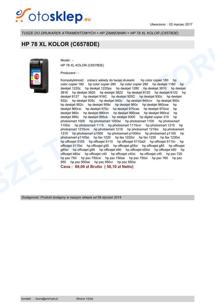 S Utworzono : 02 marzec 2017 TUSZE DO DRUKAREK ATRAMENTOWYCH > HP ZAMIENNIKI > HP 78 XL KOLOR (C6578DE) HP 78 XL KOLOR (C6578DE) R O Model : HP 78 XL KOLOR (C6578DE) Producent : - R E N E Z O T Cena : 69,00 zł Brutto ( 56,10 zł Netto) Dostępność: Produkt dostępny w naszym sklepie od 09 styczeń 2014 kontakt : - [email protected] T Y Kompatybilność: zobacz wkłady do twojej drukarki hp color copier 180 hp color copier 190 hp color copier 280 hp color copier 290 hp deskjet 1180 hp deskjet 1220c hp deskjet 1220ps hp deskjet 1280 hp deskjet 3810 hp deskjet 3816 hp deskjet 3820 hp deskjet 3822 hp deskjet 6120 hp deskjet 6122 hp deskjet 6127 hp deskjet 916C hp deskjet 920C hp deskjet 930c hp deskjet 932c hp deskjet 935c hp deskjet 940c hp deskjet 940crv hp deskjet 950c hp deskjet 952c hp deskjet 959c hp deskjet 960c hp deskjet 960cse hp deskjet 960cxi hp deskjet 970c hp deskjet 970cse hp deskjet 970cxi hp deskjet 980c hp deskjet 990cm hp deskjet 990cse hp deskjet 990cxi hp deskjet 995c hp deskjet 995ck hp deskjet 9300 hp digital copier 310 hp photosmart 1000 hp photosmart 1000xi hp photosmart 1100 hp photosmart 1100xi hp photosmart 1115 hp photosmart 1115cvr hp photosmart 1215 hp photosmart 1215vm hp photosmart 1218 hp photosmart 1218xi hp photosmart 1315 hp photosmart p1000 hp photosmart p1000xi hp photosmart p1100 hp photosmart p1100xi hp fax 1220 hp fax 1220xi hp fax 1230 hp fax 1230xi hp officejet 5105 hp officejet 5110 hp officejet 5110a2l hp officejet 5110v hp officejet 5110xi hp officejet g55 hp officejet g55xi hp officejet g85 hp officejet g85xi hp officejet g95 hp officejet k60 hp officejet k60xi hp officejet k80 hp officejet k80xi hp officejet v40 hp officejet v40xi hp officejet v45 hp psc 720 hp psc 750 hp psc 750cxi hp psc 750se hp psc 750xi hp psc 760 hp psc 950 hp psc 950se hp psc 950vr hp psc 950xi Strona 1/{nb}