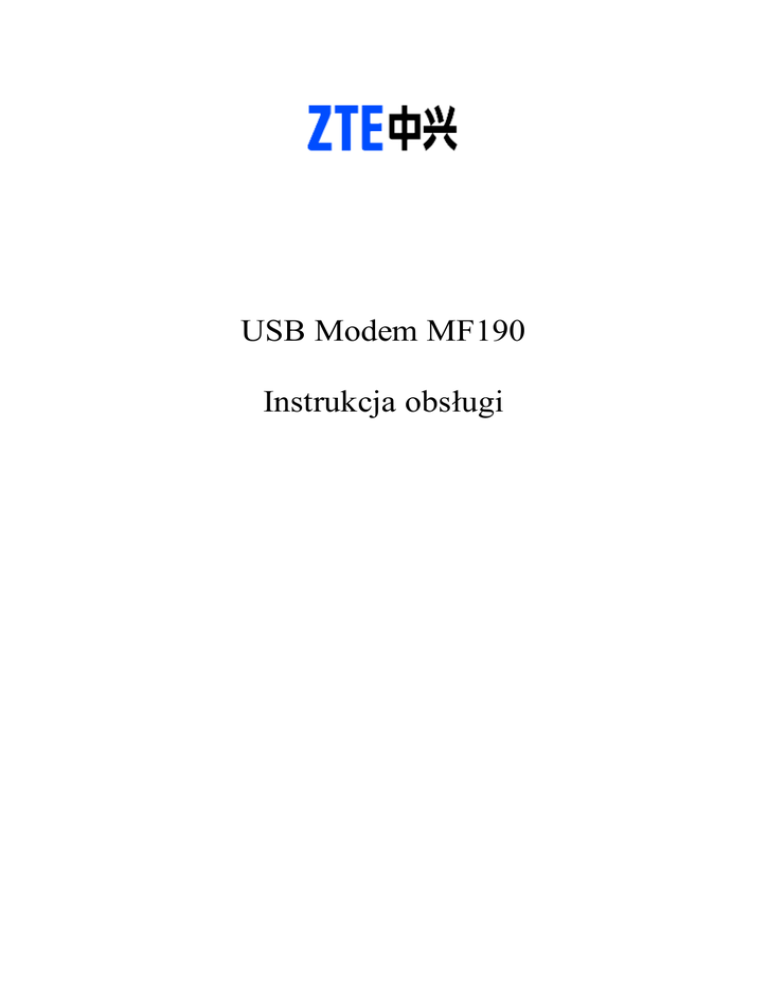 USB Modem MF190 Instrukcja obsługi Wprowadzenie ZTE modem USB, pracuje w pasmach HSUPA/HSDPA/WCDMA/EDGE/GPRS/GSM. Interfejs USB z podłączeniem do laptopa lub komputera stacjonarnego, integruje funkcjonalność modemu i telefonu komórkowy (SMS) i doskonale łączy telefonię komórkową z Internetem. Obsługuje dane i usługi SMS przez sieć telefonii komórkowej, umożliwiając komunikację w dowolnym czasie i dowolnym miejscu. Zapoznanie się z urządzeniem Poniższy rysunek przedstawia wygląd modemu MF190. Zarys jest tylko w celach informacyjnych. Rzeczywisty produkt może być inna. 1. Wskaźnik 2. Przednia obudowa 3. Zaślepka złącza USB 4. Gniazdo karty SIM/USIM 5. Gniazdo karty microSD 6. Złącze USB 2 Instalacja sprzętu 1. Umieść palec na dole, a następnie podnieś przednią pokrywę modemu. Uwagi: Nie otwieraj przedniej pokrywy na siłę, aby uniknąć uszkodzenia osłony przedniej. 2. Włóż kartę SIM/USIM do gniazda. Tak jak na poniższych obrazach. 3. Włóż kartę microSD do gniazda kart microSD. 3 4. Złóż przednią pokrywę modemu. 5. Podłącz modem do laptopa lub komputera stacjonarnego przez złącze USB. System automatycznie wykryje nowy sprzęt i uruchomi kreatora instalacji. 4