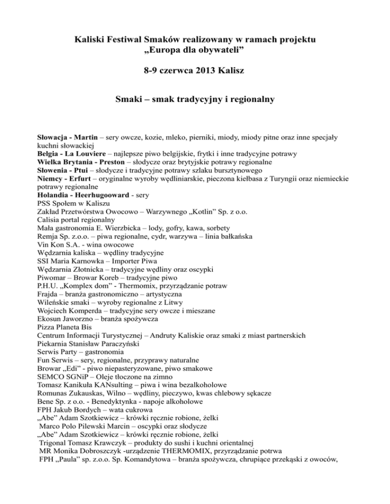 Kaliski Festiwal Smaków realizowany w ramach projektu „Europa dla obywateli” 8-9 czerwca 2013 Kalisz Smaki – smak tradycyjny i regionalny Słowacja - Martin – sery owcze, kozie, mleko, pierniki, miody, miody pitne oraz inne specjały kuchni słowackiej Belgia - La Louviere – najlepsze piwo belgijskie, frytki i inne tradycyjne potrawy Wielka Brytania - Preston – słodycze oraz brytyjskie potrawy regionalne Słowenia - Ptui – słodycze i tradycyjne potrawy szlaku bursztynowego Niemcy - Erfurt – oryginalne wyroby wędliniarskie, pieczona kiełbasa z Turyngii oraz niemieckie potrawy regionalne Holandia - Heerhugooward - sery PSS Społem w Kaliszu Zakład Przetwórstwa Owocowo – Warzywnego „Kotlin” Sp. z o.o. Calisia portal regionalny Mała gastronomia E. Wierzbicka – lody, gofry, kawa, sorbety Remja Sp. z.o.o. – piwa regionalne, cydr, warzywa – linia bałkańska Vin Kon S.A. - wina owocowe Wędzarnia kaliska – wędliny tradycyjne SSI Maria Karnowka – Importer Piwa Wędzarnia Złotnicka – tradycyjne wędliny oraz oscypki Piwomar – Browar Koreb – tradycyjne piwo P.H.U. „Komplex dom” - Thermomix, przyrządzanie potraw Frajda – branża gastronomiczno – artystyczna Wileńskie smaki – wyroby regionalne z Litwy Wojciech Komperda – tradycyjne sery owcze i mieszane Ekosun Jaworzno – branża spożywcza Pizza Planeta Bis Centrum Informacji Turystycznej – Andruty Kaliskie oraz smaki z miast partnerskich Piekarnia Stanisław Paraczyński Serwis Party – gastronomia Fun Serwis – sery, regionalne, przyprawy naturalne Browar „Edi” - piwo niepasteryzowane, piwo smakowe SEMCO SGNiP – Oleje tłoczone na zimno Tomasz Kanikuła KANsulting – piwa i wina bezalkoholowe Romunas Zukauskas, Wilno – wędliny, pieczywo, kwas chlebowy sękacze Bene Sp. z o.o. - Benedyktynka - napoje alkoholowe FPH Jakub Bordych – wata cukrowa „Abe” Adam Szotkiewicz – krówki ręcznie robione, żelki Marco Polo Pilewski Marcin – oscypki oraz słodycze „Abe” Adam Szotkiewicz – krówki ręcznie robione, żelki Trigonal Tomasz Krawczyk – produkty do sushi i kuchni orientalnej MR Monika Dobroszczyk -urządzenie THERMOMIX, przyrządzanie potrwa FPH „Paula” sp. z.o.o. Sp. Komandytowa – branża spożywcza, chrupiące przekąski z owoców, warzyw i serów Fun Serwis – sery, regionalne, przyprawy naturalne Marco Polo Pilewski Marcin – oscypki oraz słodycze ”Victoria” Peukert Sylwia – wyroby z piernika, lizaki, krówki, żelki „Impress” Maria Wietrzykowska – wyroby z dziczyzny, pieczywo ekologiczne Izabela Płonka Tłocznia Soków Owocowych „TeSO” - soki tłoczone na zimno PPH Śliwińska Sp. J. - wędliny i wędzonki z mięsa końskiego P.P.H.U. Karina Zielińska – zioła, przyprawy, herbaty Piekarnia „Chlebuś” Krzysztof Milczarek – wypieki tradycyjne na zakwasie Andruty Kaliskie Pasieka Warmińska – świeże miody Elita S.C. - tradycyjne wędliny i pieczywo z Podlasia „Wiejska Chata” Piotr Łapiński – tradycyjne wędliny z Podlasia, bezalkoholowy staropolski podpiwek domowy, kwas chlebowy Kultura i Smak Japonii Harmonogram Dni Japońskich w Kaliszu 8 czerwca 2013 (sobota) 10.00 Uroczyste otwarcie 10.30 Historia pisma japońskiego - Masakatsu Yoshida 11.00 Krótki kurs języka japońskiego - Masakatsu Yoshida 11.30 Shodo kaligrafia japońska w hołdzie naturze -pokaz i prelekcja Masakatsu Yoshida 12.30 Suibokuga malarstwo tuszem -pokaz i prelekcja -Barbara Yoshida 13.30 Japoński savoir-vivre - wolontariusze Ośrodka Języka i Kultury Japonii 14.00 Kyudo pokaz tradycyjnego łucznictwa japońskiego -Masakatsu Yoshida 15.30 Chado pokaz japońskiej ceremonii parzenia herbaty -wolontariusze OJIKJ 16.00 Pokaz przygotowania sushi -MAGURO SUSHI BAR 17.00 Pokaz zakładania i noszenia kimona -wolontariusze OJIKJ 18.00 Pokaz japońskiej sztuki walki Karate -Kaliski Klubu Karate Kyokushin-Kan 9 czerwca 2013 (niedziela) 10.30 Rashiotaisou wspólne ćwiczenia gimnastyka japońskich pracowników -Yuichi Koike 11.00 Chado pokaz japońskiej ceremonii parzenia herbaty -wolontariusze Ośrodka Języka i Kultury Japonii 11.30 Artystyczne inspiracje Ikebaną - Izumi Yoshida 12.30 Japońska sztuka składania papieru Origami -Masakatsu Yoshida 13.30 Pokazy formowania i porady na temat hodowania drzewek bonsai -Dariusz Szpakowski OJIKJ 14:30 Pokaz japońskiej sztuki walki Karate-Kaliski Klub Karate Tordnado 15.00 Chado pokaz japońskiej ceremonii parzenia herbaty -wolontariusze OJIKJ 16.00 Ryż w kulturze japońskiej - pokaz przygotowania sushi -MAGURO SUSHI BAR 17.00 Pokaz zakładania i noszenia kimona -wolontariusze OJIKJ Miasto Kobiet Kosmetyki ekologiczne, naturalne, kosmetyki na bazie produktów pszczelich Stoiska reklamowe „Mariza” Uniwersytet Trzeciego Wieku „Calisia” Studio fotograficzne oraz wytwórca fotografii zatopionej w drewnie Stowarzyszenie osób z wadą słuchu „GEST” Rękodzieło – lalki, zabawki, pudełka drewniane Pracownia witraży i szkła artystycznego Rękodzieło artystyczne Wyroby z lnu i kamieni półszlachetnych Miasteczko dla Rodzin Karuzela Akwarium Produkcja waty cukrowej, popcornu, sprzedaż zabawek Upominki, art. dekoracyjne wata cukrowa, popcorn, balony Runotex Kalisz Dziekan Dariusz – wiatraczki, balony, zabawki, wata cukrowa XXIV Kiermasz Książki Kaliskiej Zakątek Literacki z udziałem autorów i wystawców przy Domku Parkowego w Parku Miejskim sprzedaż książek regionalnych, spotkania z autorami, konkursy dla dzieci oraz Po Kaliszu wędrują...książki – uwalnianie książek Swój udział w Kiermaszu Książki Kaliskiej potwierdzili: Marianna Kocemba, Irena Czech, Krzysztof Martyna, Kaliskie Towarzystwo Przyjaciół Nauk, Towarzystwo Miłośników Kalisza, Łyżka Mleka, Wydawnictwo "Edytor". W ramach III Kaliskiego Festiwalu Smaków działać będą dwie sceny, na których królować będzie smak artystyczny I scena w Parku przy Przedszkolu Bursztynowy Zamek Sobota - 08.06.2013 10.
