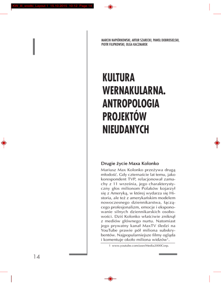 KW_llI_srodki_Layout 1 15.10.2015 10:12 Page 14 MARCIN NAPIÓRKOWSKI, ARTUR SZARECKI, PAWEŁ DOBROSIELSKI, PIOTR FILIPKOWSKI, OLGA KACZMAREK KULTURA WERNAKULARNA. ANTROPOLOGIA PROJEKTÓW NIEUDANYCH Drugie życie Maxa Kolonko Mariusz Max Kolonko przeżywa drugą młodość. Gdy czternaście lat temu, jako korespondent TVP, relacjonował zamachy z 11 września, jego charakterystyczny głos milionom Polaków kojarzył się z Ameryką, w której wydarza się Historia, ale też z amerykańskim modelem nowoczesnego dziennikarstwa, łączącego profesjonalizm, emocje i eksponowanie silnych dziennikarskich osobowości. Dziś Kolonko właściwie zniknął z mediów głównego nurtu. Natomiast jego prywatny kanał MaxTV śledzi na YouTube prawie pół miliona subskrybentów. Najpopularniejsze filmy ogląda i komentuje około miliona widzów1. 1 www.youtube.com/user/Media2000Corp. 14 KW_llI_srodki_Layout 1 15.10.2015 10:12 Page 15 KULTURA WERNAKULARNA. ANTROPOLOGIA PROJEKTÓW NIEUDANYCH Prezentowane w MaxTV filmy są jednym z tych fenomenów, które badaczowi kultury niełatwo jest zaklasyfikować. Z czym właściwie mamy tu do czynienia? Struktura większości zamieszczanych materiałów naśladuje znany z telewizji format infotainment – programu publicystycznego łączącego informację i rozrywkę. W filmach znajdziemy wszystkie elementy charakterystyczne dla gatunku. Każdy odcinek rozpoczynają forszpan prezentujący najważniejsze tematy, czołówka i powitanie prowadzącego. Kolejne newsy przedstawiane są za pomocą komentarza ze studia, plansz informacyjnych i materiałów źródłowych, którym towarzyszy oryginalny dźwięk lub komentarz prowadzącego z offu. Znajoma wydaje się struktura, oprawa graficzna i dźwiękowa, a w pewnym zakresie także treść. Zarazem jednak MaxTV w istotny sposób różni się od programów informacyjnych, na których formacie się opiera. Zamiast profesjonalnie przygotowanego studia dostajemy jego amatorską kopię czy wręcz podróbkę, zrekonstruowaną z dostępnych dla prowadzącego materiałów (monitory, flaga, stojące na półce książki); zamiast profesjonalnego oświetlenia, nagłośnienia i pracy kamery mamy statyczne ujęcie ze słabym dźwiękiem, jakie można uzyskać powszechnie dostępnymi narzędziami. Najważniejsza różnica dotyczy jednak poruszanej w MaxTV tematyki. Kolonko, zgodnie ze swoim hasłem, „mówi jak jest”, obnażając fałsz i drugie dno ukryte za niemal wszystkimi instytucjami, postaciami i zjawiskami głównego nurtu życia społecznego. Podstępne pułapki czekają na nas w arkanach międzynarodowej polityki, telefonach komórkowych i na Facebooku. Kolonko demaskuje je i objaśnia za pomocą niezwykle prostego, zrozumiałego dla każdego odbiorcy zestawu myśli, obrazów i afektów. Tak silne odcięcie się od praktycznie całego systemowo złożonego świata nie mogłoby wydarzyć się w żadnym „prawdziwym” programie telewizyjnym. Chociażby dlatego, że „prawdziwa” telewizja, jako instytucja, w zbyt mocny sposób sama pozostaje zakorzeniona w różnych systemach: ekonomicznym, politycznym, profesjonalizacji obiegów wiedzy... Na poziomie języka, struktury gatunkowej czy materialności wykorzystanych środków mamy tu do czynienia ze specyficznym rodzajem naśladowania. MaxTV udaje coś, czym nie jest. Opiera się na odtworzeniu prostymi środkami fenomenu możliwego jedynie w systemowo złożonej rzeczywistości. Za „prawdziwym” telewizyjnym serwisem informacyjnym stoi wszak wiedza niezliczonych ekspertów, skomplikowany model podziału pracy, znaczny kapitał itd. Z pewnego punktu widzenia Mariusz Max Kolonko jest więc współczesnym bricoleurem – majsterkowiczem, który przy wykorzystaniu dostępnych środków realizuje projekty w sposób alternatywny wobec systemowej wiedzy eksperckiej2. Jednocześnie naśladuje wytwory daleko posuniętej profesjona2 Koncepcja bricolage’u Claude’a Levi-Straussa stanowi jedną z najważniejszych inspiracji dla proponowanego tu rozumienia kultury wernakularnej; por. Claude Levi-Strauss, Myśl nieoswojona, przeł. A. Zajączkowski, Warszawa 2001, s. 26-34. „Bricoleur potrafi wykonać najróżniejsze zadania, jednak w odróżnieniu od inżyniera nie jest uzależniony od surowców i narzędzi obmyślanych i zdobywanych na miarę danego projektu. Świat narzędzi bricoleura jest zamknięty, a regułą gry jest zawsze posługiwanie się środkami będącymi pod ręką, tzn. w każdej chwili skończonym zasobem przedmiotów i materiałów”. 15 KW_llI_srodki_Layout 1 15.10.2015 10:12 Page 16 MARCIN NAPIÓRKOWSKI, ARTUR SZARECKI, PAWEŁ DOBROSIELSKI, PIOTR FILIPKOWSKI, OLGA KACZMAREK lizacji i działa tak, jakby jej nie było. Jego studio przypomina znane antropologom fenomeny kultów cargo, w ramach których mieszkańcy tropikalnych wysp budowali z dostępnych surowców makiety lądowisk, hangarów czy samolotów, licząc na sprowadzenie z nieba transportów cennych towarów. Po co nam jeszcze jedna kategoria? Kultura wernakularna, widziana z oddali, stanowi chaotyczne cmentarzysko nieudanych projektów, odrzuconych idei, szalonych wynalazków – przedmiotów, wyobrażeń i działań nie tyle „spoza głównego nurtu” czy kontestujących jakąś rzeczywistą lub urojoną hegemonię, lecz (z perspektywy „wyobrażonego centrum”3) po prostu nieudolnych, nieudanych czy komicznych. Interesują nas zjawiska które – choć często umykają uwadze – stanowią istotną część współczesnego pejzażu kulturowego. Należą do nich, by wymienić tylko kilka spośród niezwykle zróżnicowanych przykładów: działkowe altanki-samoróbki, teorie spiskowe, demonstracje uliczne, utwory z gatunku fikcji fanowskiej, do niczego niepodobne wywiady etnograficzne, których nie sposób wykorzystać w pracy naukowej, legendy miejskie, amatorsko odtwarzane wnętrza czy kreacje podpatrzone na zdjęciach celebrytów... Pojęcie „kultury wernakularnej” to propozycja na