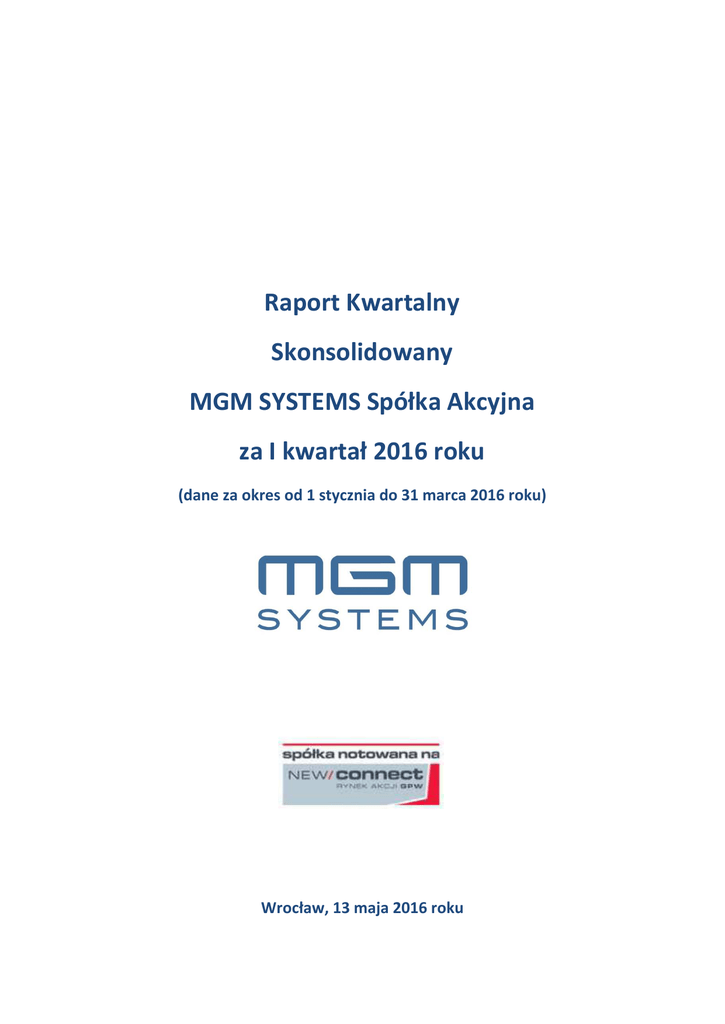Raport Kwartalny Skonsolidowany MGM SYSTEMS Spółka Akcyjna