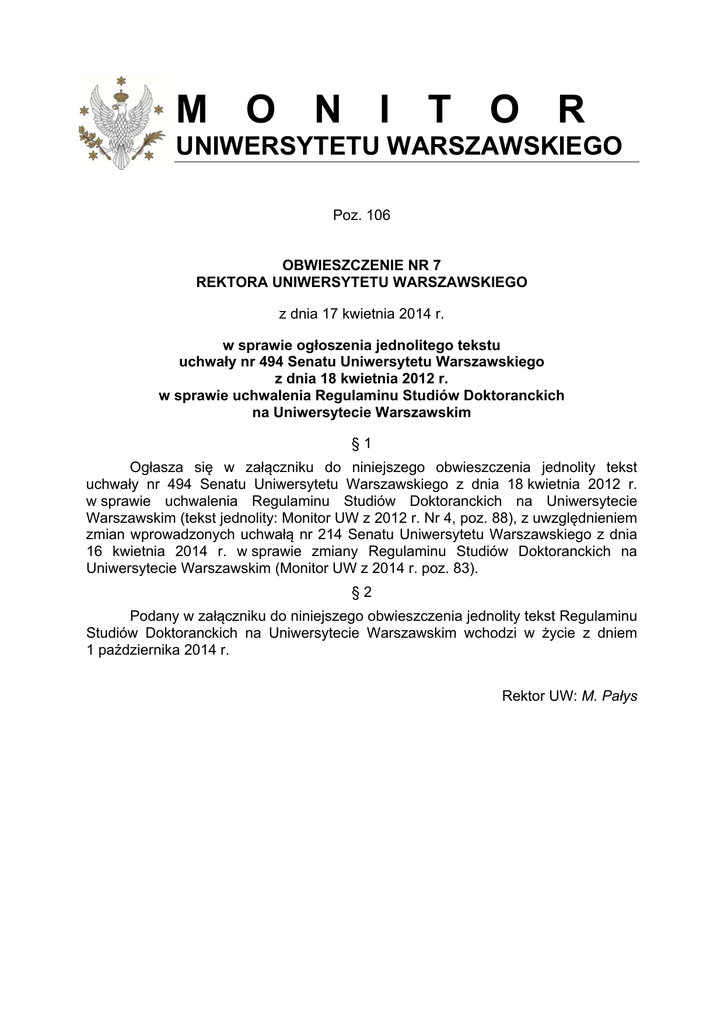 Obwieszczenie nr 7 Rektora UW z dnia 17 kwietnia 2014 r. w