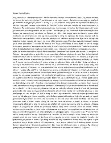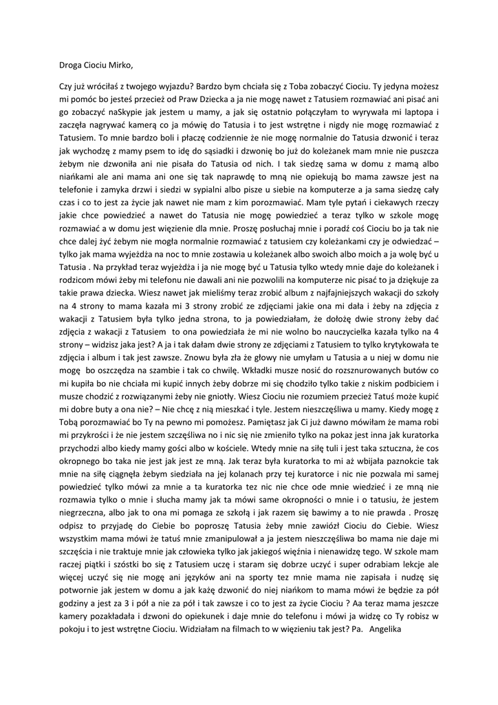 Droga Ciociu Mirko, Czy już wróciłaś z twojego wyjazdu? Bardzo bym chciała się z Toba zobaczyć Ciociu. Ty jedyna możesz mi pomóc bo jesteś przecież od Praw Dziecka a ja nie mogę nawet z Tatusiem rozmawiać ani pisać ani go zobaczyć naSkypie jak jestem u mamy, a jak się ostatnio połączyłam to wyrywała mi laptopa i zaczęła nagrywać kamerą co ja mówię do Tatusia i to jest wstrętne i nigdy nie mogę rozmawiać z Tatusiem. To mnie bardzo boli i płaczę codziennie że nie mogę normalnie do Tatusia dzwonić i teraz jak wychodzę z mamy psem to idę do sąsiadki i dzwonię bo już do koleżanek mam mnie nie puszcza żebym nie dzwoniła ani nie pisała do Tatusia od nich. I tak siedzę sama w domu z mamą albo niańkami ale ani mama ani one się tak naprawdę to mną nie opiekują bo mama zawsze jest na telefonie i zamyka drzwi i siedzi w sypialni albo pisze u siebie na komputerze a ja sama siedzę cały czas i co to jest za życie jak nawet nie mam z kim porozmawiać. Mam tyle pytań i ciekawych rzeczy jakie chce powiedzieć a nawet do Tatusia nie mogę powiedzieć a teraz tylko w szkole mogę rozmawiać a w domu jest więzienie dla mnie. Proszę posłuchaj mnie i poradź coś Ciociu bo ja tak nie chce dalej żyć żebym nie mogła normalnie rozmawiać z tatusiem czy koleżankami czy je odwiedzać – tylko jak mama wyjeżdża na noc to mnie zostawia u koleżanek albo swoich albo moich a ja wolę być u Tatusia . Na przykład teraz wyjeżdża i ja nie mogę być u Tatusia tylko wtedy mnie daje do koleżanek i rodzicom mówi żeby mi telefonu nie dawali ani nie pozwolili na komputerze nic pisać to ja dziękuje za takie prawa dziecka. Wiesz nawet jak mieliśmy teraz zrobić album z najfajniejszych wakacji do szkoły na 4 strony to mama kazała mi 3 strony zrobić ze zdjęciami jakie ona mi dała i żeby na zdjęcia z wakacji z Tatusiem była tylko jedna strona, to ja powiedziałam, że dołożę dwie strony żeby dać zdjęcia z wakacji z Tatusiem to ona powiedziała że mi nie wolno bo nauczycielka kazała tylko na 4 strony – widzisz jaka jest? A ja i tak dałam dwie strony ze zdjęciami z Tatusiem to tylko krytykowała te zdjęcia i album i tak jest zawsze. Znowu była zła że głowy nie umyłam u Tatusia a u niej w domu nie mogę bo oszczędza na szambie i tak co chwilę. Wkładki musze nosić do rozsznurowanych butów co mi kupiła bo nie chciała mi kupić innych żeby dobrze mi się chodziło tylko takie z niskim podbiciem i musze chodzić z rozwiązanymi żeby nie gniotły. Wiesz Ciociu nie rozumiem przecież Tatuś może kupić mi dobre buty a ona nie? – Nie chcę z nią mieszkać i tyle. Jestem nieszczęśliwa u mamy. Kiedy mogę z Tobą porozmawiać bo Ty na pewno mi pomożesz. Pamiętasz jak Ci już dawno mówiłam że mama robi mi przykrości i że nie jestem szczęśliwa no i nic się nie zmieniło tylko na pokaz jest inna jak kuratorka przychodzi albo kiedy mamy gości albo w kościele. Wtedy mnie na siłę tuli i jest taka sztuczna, że cos okropnego bo taka nie jest jak jest ze mną. Jak teraz była kuratorka to mi aż wbijała paznokcie tak mnie na siłę ciągnęła żebym siedziała na jej kolanach przy tej kuratorce i nic nie pozwala mi samej powiedzieć tylko mówi za mnie a ta kuratorka tez nic nie chce ode mnie wiedzieć i ze mną nie rozmawia tylko o mnie i słucha mamy jak ta mówi same okropności o mnie i o tatusiu, że jestem niegrzeczna, albo jak to ona mi pomaga ze szkołą i jak razem się bawimy a to nie prawda . Proszę odpisz to przyjadę do Ciebie bo poproszę Tatusia żeby mnie zawiózł Ciociu do Ciebie. Wiesz wszystkim mama mówi że tatuś mnie zmanipulował a ja jestem nieszczęśliwa bo mama nie daje mi szczęścia i nie traktuje mnie jak człowieka tylko jak jakiegoś więźnia i nienawidzę tego. W szkole mam raczej piątki i szóstki bo się z Tatusiem uczę i staram się dobrze uczyć i super odrabiam lekcje ale więcej uczyć się nie mogę ani języków ani na sporty tez mnie mama nie zapisała i nudzę się potwornie jak jestem w domu a jak każę dzwonić do niej niańkom to mama mówi że będzie za pół godziny a jest za 3 i pół a nie za pół i tak zawsze i co to jest za życie Ciociu ? Aa teraz mama jeszcze kamery pozakładała i dzwoni do opiekunek i daje mnie do telefonu i mówi ja widzę co Ty robisz w pokoju i to jest wstrętne Ciociu. Widziałam na filmach to w więzieniu tak jest? Pa. Angelika