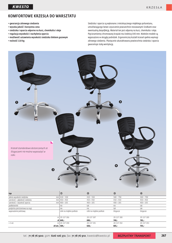 KRZESŁA KOMFORTOWE KRZESŁA DO WARSZTATU •gwarancja zdrowego siedzenia •wysoka jakość i korzystna cena •siedziska i oparcia odporne na kurz, chemikalia i oleje •regulacja wysokości i nachylenia oparcia •możliwość ustawienia wysokości siedziska tłokiem gazowym •nośność 110 kg Siedziska i oparcia są wykonane z nietoksycznego miękkiego poliuretanu, umożliwiającego łatwe czyszczenie powszechnie stosowanymi środkami oraz ewentualną dezynfekcję. Materiał ten jest odporny na kurz, chemikalia i oleje. Pięcioramienny chromowany krzyżak ma średnicę 640 mm. Niektóre modele są wyposażone w okrągły podnóżek. Ergonomiczny kształt krzeseł spełnia wymogi zdrowego siedzenia. Plastycznie ukształtowana powierzchnia siedziska i oparcia gwarantuje stałą wentylację. ➋ ➊ Krzeseł standardowo dostarczanych ze ślizgaczami nie można wyposażyć w rolki. ➍ ➌ ➀ typ zakres wysokości siedziska szerokość × głębokość siedziska szerokość × wysokość oparcia podłokietniki podpórka pierścieniowa na nogi wyposażenie podstawy ≥ 3 szt. mm 430 – 550 mm 450 × 450 mm 400 × 305 nie nie rolki na miękkie podłoże nr zł nr zł/szt. 2D 337 386 649,2D 337 390 584,- ➁ ➂ ➃ 430 – 550 450 × 450 400 × 305 tak nie rolki na miękkie podłoże 500 – 790 450 × 450 400 × 305 nie tak ślizgacze 500 – 790 450 × 450 400 × 305 tak tak ślizgacze 2D 337 387 690,2D 337 391 620,- 2D 337 388 740,2D 337 392 665,- 2D 337 389 781,2D 337 393 703,- tel.: 71 78 76 900, gsm: 606 106 372, fax: 71 78 76 910, [email protected] BEZPŁATNY TRANSPORT 267
