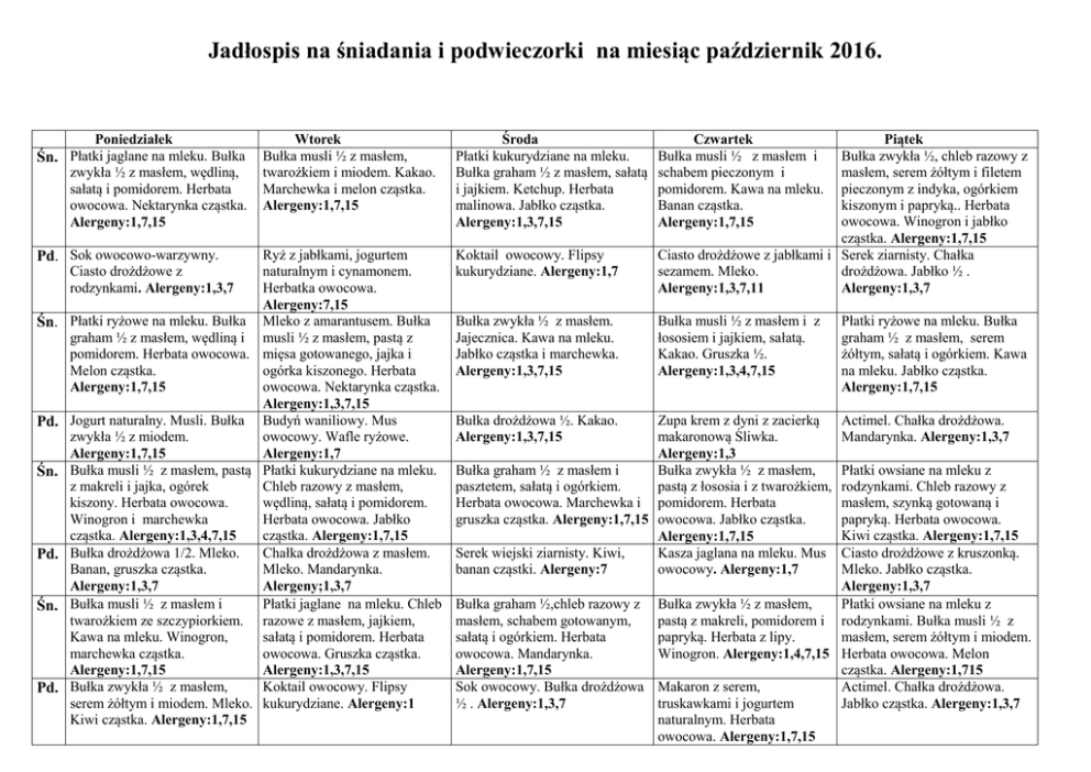Jadłospis na śniadania i podwieczorki na miesiąc październik 2016. Poniedziałek Płatki jaglane na mleku. Bułka Śn. zwykła ½ z masłem, wędliną, sałatą i pomidorem. Herbata owocowa. Nektarynka cząstka. Alergeny:1,7,15 Wtorek Bułka musli ½ z masłem, twarożkiem i miodem. Kakao. Marchewka i melon cząstka. Alergeny:1,7,15 Ryż z jabłkami, jogurtem naturalnym i cynamonem. Herbatka owocowa. Alergeny:7,15 Płatki ryżowe na mleku. Bułka Mleko z amarantusem. Bułka Śn. graham ½ z masłem, wędliną i musli ½ z masłem, pastą z pomidorem. Herbata owocowa. mięsa gotowanego, jajka i Melon cząstka. ogórka kiszonego. Herbata owocowa. Nektarynka cząstka. Alergeny:1,7,15 Alergeny:1,3,7,15 Jogurt naturalny. Musli. Bułka Budyń waniliowy. Mus Pd. zwykła ½ z miodem. owocowy. Wafle ryżowe. Alergeny:1,7,15 Alergeny:1,7 Śn. Bułka musli ½ z masłem, pastą Płatki kukurydziane na mleku. z makreli i jajka, ogórek Chleb razowy z masłem, kiszony. Herbata owocowa. wędliną, sałatą i pomidorem. Winogron i marchewka Herbata owocowa. Jabłko cząstka. Alergeny:1,3,4,7,15 cząstka. Alergeny:1,7,15 Pd. Bułka drożdżowa 1/2. Mleko. Chałka drożdżowa z masłem. Banan, gruszka cząstka. Mleko. Mandarynka. Alergeny:1,3,7 Alergeny;1,3,7 Płatki jaglane na mleku. Chleb Śn. Bułka musli ½ z masłem i twarożkiem ze szczypiorkiem. razowe z masłem, jajkiem, Kawa na mleku. Winogron, sałatą i pomidorem. Herbata marchewka cząstka. owocowa. Gruszka cząstka. Alergeny:1,7,15 Alergeny:1,3,7,15 Koktail owocowy. Flipsy Pd. Bułka zwykła ½ z masłem, serem żółtym i miodem. Mleko. kukurydziane. Alergeny:1 Kiwi cząstka. Alergeny:1,7,15 Pd. Sok owocowo-warzywny. Ciasto drożdżowe z rodzynkami. Alergeny:1,3,7 Środa Płatki kukurydziane na mleku. Bułka graham ½ z masłem, sałatą i jajkiem. Ketchup. Herbata malinowa. Jabłko cząstka. Alergeny:1,3,7,15 Koktail owocowy. Flipsy kukurydziane. Alergeny:1,7 Bułka zwykła ½ z masłem. Jajecznica. Kawa na mleku. Jabłko cząstka i marchewka. Alergeny:1,3,7,15 Bułka drożdżowa ½. Kakao. Alergeny:1,3,7,15 Piątek Bułka zwykła ½, chleb razowy z masłem, serem żółtym i filetem pieczonym z indyka, ogórkiem kiszonym i papryką.. Herbata owocowa. Winogron i jabłko cząstka. Alergeny:1,7,15 Ciasto drożdżowe z jabłkami i Serek ziarnisty. Chałka sezamem. Mleko. drożdżowa. Jabłko ½ . Alergeny:1,3,7,11 Alergeny:1,3,7 Czwartek Bułka musli ½ z masłem i schabem pieczonym i pomidorem. Kawa na mleku. Banan cząstka. Alergeny:1,7,15 Bułka musli ½ z masłem i z łososiem i jajkiem, sałatą. Kakao. Gruszka ½. Alergeny:1,3,4,7,15 Zupa krem z dyni z zacierką makaronową Śliwka. Alergeny:1,3 Bułka graham ½ z masłem i Bułka zwykła ½ z masłem, pasztetem, sałatą i ogórkiem. pastą z łososia i z twarożkiem, Herbata owocowa. Marchewka i pomidorem. Herbata gruszka cząstka. Alergeny:1,7,15 owocowa. Jabłko cząstka. Alergeny:1,7,15 Serek wiejski ziarnisty. Kiwi, Kasza jaglana na mleku. Mus banan cząstki. Alergeny:7 owocowy. Alergeny:1,7 Płatki ryżowe na mleku. Bułka graham ½ z masłem, serem żółtym, sałatą i ogórkiem. Kawa na mleku. Jabłko cząstka. Alergeny:1,7,15 Actimel. Chałka drożdżowa. Mandarynka. Alergeny:1,3,7 Płatki owsiane na mleku z rodzynkami. Chleb razowy z masłem, szynką gotowaną i papryką. Herbata owocowa. Kiwi cząstka. Alergeny:1,7,15 Ciasto drożdżowe z kruszonką. Mleko. Jabłko cząstka. Alergeny:1,3,7 Bułka graham ½,chleb razowy z Bułka zwykła ½ z masłem, Płatki owsiane na mleku z masłem, schabem gotowanym, pastą z makreli, pomidorem i rodzynkami. Bułka musli ½ z sałatą i ogórkiem. Herbata papryką. Herbata z lipy. masłem, serem żółtym i miodem. owocowa. Mandarynka. Winogron. Alergeny:1,4,7,15 Herbata owocowa. Melon cząstka. Alergeny:1,715 Alergeny:1,7,15 Sok owocowy. Bułka drożdżowa Makaron z serem, Actimel. Chałka drożdżowa. ½ . Alergeny:1,3,7 truskawkami i jogurtem Jabłko cząstka. Alergeny:1,3,7 naturalnym. Herbata owocowa. Alergeny:1,7,15 Śn. Bułka graham ½,chleb razowy z masłem, wędliną i ogórkiem. Herbata z mięty. Marchewka, jabłko cząstka. Alergeny:1,7,15 Pd. Bułka zwykła ½ z masłem, serem żółtym i miodem. Mleko. Mandarynka. Alergeny;1,7,15 Dyrektor szkoły............................. Kierownik stołówki............................ Szef kuchni..........................