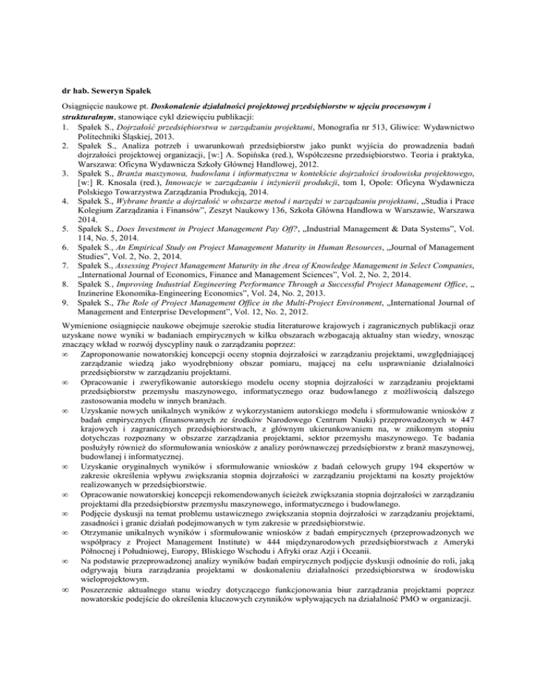 dr hab. Seweryn Spałek Osiągnięcie naukowe pt. Doskonalenie działalności projektowej przedsiębiorstw w ujęciu procesowym i strukturalnym, stanowiące cykl dziewięciu publikacji: 1. Spałek S., Dojrzałość przedsiębiorstwa w zarządzaniu projektami, Monografia nr 513, Gliwice: Wydawnictwo Politechniki Śląskiej, 2013. 2. Spałek S., Analiza potrzeb i uwarunkowań przedsiębiorstw jako punkt wyjścia do prowadzenia badań dojrzałości projektowej organizacji, [w:] A. Sopińska (red.), Współczesne przedsiębiorstwo. Teoria i praktyka, Warszawa: Oficyna Wydawnicza Szkoły Głównej Handlowej, 2012. 3. Spałek S., Branża maszynowa, budowlana i informatyczna w kontekście dojrzałości środowiska projektowego, [w:] R. Knosala (red.), Innowacje w zarządzaniu i inżynierii produkcji, tom I, Opole: Oficyna Wydawnicza Polskiego Towarzystwa Zarządzania Produkcją, 2014. 4. Spałek S., Wybrane branże a dojrzałość w obszarze metod i narzędzi w zarządzaniu projektami, „Studia i Prace Kolegium Zarządzania i Finansów”, Zeszyt Naukowy 136, Szkoła Główna Handlowa w Warszawie, Warszawa 2014. 5. Spałek S., Does Investment in Project Management Pay Off?, „Industrial Management & Data Systems”, Vol. 114, No. 5, 2014. 6. Spałek S., An Empirical Study on Project Management Maturity in Human Resources, „Journal of Management Studies”, Vol. 2, No. 2, 2014. 7. Spałek S., Assessing Project Management Maturity in the Area of Knowledge Management in Select Companies, „International Journal of Economics, Finance and Management Sciences”, Vol. 2, No. 2, 2014. 8. Spałek S., Improving Industrial Engineering Performance Through a Successful Project Management Office, „ Inzinerine Ekonomika-Engineering Economics”, Vol. 24, No. 2, 2013. 9. Spałek S., The Role of Project Management Office in the Multi-Project Environment, „International Journal of Management and Enterprise Development”, Vol. 12, No. 2, 2012. Wymienione osiągnięcie naukowe obejmuje szerokie studia literaturowe krajowych i zagranicznych publikacji oraz uzyskane nowe wyniki w badaniach empirycznych w kilku obszarach wzbogacają aktualny stan wiedzy, wnosząc znaczący wkład w rozwój dyscypliny nauk o zarządzaniu poprzez: • Zaproponowanie nowatorskiej koncepcji oceny stopnia dojrzałości w zarządzaniu projektami, uwzględniającej zarządzanie wiedzą jako wyodrębniony obszar pomiaru, mającej na celu usprawnianie działalności przedsiębiorstw w zarządzaniu projektami. • Opracowanie i zweryfikowanie autorskiego modelu oceny stopnia dojrzałości w zarządzaniu projektami przedsiębiorstw przemysłu maszynowego, informatycznego oraz budowlanego z możliwością dalszego zastosowania modelu w innych branżach. • Uzyskanie nowych unikalnych wyników z wykorzystaniem autorskiego modelu i sformułowanie wniosków z badań empirycznych (finansowanych ze środków Narodowego Centrum Nauki) przeprowadzonych w 447 krajowych i zagranicznych przedsiębiorstwach, z głównym ukierunkowaniem na, w znikomym stopniu dotychczas rozpoznany w obszarze zarządzania projektami, sektor przemysłu maszynowego. Te badania posłużyły również do sformułowania wniosków z analizy porównawczej przedsiębiorstw z branż maszynowej, budowlanej i informatycznej. • Uzyskanie oryginalnych wyników i sformułowanie wniosków z badań celowych grupy 194 ekspertów w zakresie określenia wpływu zwiększania stopnia dojrzałości w zarządzaniu projektami na koszty projektów realizowanych w przedsiębiorstwie. • Opracowanie nowatorskiej koncepcji rekomendowanych ścieżek zwiększania stopnia dojrzałości w zarządzaniu projektami dla przedsiębiorstw przemysłu maszynowego, informatycznego i budowlanego. • Podjęcie dyskusji na temat problemu ustawicznego zwiększania stopnia dojrzałości w zarządzaniu projektami, zasadności i granic działań podejmowanych w tym zakresie w przedsiębiorstwie. • Otrzymanie unikalnych wyników i sformułowanie wniosków z badań empirycznych (przeprowadzonych we współpracy z Project Management Institute) w 444 międzynarodowych przedsiębiorstwach z Ameryki Północnej i Południowej, Europy, Bliskiego Wschodu i Afryki oraz Azji i Oceanii. • Na podstawie przeprowadzonej analizy wyników badań empirycznych podjęcie dyskusji odnośnie do roli, jaką odgrywają biura zarządzania projektami w doskonaleniu działalności przedsiębiorstwa w środowisku wieloprojektowym. • Poszerzenie aktualnego stanu wiedzy dotyczącego funkcjonowania biur zarządzania projektami poprzez nowatorskie podejście do określenia kluczowych czynników wpływających na działalność PMO w organizacji.