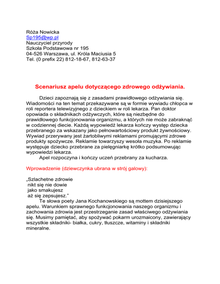 Róża Nowicka [email protected] Nauczyciel przyrody Szkoła Podstawowa nr 195 04-526 Warszawa, ul. Króla Maciusia 5 Tel. (0 prefix 22) 812-18-67, 812-63-37 Scenariusz apelu dotyczącego zdrowego odżywiania. Dzieci zapoznają się z zasadami prawidłowego odżywiania się. Wiadomości na ten temat przekazywane są w formie wywiadu chłopca w roli reportera telewizyjnego z dzieckiem w roli lekarza. Pan doktor opowiada o składnikach odżywczych, które są niezbędne do prawidłowego funkcjonowania organizmu, a których nie może zabraknąć w codziennej diecie. Każdą wypowiedź lekarza kończy występ dziecka przebranego za wskazany jako pełnowartościowy produkt żywnościowy. Wywiad przerywany jest żartobliwymi reklamami promującymi zdrowe produkty spożywcze. Reklamie towarzyszy wesoła muzyka. Po reklamie występuje dziecko przebrane za pielęgniarkę krótko podsumowując wypowiedzi lekarza. Apel rozpoczyna i kończy uczeń przebrany za kucharza. Wprowadzenie (dziewczynka ubrana w strój galowy): „Szlachetne zdrowie nikt się nie dowie jako smakujesz aż się zepsujesz.” Te słowa poety Jana Kochanowskiego są mottem dzisiejszego apelu. Warunkiem sprawnego funkcjonowania naszego organizmu i zachowania zdrowia jest przestrzeganie zasad właściwego odżywiania się. Musimy pamiętać, aby spożywać pokarm urozmaicony, zawierający wszystkie składniki- białka, cukry, tłuszcze, witaminy i składniki mineralne. Cała grupa występujących przy akompaniamencie pianina śpiewa piosenkę z kabaretu „Z tyłu sklepu” „Bo my musimy być silni i zdrowi Choćby na skrobi, choćby na skrobi, Bo my musimy być dziś mniej pazerni - roślinożerni, roślinożerni. Nam polędwica oraz schab nie smakuje tak jak szczaw.” Wiersz „Odżywianie” (recytuje uczeń przebrany za grubego kucharza) Twój brzuch - twoje ciało to wielki piec, co węgla niemało pożera. Masz jedz! Ten węgiel to bułki, kanapki kotlety, to ptysie i rurki, z wanilią omlety. To wszystko codziennie wędruje w głąb brzucha i staje się węglem, co krzepi w nas ducha. Zanim jednak wszystko zjesz, pomyśl najpierw- chyba wiesz! jeśli tego nie uczynisz, niech dzisiejsza lekcja przypomni ci, że chory chodzić będziesz ty! Prowadzący (uczeń przebrany za fotoreportera): Dzień dobry panie doktorze. Chciałabym, aby w dzisiejszym wywiadzie wyjaśnił nam pan zasady zdrowego odżywiania. Lekarz: Organizm człowieka, aby żyć musi otrzymywać pokarm. Z pokarmu wytwarzana jest energia, którą zużywamy na ruch, myślenie i pracę organów wewnętrznych, dzięki niej rośniemy. Im większy wysiłek fizyczny czy umysłowy wykonujemy, tym więcej zużywamy energii. Dlatego ważne jest prawidłowe odżywianie się. Spożywany przez nas pokarm pochodzenia roślinnego i zwierzęcego powinien dostarczać naszemu organizmowi: białek, cukrów, tłuszczów, witamin i składników mineralnych. Nieprzemyślany sposób odżywiania może niekorzystnie wpływać na stan zdrowia. Zarówno zbyt obfite jak i źle skomponowane posiłki mogą prowadzić do otyłości, zwiększać ryzyko zachorowania na dusznicę, chorobę wieńcową serca, cukrzycę czy zapalenie stawów. Szczególnie powinno się to uświadomić dzieciom, które spożywają posiłki poza domem w restauracjach typu Fast Food zadawalając się hamburgerem z frytkami i coca-colą. Dania takie nie gwarantują zachowania dobrego stanu zdrowia - dostarczają za mało witaminy A, C, D i E oraz składników mineralnych i błonnika. Prowadzący: Wrócimy do rozmowy po przerwie. Zostańcie z nami. Zapraszamy do reklamy. REKLAMA-2 osoby (jedna ma szarą, niezdrową twarz, druga z koszykiem zdrowych produktów) O rety! Szare komórki masz przyćmione! Tylko przez zdrowe odżywianie możesz mieć rozjaśnione. Pielęgniarka: Pamiętaj - Spożywaj codziennie produkty zawierające wszystkie składniki: białka, cukry, tłuszcze, witaminy i składniki mineralne. Prowadzący: Panie doktorze, proszę wyjaśnić nam, co to są białka. Mówi się, że są one podstawą życia na Ziemi. Lekarz: Ciało każdego organizmu ziemskiego zawiera bardzo dużo białka. Jeśli sobie wyobrazić, że żywy organizm to dom zbudowany z cegiełek, to każda taka cegiełka zawiera białko. Nasz organizm tworzy wiele rodzajów białek. Część z nich jest materiałem budującym, inne pomagają w spełnieniu funkcji życiowych. Duże ilości białka zawierają następujące produkty: pieczywo, drób, mięso ryby, jaja, sery, orzechy, fasola, groch, ziemniaki. Młody mężczyzna potrzebuje średnio około 55 g białka dziennie. Można je uzyskać z 250 g porcji chudego pieczonego kurczaka. Kurczak: Jestem dobrym źródłem białka budującego tkanki, witamin z grupy B utrzymujących w zdrowiu system nerwowy oraz niewielką ilość cynku. Zawieram tłuszcz nie podwyższający poziom cholesterolu we krwi. Moja wątróbka to doskonałe źródło prowitaminy A, potrzebnej do utrzymania zdrowej skóry oraz zabezpieczenia przed infekcjami. REKLAMA (trzy osoby: babcia, dziadek, lektor, babcia z dziadkiem tańczą) Babcia się nie sypie, Dziadek pełen werwy, Już wiem skąd to wszystko - Kurczaki, indyki i gęsi jadają bez przerwy. Pielęgniarka: PAMIĘTAJ - pieczywo, drób, mięso ryby, jaja, sery, orzechy, fasola, groch, ziemniaki - to źródło potrzebnego Ci białka. Prowadzący: Panie doktorze od lat toczy się dyskusja na temat czy tłuszcze są szkodliwe czy niezbędne dla organizmu. Jakie jest pana zdanie w tej sprawie? Lekarz: Spożywanie zbyt dużej ilości tłuszczu może zaszkodzić, jednak całkowite ich wykluczenie z jadłospisu pozbawia organizm ważnych składników odżywczych. Niektóre tłuszcze niezbędne są do prawidłowego wzrostu, prawidłowego rozwoju oraz regulowania przemiany materii u dzieci. Tłuszcze pochodzące z ryb, olejów roślinnych są źródłem rozpuszczalnych w nich witamin A, D, E, K oraz są potrzebne w procesie przyswajania tych witamin przez organizm. Radz