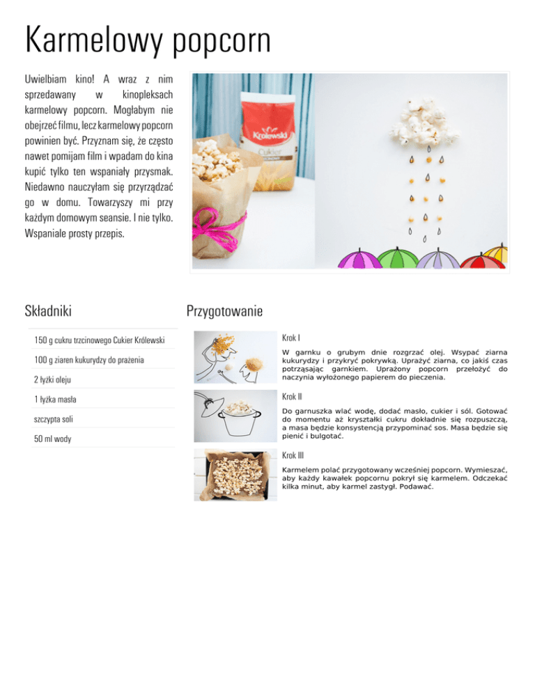 Powered by TCPDF (www.tcpdf.org) Karmelowy popcorn Uwielbiam kino! A wraz z nim sprzedawany w kinopleksach karmelowy popcorn. Mogłabym nie obejrzeć filmu,leczkarmelowypopcorn powinien być. Przyznam się, że często nawet pomijam film i wpadam do kina kupić tylko ten wspaniały przysmak. Niedawno nauczyłam się przyrządzać go w domu. Towarzyszy mi przy każdym domowym seansie. I nie tylko. Wspaniale prosty przepis. Składniki 150 g cukru trzcinowego Cukier Królewski 100 g ziaren kukurydzy do prażenia 2 łyżki oleju 1 łyżka masła szczypta soli 50 ml wody Przygotowanie Krok I W garnku o grubym dnie rozgrzać olej. Wsypać ziarna kukurydzy i przykryć pokrywką. Uprażyć ziarna, co jakiś czas potrząsając garnkiem. Uprażony popcorn przełożyć do naczynia wyłożonego papierem do pieczenia. Krok II Do garnuszka wlać wodę, dodać masło, cukier i sól. Gotować do momentu aż kryształki cukru dokładnie się rozpuszczą, a masa będzie konsystencją przypominać sos. Masa będzie się pienić i bulgotać. Krok III Karmelem polać przygotowany wcześniej popcorn. Wymieszać, aby każdy kawałek popcornu pokrył się karmelem. Odczekać kilka minut, aby karmel zastygł. Podawać.