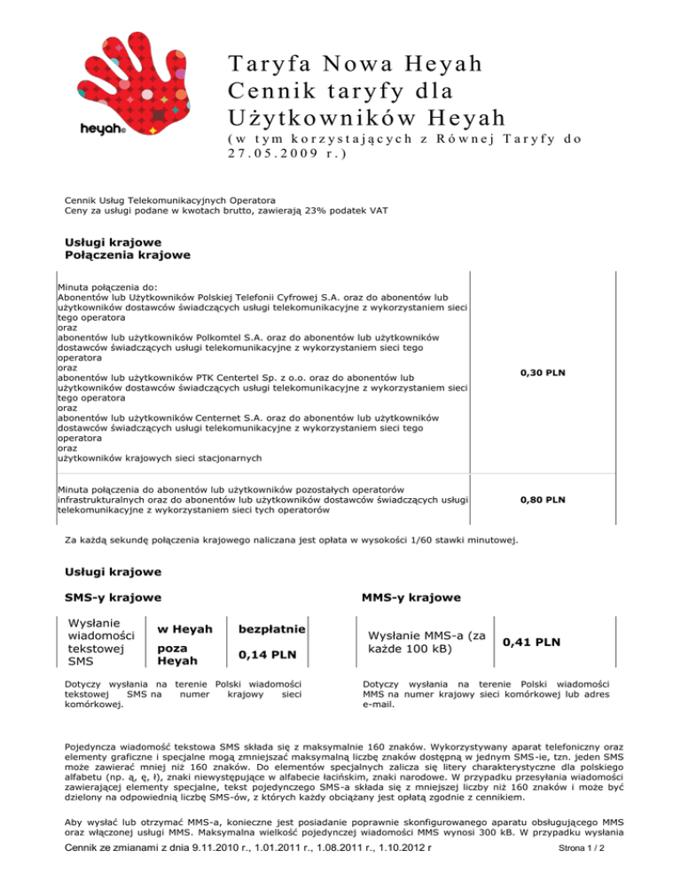 Taryfa Nowa Heyah Cennik taryfy dla Użytkowników Heyah (w t ym ko rzyst ających z Ró wnej Taryfy do 27.05.2009 r.) Cennik Usług Telekomunikacyjnych Operatora Ceny za usługi podane w kwotach brutto, zawierają 23% podatek VAT Usługi krajowe Połączenia krajowe Minuta połączenia do: Abonentów lub Użytkowników Polskiej Telefonii Cyfrowej S.A. oraz do abonentów lub użytkowników dostawców świadczących usługi telekomunikacyjne z wykorzystaniem sieci tego operatora oraz abonentów lub użytkowników Polkomtel S.A. oraz do abonentów lub użytkowników dostawców świadczących usługi telekomunikacyjne z wykorzystaniem sieci tego operatora oraz abonentów lub użytkowników PTK Centertel Sp. z o.o. oraz do abonentów lub użytkowników dostawców świadczących usługi telekomunikacyjne z wykorzystaniem sieci tego operatora oraz abonentów lub użytkowników Centernet S.A. oraz do abonentów lub użytkowników dostawców świadczących usługi telekomunikacyjne z wykorzystaniem sieci tego operatora oraz użytkowników krajowych sieci stacjonarnych 0,30 PLN Minuta połączenia do abonentów lub użytkowników pozostałych operatorów infrastrukturalnych oraz do abonentów lub użytkowników dostawców świadczących usługi telekomunikacyjne z wykorzystaniem sieci tych operatorów 0,80 PLN Za każdą sekundę połączenia krajowego naliczana jest opłata w wysokości 1/60 stawki minutowej. Usługi krajowe SMS-y krajowe Wysłanie wiadomości tekstowej SMS MMS-y krajowe w Heyah bezpłatnie poza Heyah 0,14 PLN Dotyczy wysłania na terenie Polski wiadomości tekstowej SMS na numer krajowy sieci komórkowej. Wysłanie MMS-a (za każde 100 kB) 0,41 PLN Dotyczy wysłania na terenie Polski wiadomości MMS na numer krajowy sieci komórkowej lub adres e-mail. Pojedyncza wiadomość tekstowa SMS składa się z maksymalnie 160 znaków. Wykorzystywany aparat telefoniczny oraz elementy graficzne i specjalne mogą zmniejszać maksymalną liczbę znaków dostępną w jednym SMS-ie, tzn. jeden SMS może zawierać mniej niż 160 znaków. Do elementów specjalnych zalicza się litery charakterystyczne dla polskiego alfabetu (np. ą, ę, ł), znaki niewystępujące w alfabecie łacińskim, znaki narodowe. W przypadku przesyłania wiadomości zawierającej elementy specjalne, tekst pojedynczego SMS-a składa się z mniejszej liczby niż 160 znaków i może być dzielony na odpowiednią liczbę SMS-ów, z których każdy obciążany jest opłatą zgodnie z cennikiem. Aby wysłać lub otrzymać MMS-a, konieczne jest posiadanie poprawnie skonfigurowanego aparatu obsługującego MMS oraz włączonej usługi MMS. Maksymalna wielkość pojedynczej wiadomości MMS wynosi 300 kB. W przypadku wysłania Cennik ze zmianami z dnia 9.11.2010 r., 1.01.2011 r., 1.08.2011 r., 1.10.2012 r Strona 1 / 2 MMS-a w kraju o wielkości powyżej 100 kB zostanie pobrana opłata stanowiąca odpowiednią wielokrotność opłaty cennikowej. Opłaty za wysłanie wiadomości SMS lub MMS naliczane są niezależnie od tego, czy numer telefonu lub adres odbiorcy wiadomości oraz numer Centrum w przypadku SMS-ów (+48 602 951 111) zostały wpisane poprawnie. Jeśli Odbiorca nie odbierze wiadomości SMS lub MMS, będzie ona przechowywana przez czas, który nadawca określił jako termin jej ważności - maksymalnie 7 dni. Po tym terminie zostanie ona automatycznie wykasowana. Szczegółowe warunki korzystania z usług MMS dostępne są na www.heyah.pl Pakietowa transmisja danych na terenie kraju (APN: heyah.pl lub inny APN udostępniony przez Operatora przeznaczony do połączeń z Internetem ogólnego użytku) Opłata za 100 kB 0,02 PLN Opłata jest pobierana za każde rozpoczęte 3000 kB pakietowej transmisji danych. Po zakończeniu sesji pakietowej transmisji danych różnica miedzy pobraną kwotą za każde rozpoczęte 3000 kB a kwotą należną za pakietową transmisję danych zostaje niezwłocznie zwrócona na konto klienta. Zwrot kwoty może nastąpić w terminie maksymalnie 24h. Opłata 100 kB, naliczana jest łącznie za dane wysłane i odebrane na poziomie protokołu internetowego (IP); 1kB= 1024B; 1MB=1024kB. Po zakończeniu połączenia lub o godz. 24.00 dane są zaokrąglane w górę, do pełnej jednostki taryfikacyjnej. Warunkiem korzystania z usługi jest posiadanie stanu konta na kwotę co najmniej 0,60 PLN dla każdego połączenia oraz posiadanie skonfigurowanego aparatu umożliwiającego Pakietową transmisję danych oraz aktywnej usługi pakietowej transmisji danych. Szczegółowe warunki korzystania z usługi dostępne są na www.heyah.pl Biuro Obsługi Użytkownika *2222 lub 888 00 2222 1,00 PLN za minutę połączenia krajowego Uzupełnienie konta wysłanie Ekspresowego kodu Heyah *109*14-cyfrowy kod uzupełniający# bezpłatne Objaśnienia Tabela główna - Usługi krajowe - Połączenia krajowe Postanowień cennika, które określają stawkę 0,30 PLN za minutę połączenia do abonentów lub użytkowników dostawców świadczących usługi telekomunikacyjne z wykorzystaniem sieci Polskiej Telefonii Cyfrowej S.A., Polkomtel S.A., PTK Centertel Sp. z o.o. lub Centernet S.A., nie należy traktować jako zapewnienia stosowania tej stawki do dostawców usług telekomunikacyjnych, którzy rozpoczną działalność w przyszłości. W przypadku rozszerzenia zakresu usług świadczonych przez Polską Telefonię Cyfrową S.A. o połączenia do abonentów i użytkowników nowego dostawcy świadczącego usługi telekomunikacyjne z wykorzystaniem sieci Polskiej Telefonii Cyfrowej S.A., Polkomtel S.A., PTK Centertel Sp. z o.o. lub Centernet S.A., których cena za minutę będzie inna niż 0,30 PLN, cennik zostanie uzupełniony o informację dotyczącą ceny. Operatorzy infrastrukturalni – operatorzy ruchomych sieci telefonicznych (MNO), czyli przedsiębiorcy telekomunikacyjni posiadający własną infrastrukturę tworzącą publiczną ruchomą sieć telefoniczną, którzy wdrożyli umowę o połączeniu sieci telekomun